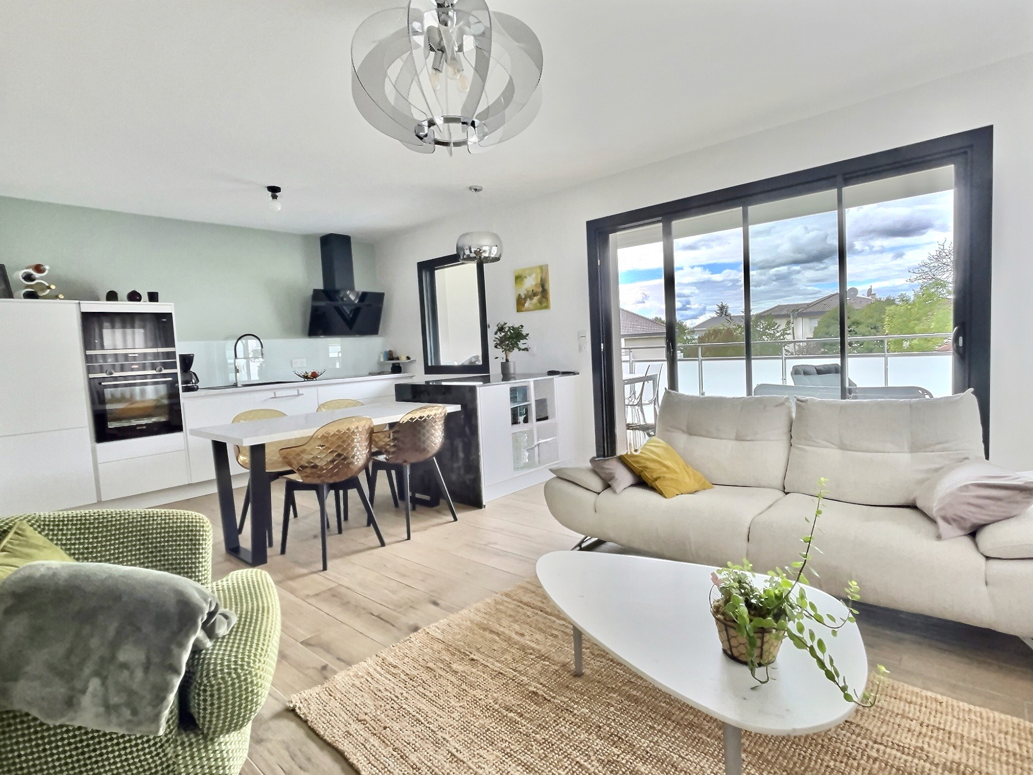 Vous profiterez d’un séjour avec cuisine ouverte, baigné de lumière grâce aux larges baies vitrées, donnant sur une spacieuse terrasse exposée sud-ouest.