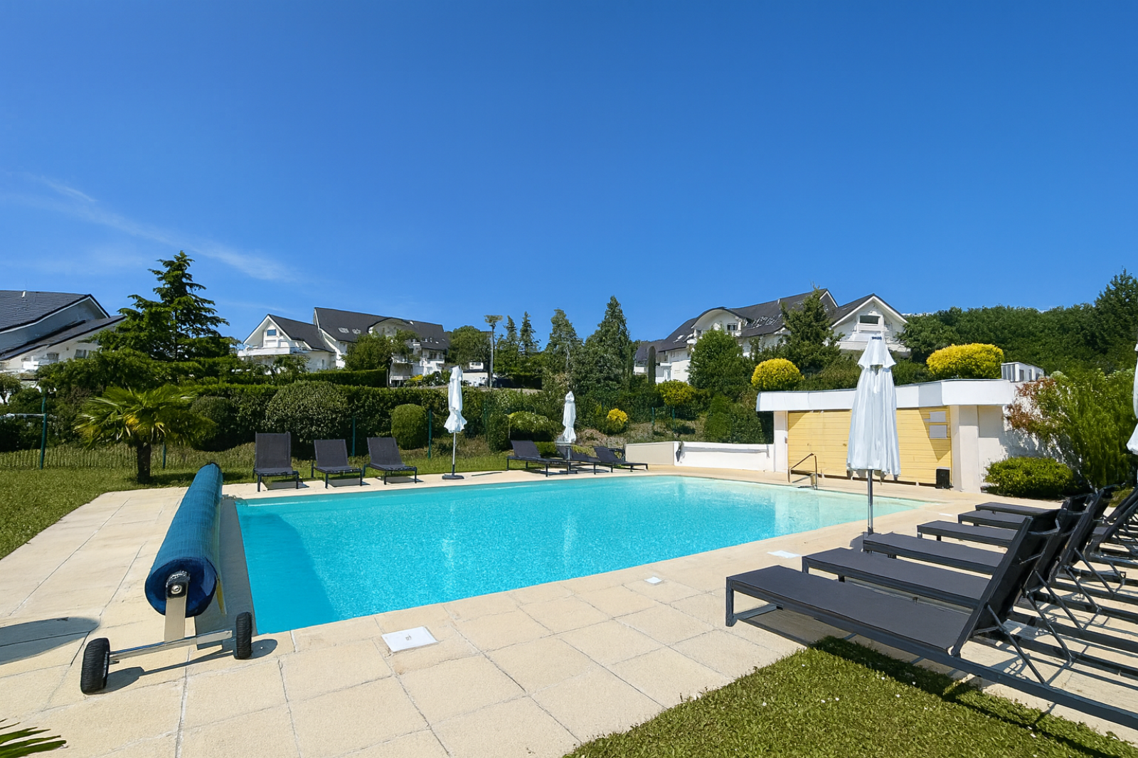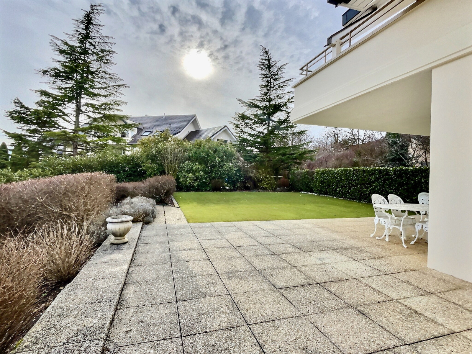 La copropriété -Divona Park- est gardée et sécurisée, et dispose d'une piscine extérieure chauffée et d'un terrain de tennis. Les espaces extérieurs sont paysagés, plantés d'arbres matures et l'entretien de l'ensemble est irréprochable. L'appartement se trouve à proximité de la douane de Chavannes de Bogis, et à une quinzaine de minutes à pied du centre ville de Divonne-les-Bains (cinq minutes en voiture) et les transports en commun (publics et transports scolaires) sont proches. C'est un lieu de vie privilégié à Divonne-les-Bains