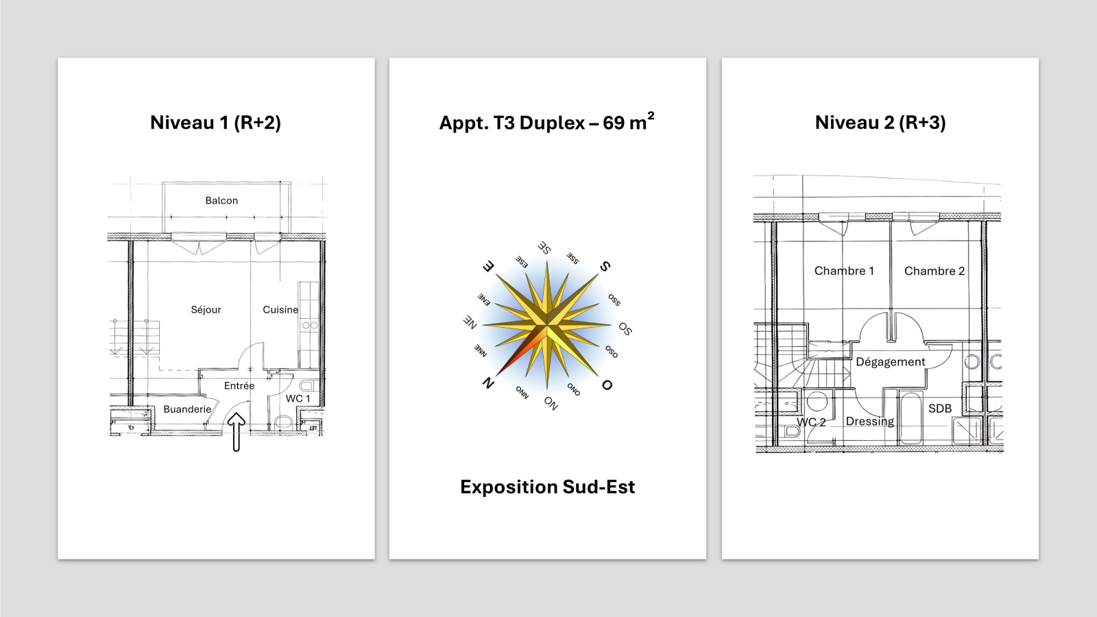 - Niveau 2 (duplex) : dégagement, 2 belles chambres, salle de bains (baignoire + douche), espace dressing et WC indépendant.