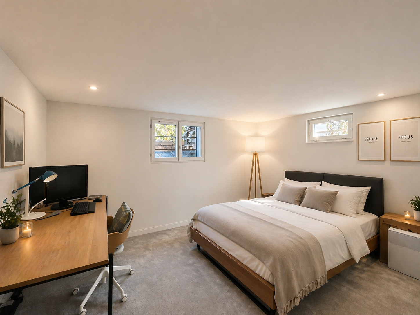 Les volumes sont généreux et baignés de lumière. Le rez-de-chaussée accueille un vaste espace de réception entièrement ouvert — séjour, salle à manger et cuisine — tourné vers le jardin. Deux chambres en suite, chacune avec salle d’eau ou salle de bain et toilettes, complètent ce niveau.