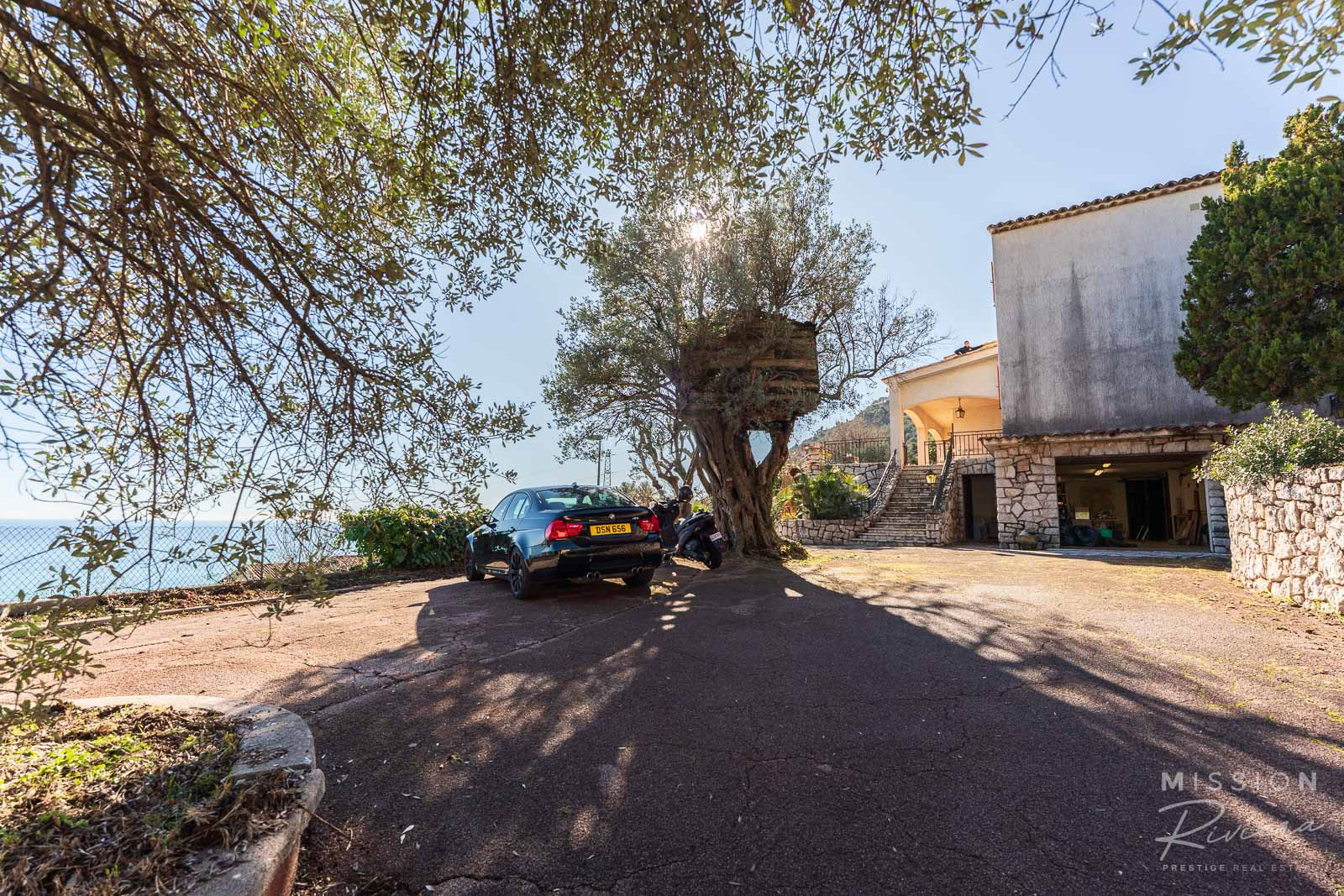 Dès son arrivée, en franchissant le portail et en remontant l'allée, le visiteur est immédiatement séduit par le caractère privé de cette grande propriété, qui bénéficie d'une position dominante et n'est pas exposée au regard des voisins. En montant les quelques marches qui mènent à la terrasse qui s'étend sur toute la longueur de la maison, le regard est immédiatement attiré par la vue magnifique, avec la jolie vallée verdoyante au premier plan, les tours scintillantes de Monaco et l'élégant Port d'Hercule au milieu, et la mer étincelante à l'horizon. La paix et le calme de la propriété sont immédiatement perceptibles, et la vaste terrasse couverte offre de l'ombre sous le soleil provençal, avec un espace généreux pour manger et se détendre à l'extérieur.