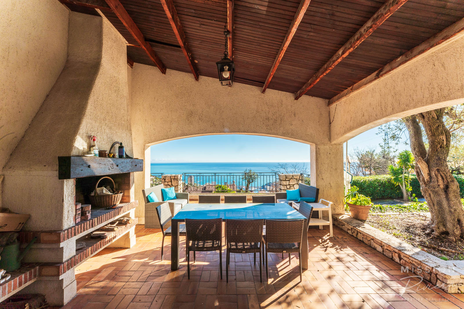 Le salon forme l'autre partie du « L ». Bénéficiant également de la cheminée, on imagine facilement des soirées chaleureuses et confortables à la maison dans cette pièce spacieuse et élégante. La pièce est lumineuse - double exposition - et la fenêtre arrière offre une belle vue sur le jardin et la piscine. Le salon dispose de ses propres portes-fenêtres qui s'ouvrent sur la cuisine/salle à manger d'été. Cette partie couverte et très profonde de la terrasse constitue un espace extérieur ombragé idéal, avec sa propre cheminée extérieure et son coin cuisine. De cet endroit, on peut voir directement le Port d'Hercule à Monaco et la mer jusqu'à l'horizon. Comme pour tout dans cette villa, c'est le sentiment d'espace et d'intimité qui laisse une impression durable. Le vaste espace de vie, combiné à l'immense terrasse à l'avant, entourée de vos propres oliviers et arbustes, menant à la superbe piscine, donne immédiatement l'impression d'une maison de prestige.