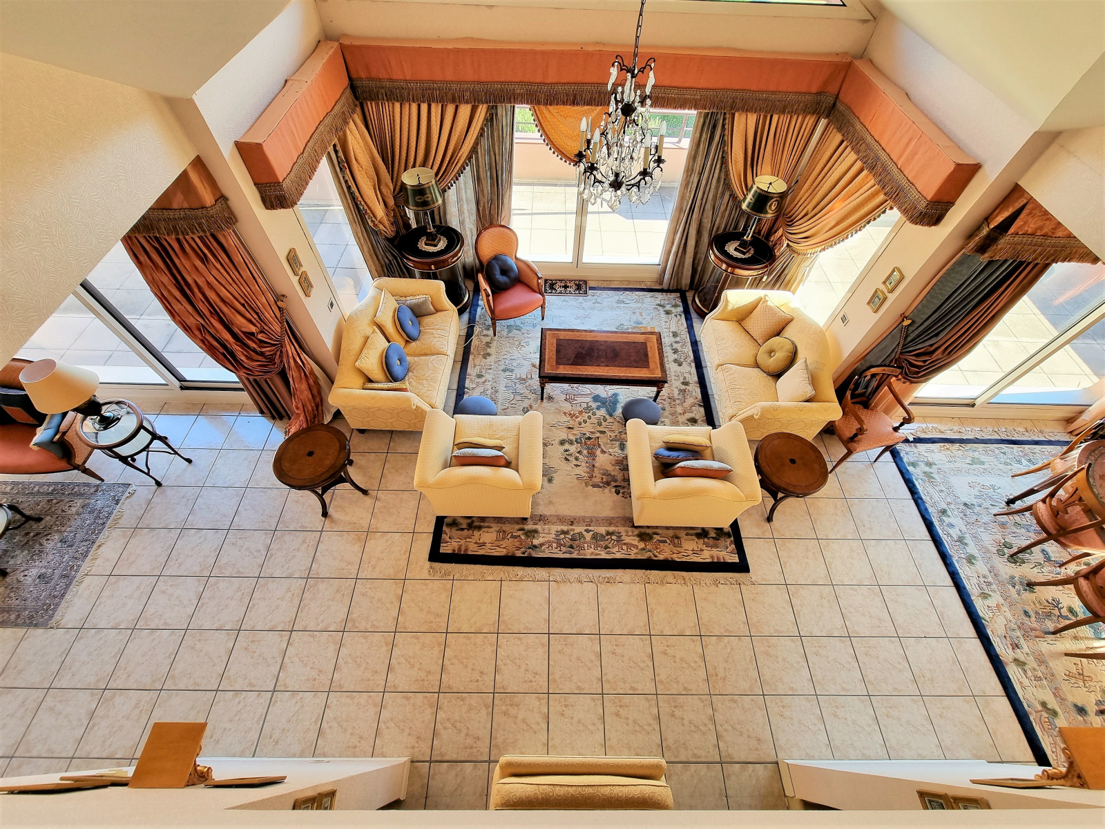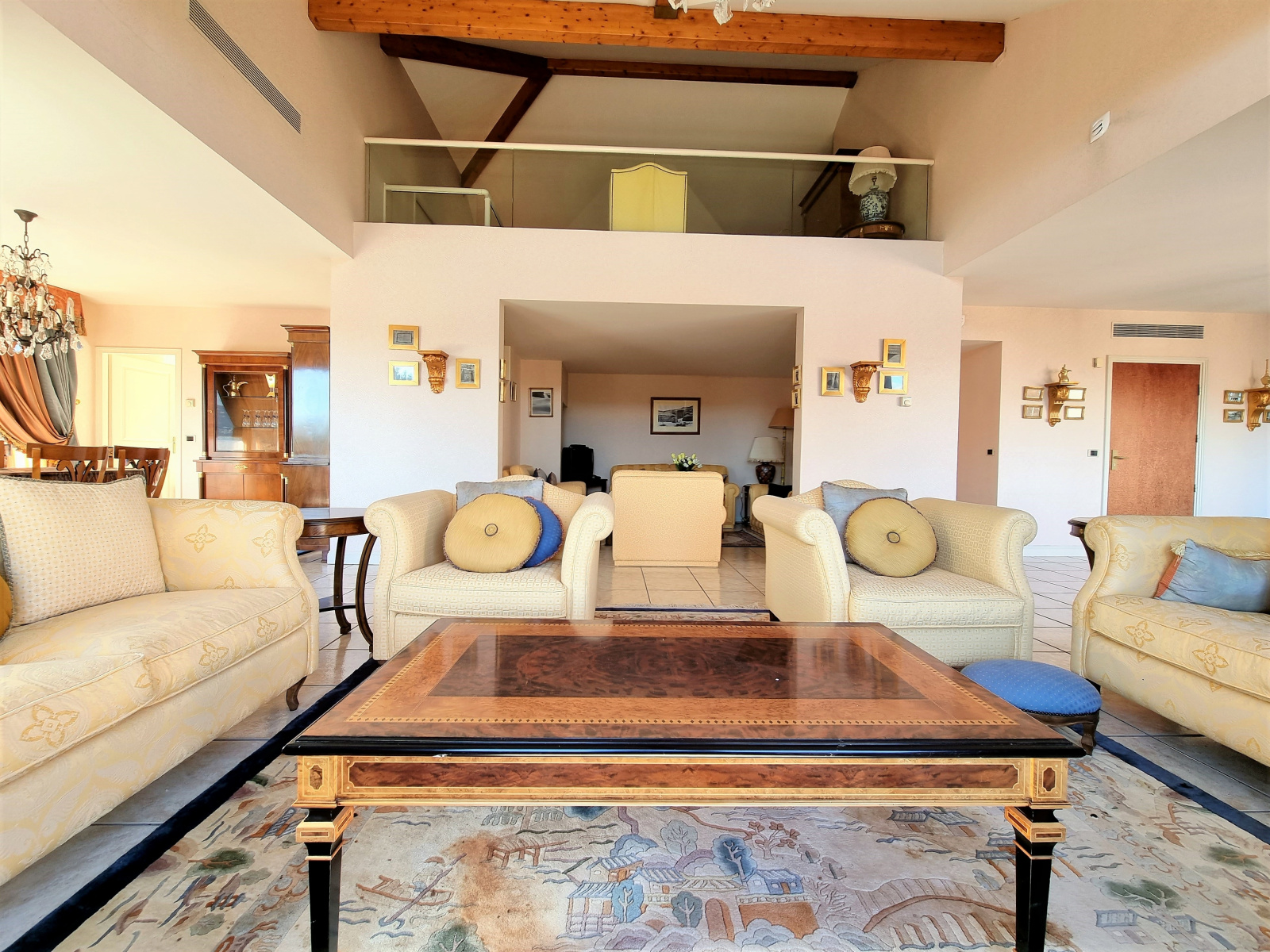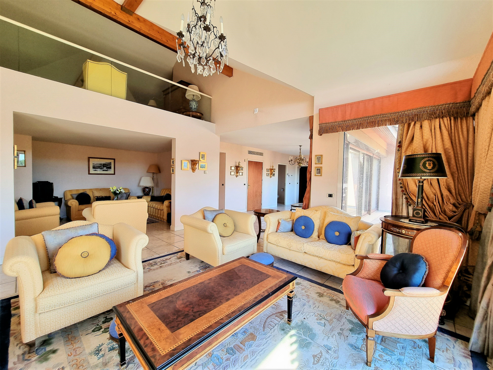 1 entrée / 1er salon de réception de 18 m², 2ème séjour / coin feu d’environ 41 m², 3ème salon en mezzanine de 21,50 m² , 1 spacieuse cuisine indépendante de 18 m², 1 salle à manger de 17 m², 1 suite parentale de 36 m² avec salle de bains, douche, espace dressing et terrasse privée, 4 chambres avec salles de bains ou d’eau / WC privatives dont une pièce réservée aux domestiques pouvant accueillir 4 personnes.