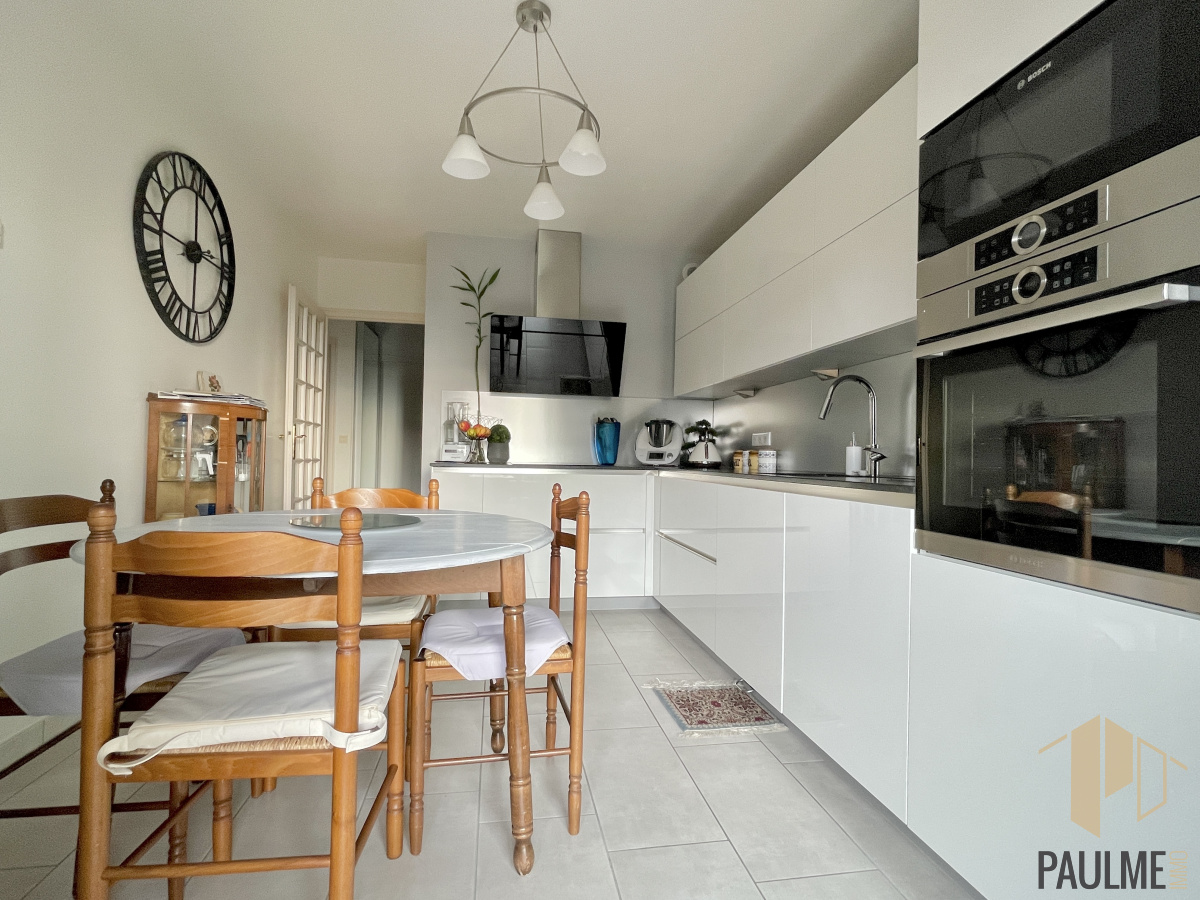 Bel appartement T3 de 102 m2 avec balcon de 16 m2, possibilité de transformer en T4. En partie rénovée, il comprend : un hall d'entrée avec placard, une superbe cuisine entièrement équipée d'électroménagers haut de gamme, un vaste salon salle à manger d'environ 37 m2 avec accès au balcon, deux grandes chambres avec placards intégrés (13 et 14 m2), une salle de douche et un WC séparé avec lave-mains. Grande cave et garage.