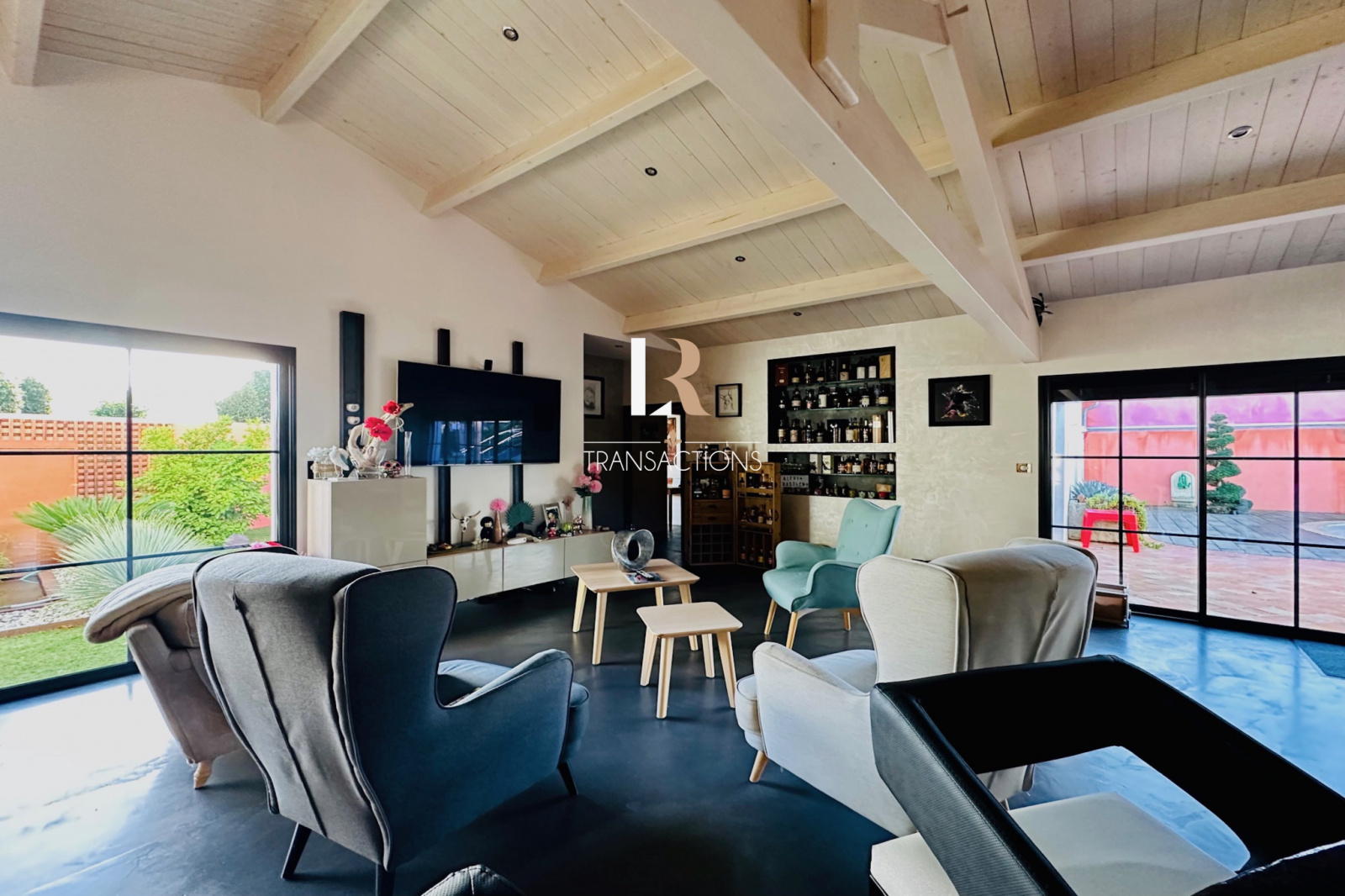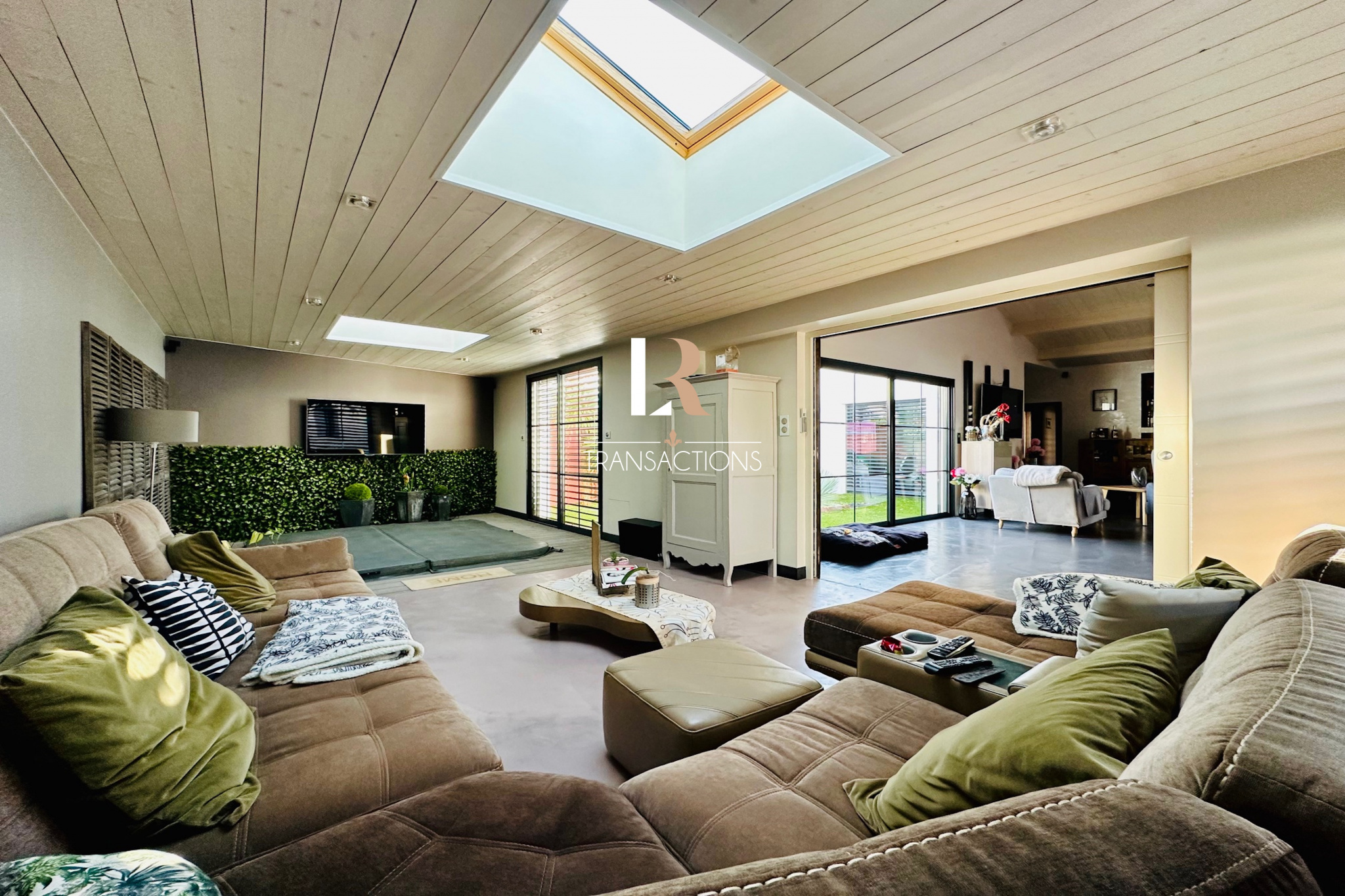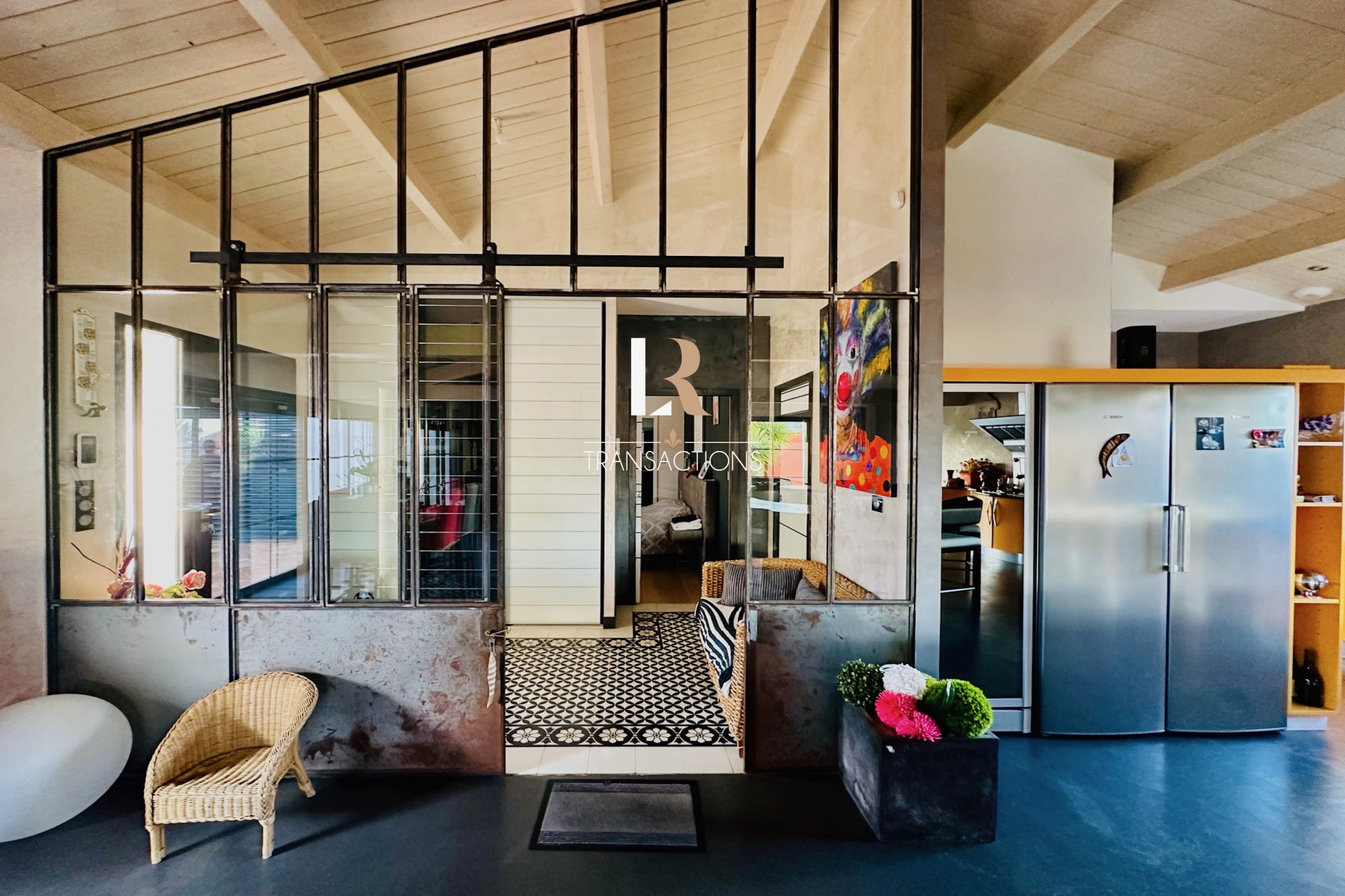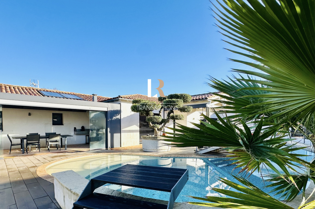 Au calme, dans une impasse, vous accédez par un portail permettant de stationner de multiples véhicules grâce à sa cour d'accueil, son porche et ses trois garages (chauffés avec portes automatiques). Une belle entrée avec placard s'ouvre sur une spacieuse pièce de vie de plus de 90m2 par une élégante baie atelier sur mesure. Cette pièce de vie profite d'un plafond cathédrale et d'une triple exposition, cette dernière s'ouvre sur les extérieurs par une baie à galange. Vous trouverez également une spacieuse arrière cuisine buanderie attenante à la cuisine entièrement équipée avec de l'életroménager (plaques à induction, plancha, friteuse, ice maker, hottes roblin...). Dans la continuité de la pièce de vie, un salon TV avec jacuzzi et sa jolie vue sur un patio paysagé et sa cascade, sera parfait pour vos moments de détente.
