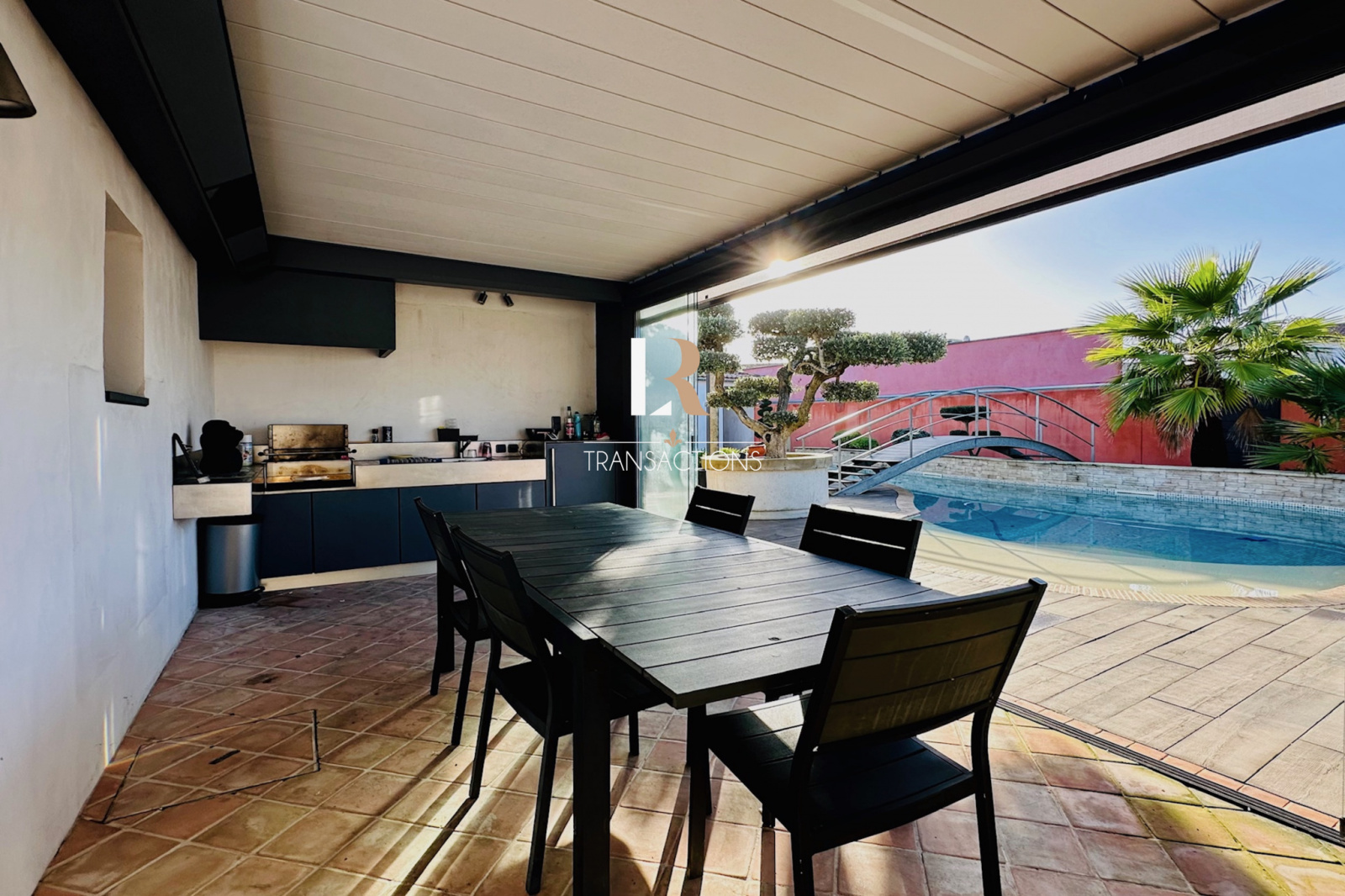 Côté extérieur, tout les espaces sont paysagés, patio, jardin, une piscine en mosaîque de 12m de long dispose de deux hauteur de bassin différentes, parfaite pour le plaisir des petits comme des grands. Une cuisien d'été avec pergola amovible et éclairages intégrés, peut si vous le souhaitez se fermer intégralement par des portes coulissantes en verre. Cette dernière dispose de chauffage extérieurs.