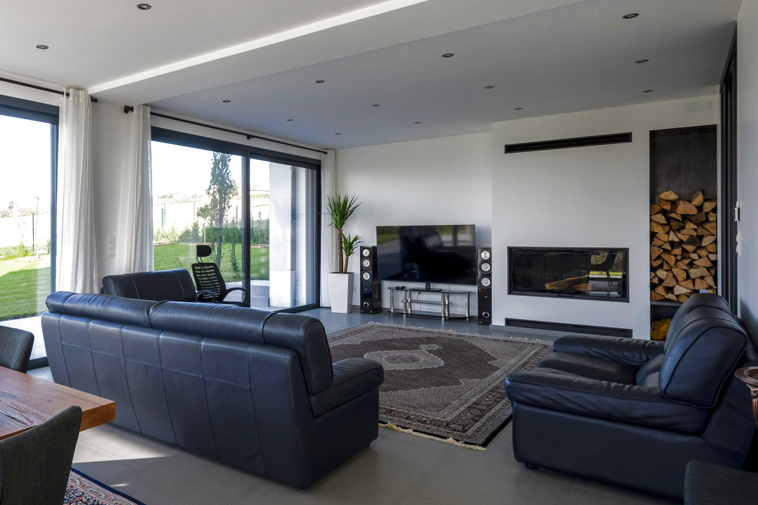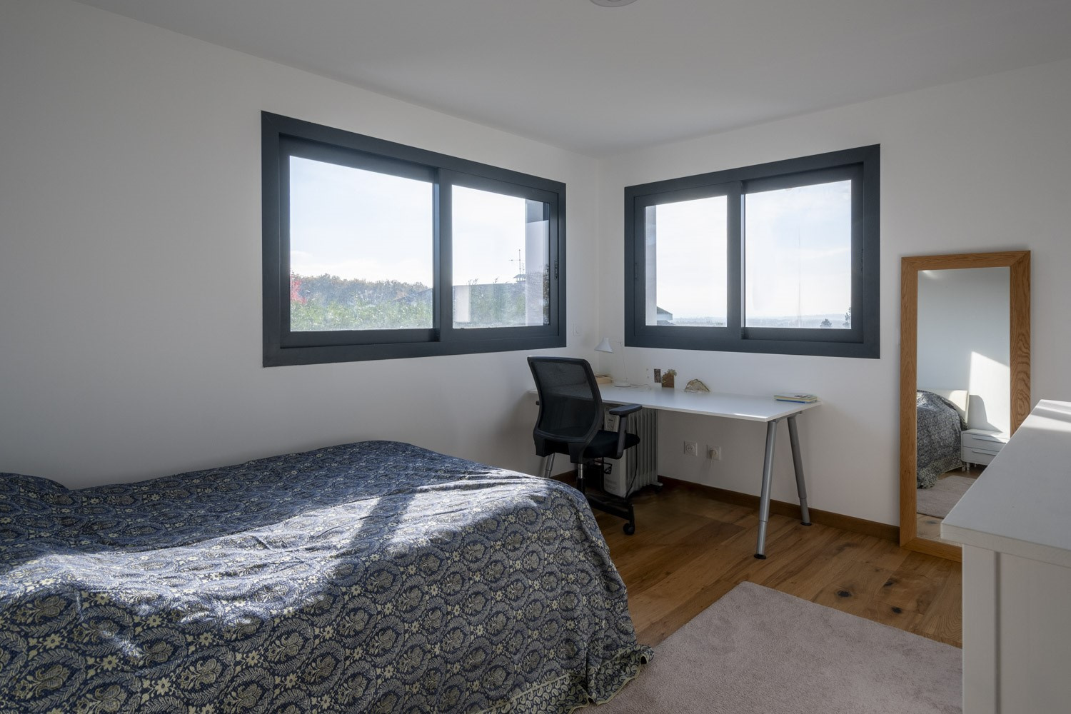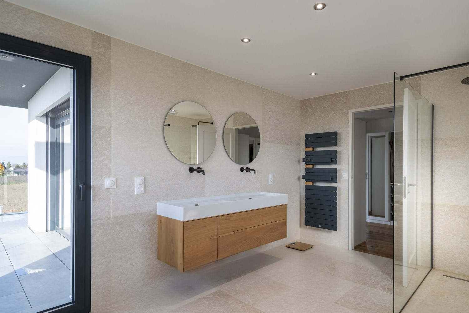 La maison est équipée d'un système de chauffage par pompe à chaleur avec plancher chauffant et rafraichissant et de menuiseries aluminium triple vitrage.