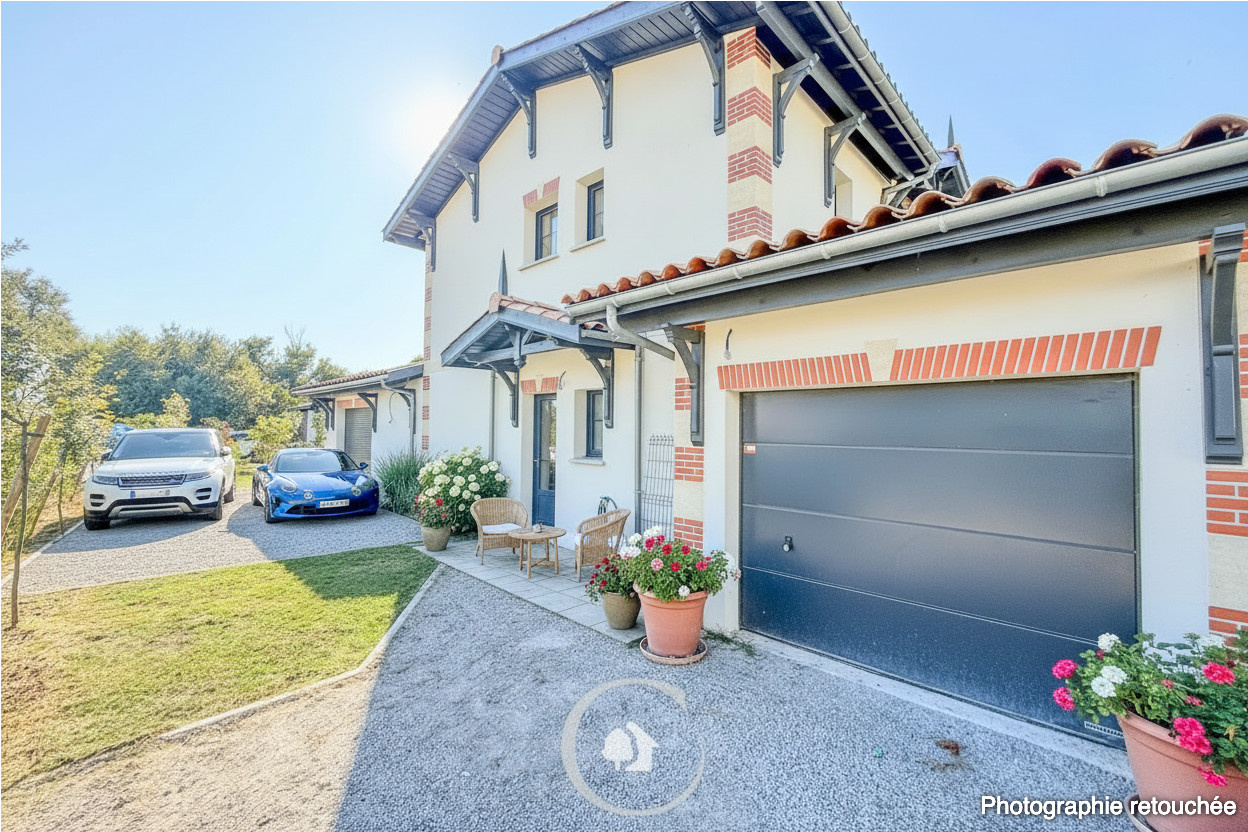 Pompe à chaleur air/eau, menuiseries aluminium, volumes généreux, grandes ouvertures, architecture Arcachonnaise et finitions soignées.