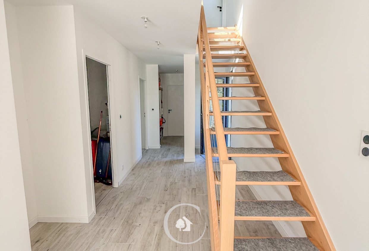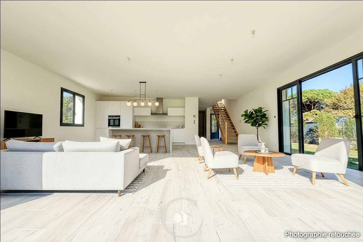 Dès l’entrée, vous découvrez une vaste pièce de vie baignée de lumière, pensée pour accueillir une cuisine ouverte avec îlot central. De larges baies vitrées à galandage prolongent naturellement l’espace vers l’extérieur, offrant une belle continuité intérieur/extérieur et une ouverture agréable sur le jardin.