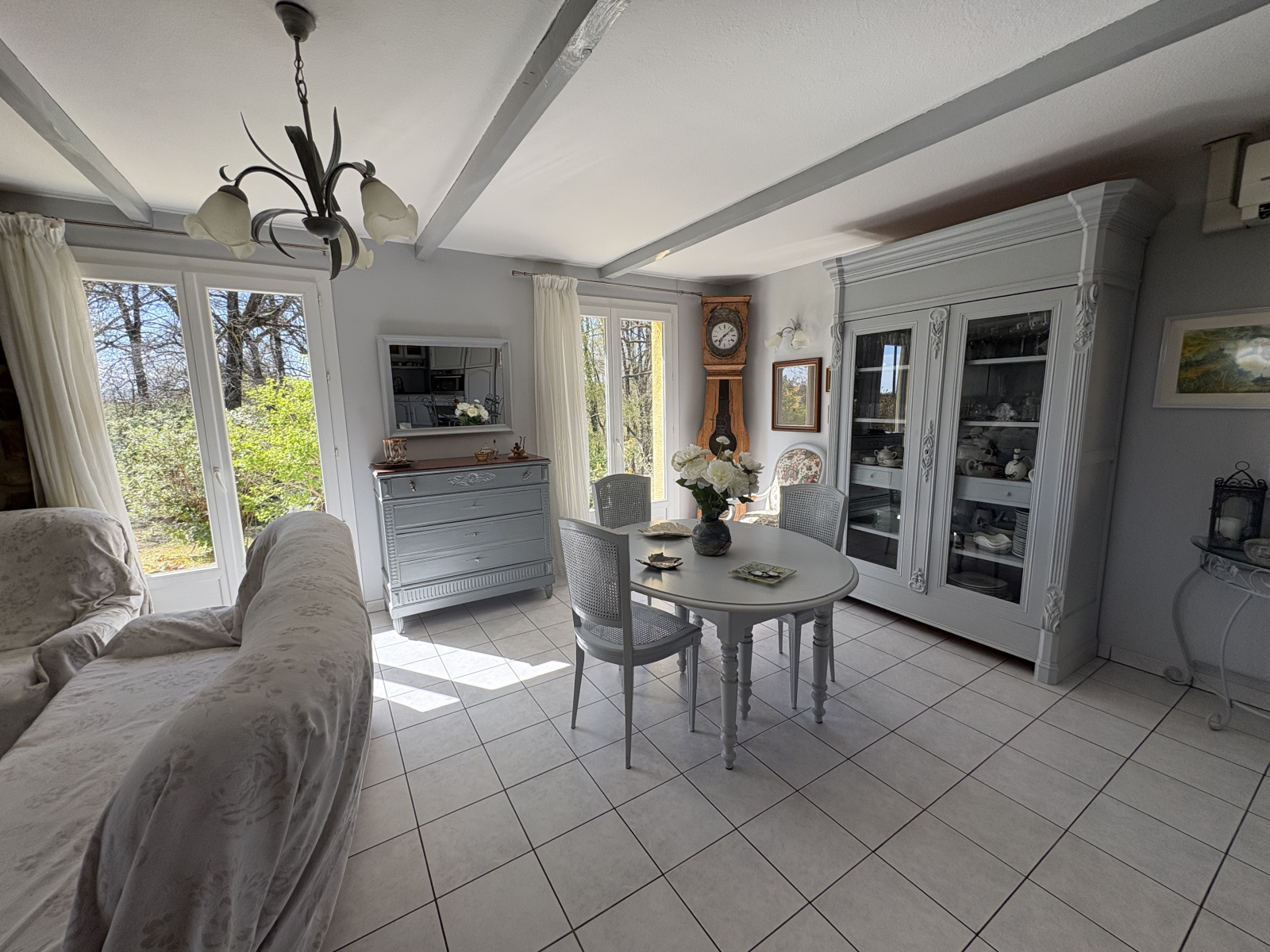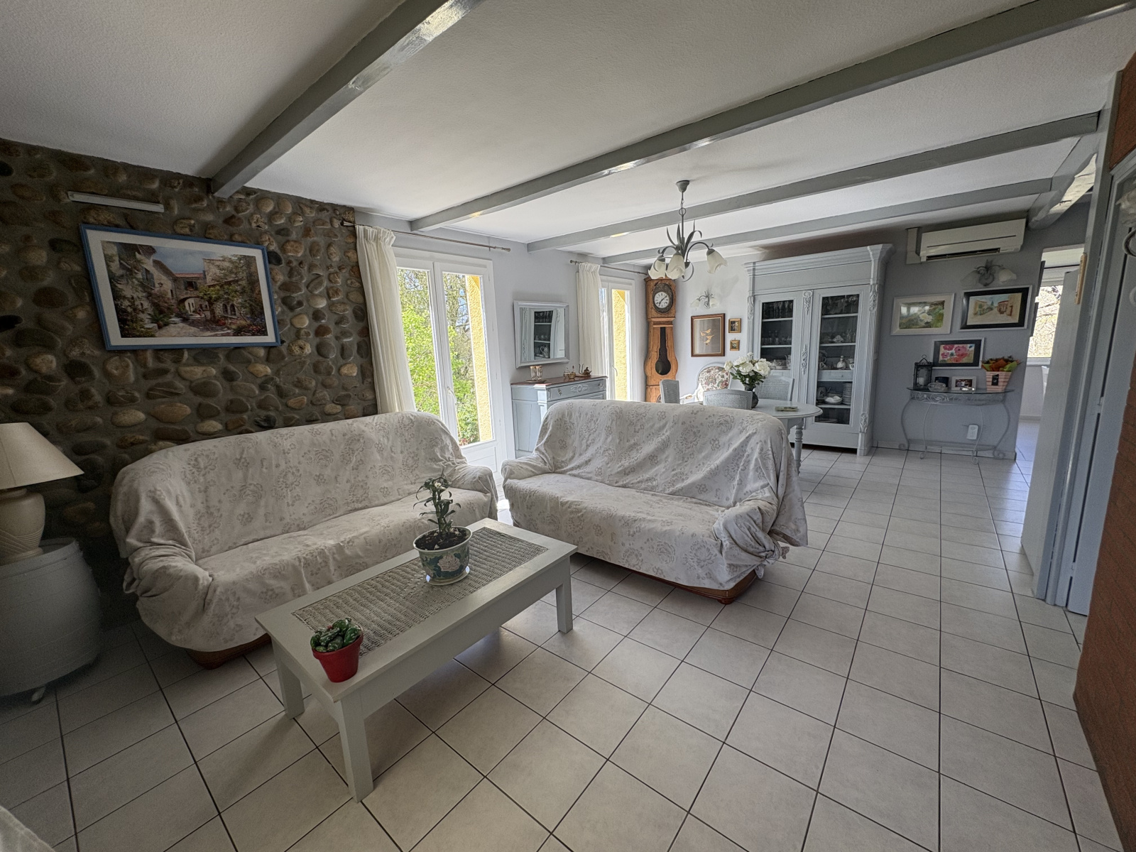 Elle est équipée d'un système de clim (air/air), d'une cheminée avec récupérateur de chaleur, de menuiseries en double vitrage équipées de volets bois, d'un cumulus thermodynamique et d'une fosse septique. L'isolation de la toiture a été effectuée en 2018.