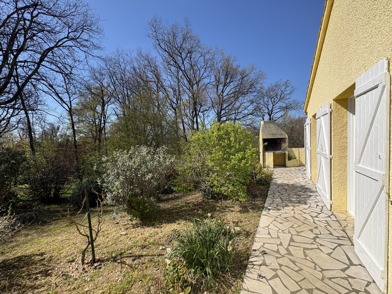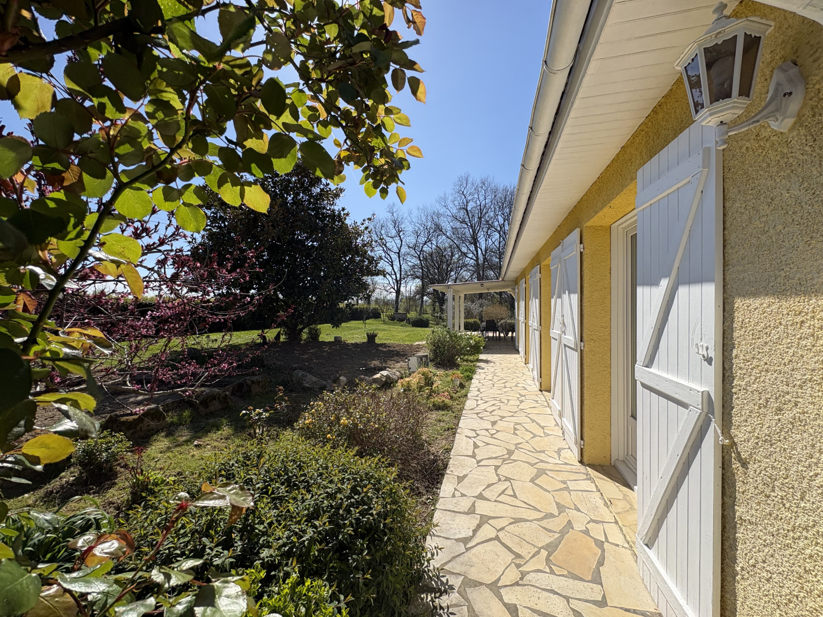 Le parc de 9050 m2, est réparti devant la maison, en un parterre enherbé, joliement fleurie et plat, le reste en partie boisée de chênes.