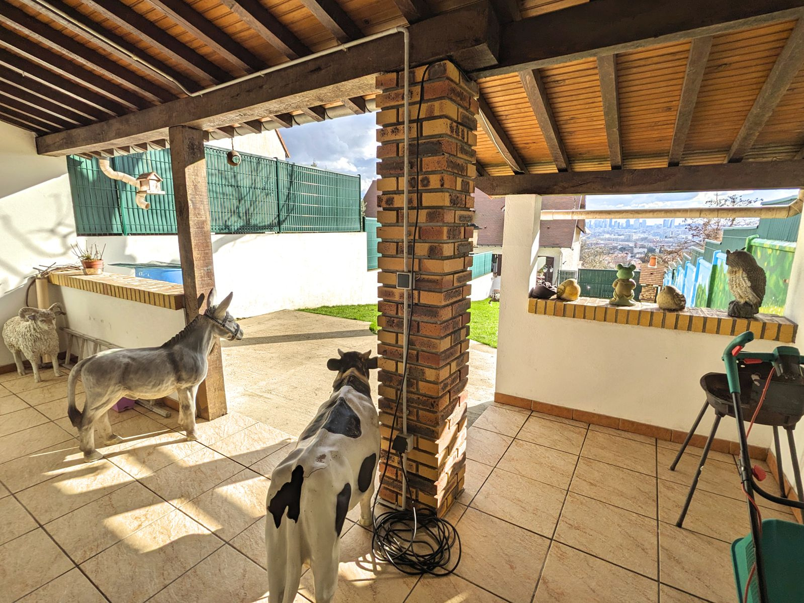 Le jardin aménagé en paliers propose terrasses, pelouse et abri de jardin, parfait pour profiter du calme et de la vue.