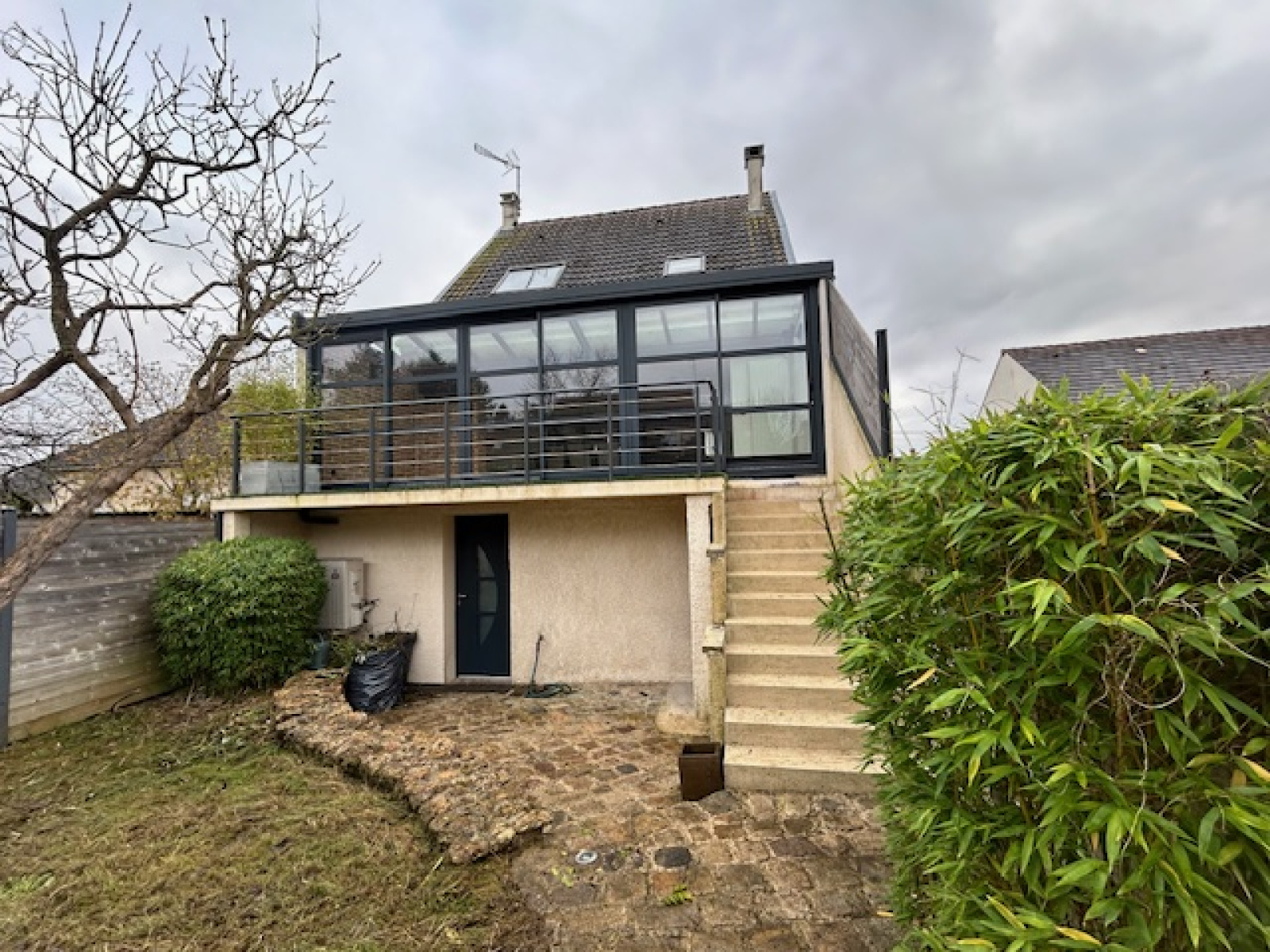 Au rez-de-chaussée surélevé : un dégagement, une grande pièce de vie avec véranda et balcon (environ 45m2), une cuisine ouverte aménagée et équipée, un WC séparé, et une salle de bains.