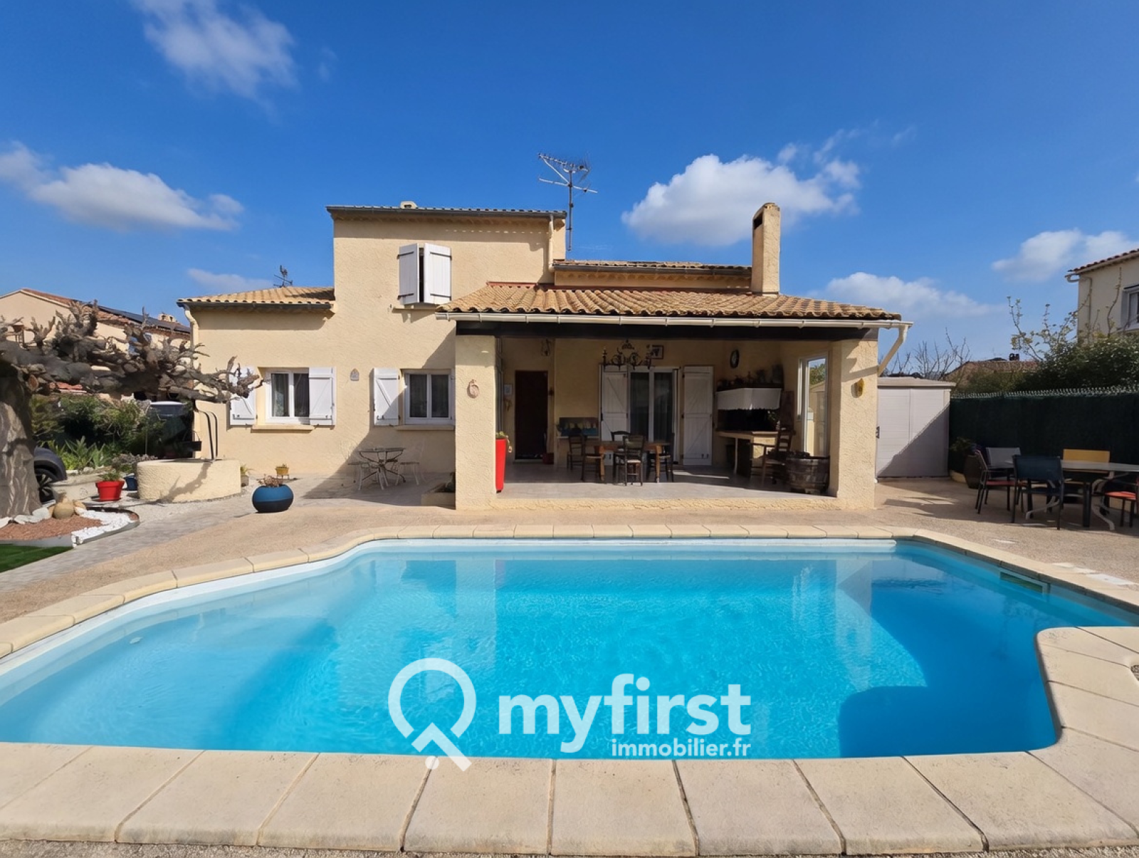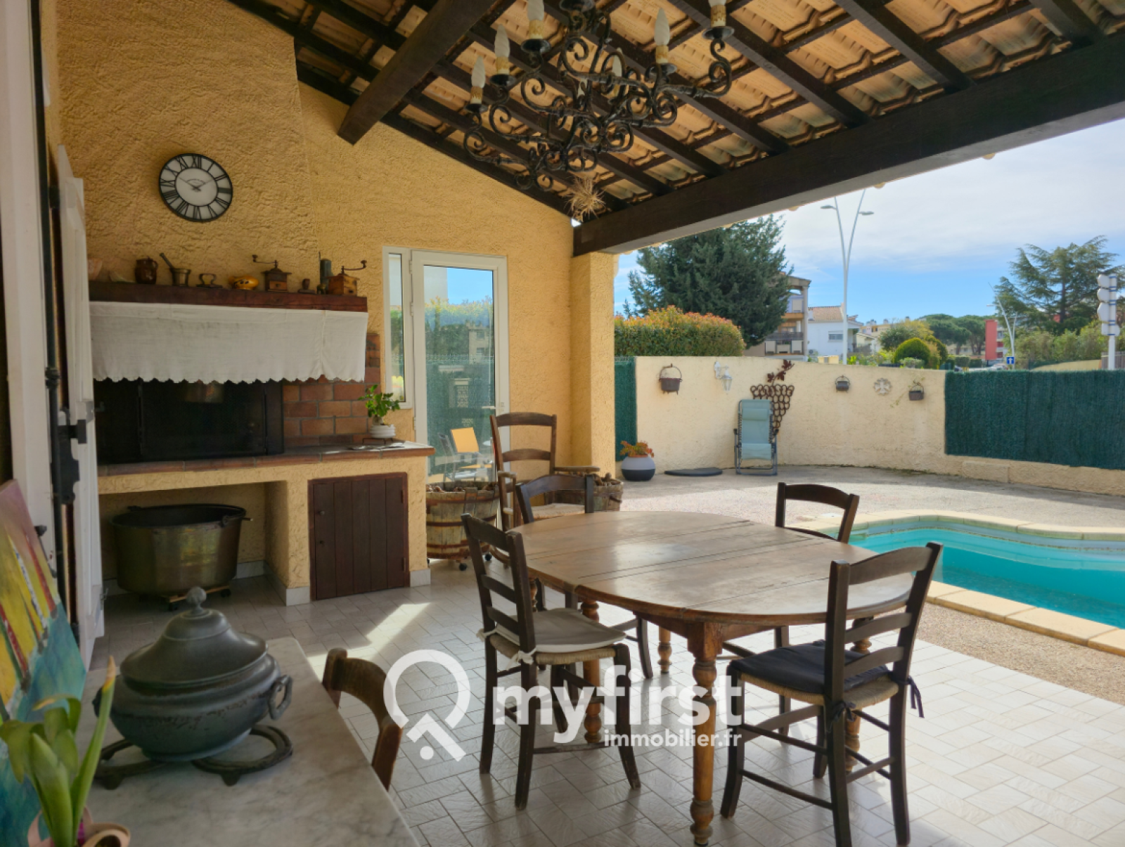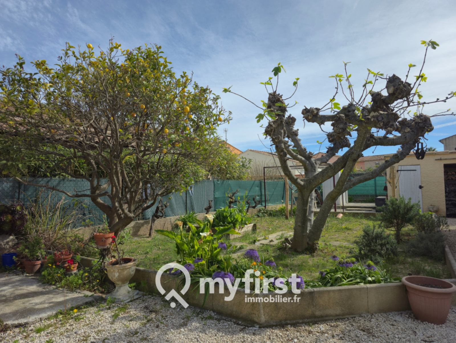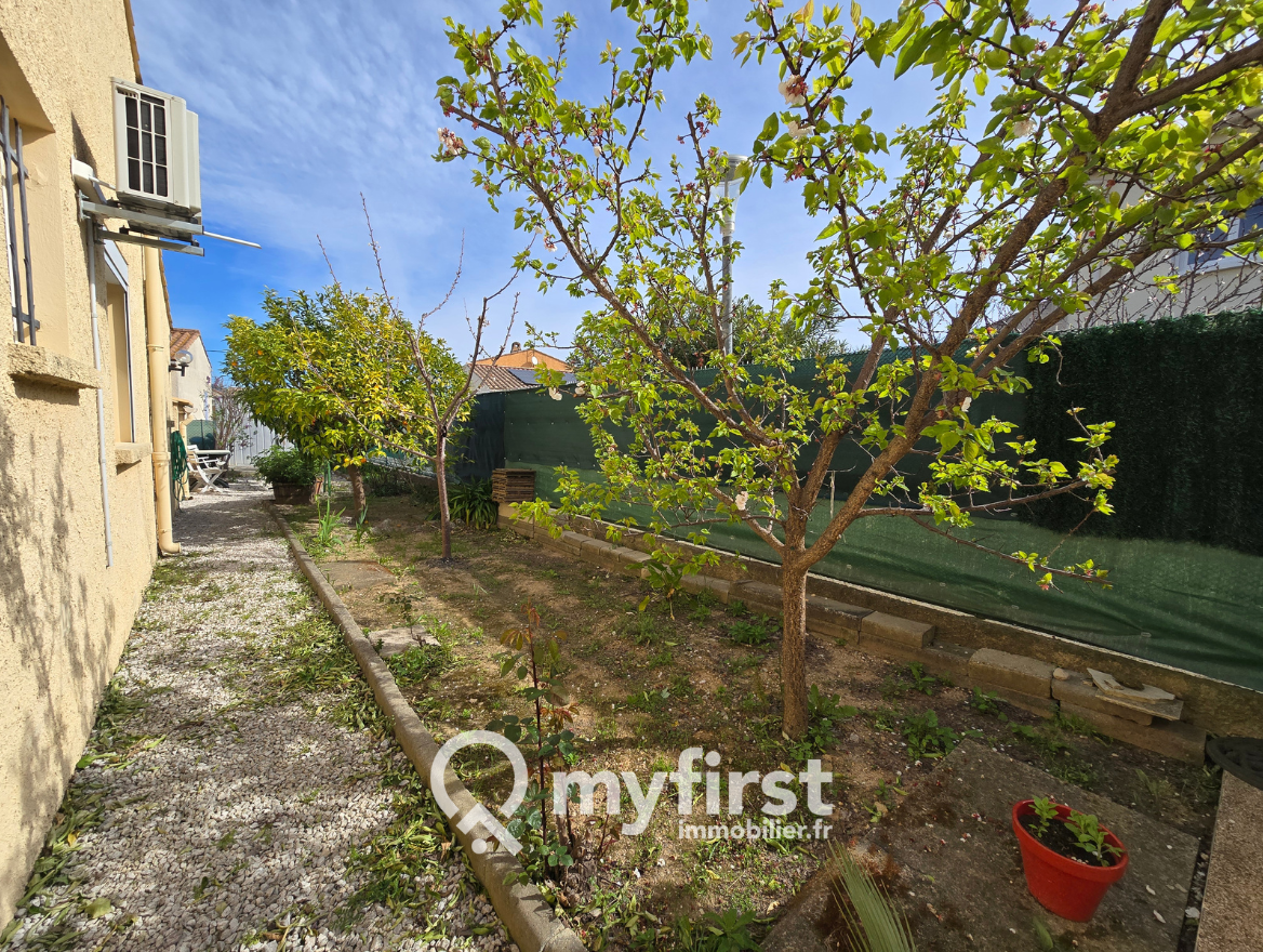 À l’extérieur, le charme opère immédiatement : une piscine en façade, une terrasse conviviale et un jardin arboré d’essences fruitières — cerisiers, orangers, citronniers — qui apportent une touche méditerranéenne pleine de douceur. Le terrain permet en outre de stationner aisément plusieurs véhicules.