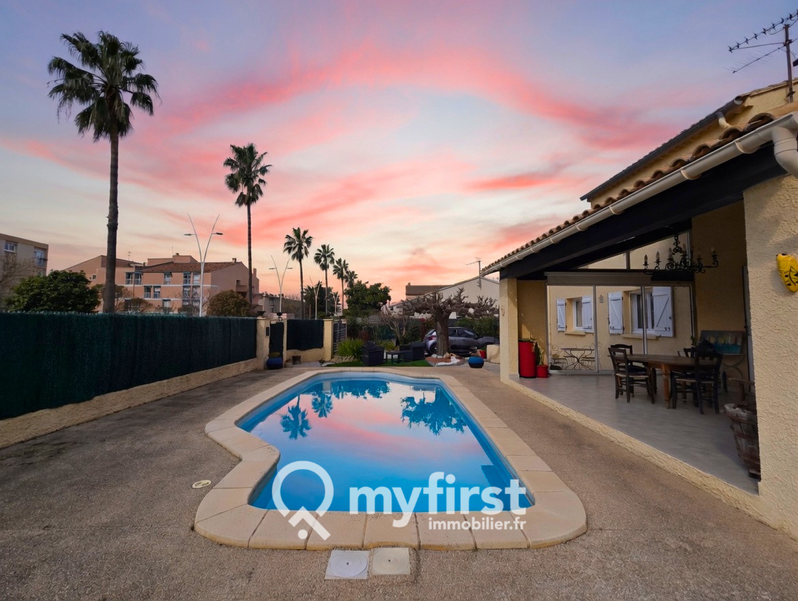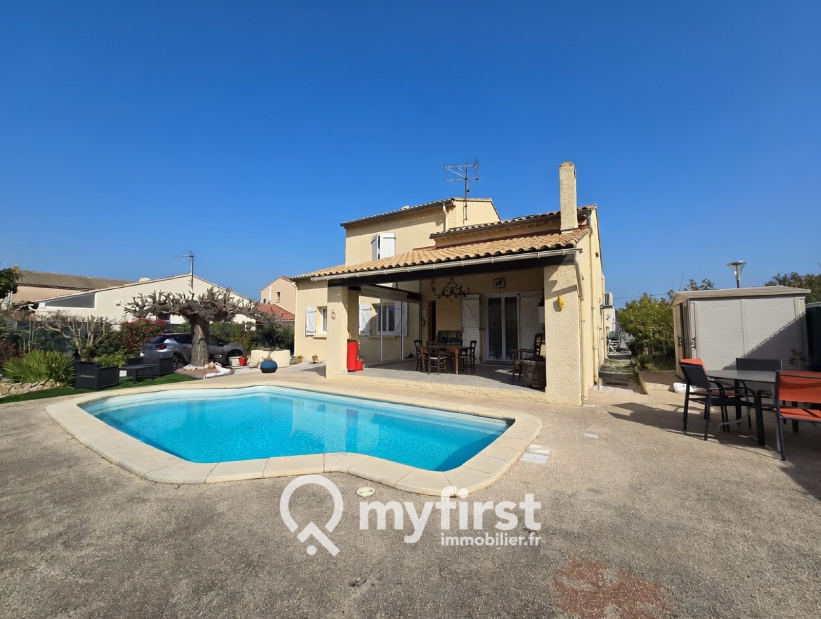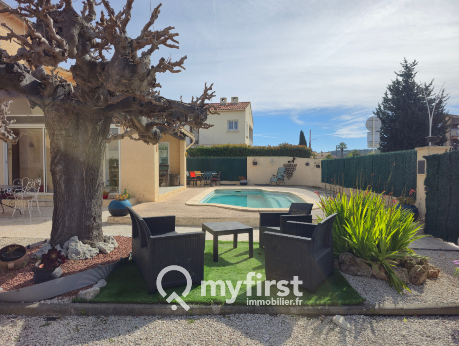 À l’extérieur, le charme opère immédiatement : une piscine en façade, une terrasse conviviale et un jardin arboré d’essences fruitières — cerisiers, orangers, citronniers — qui apportent une touche méditerranéenne pleine de douceur. Le terrain permet en outre de stationner aisément plusieurs véhicules.