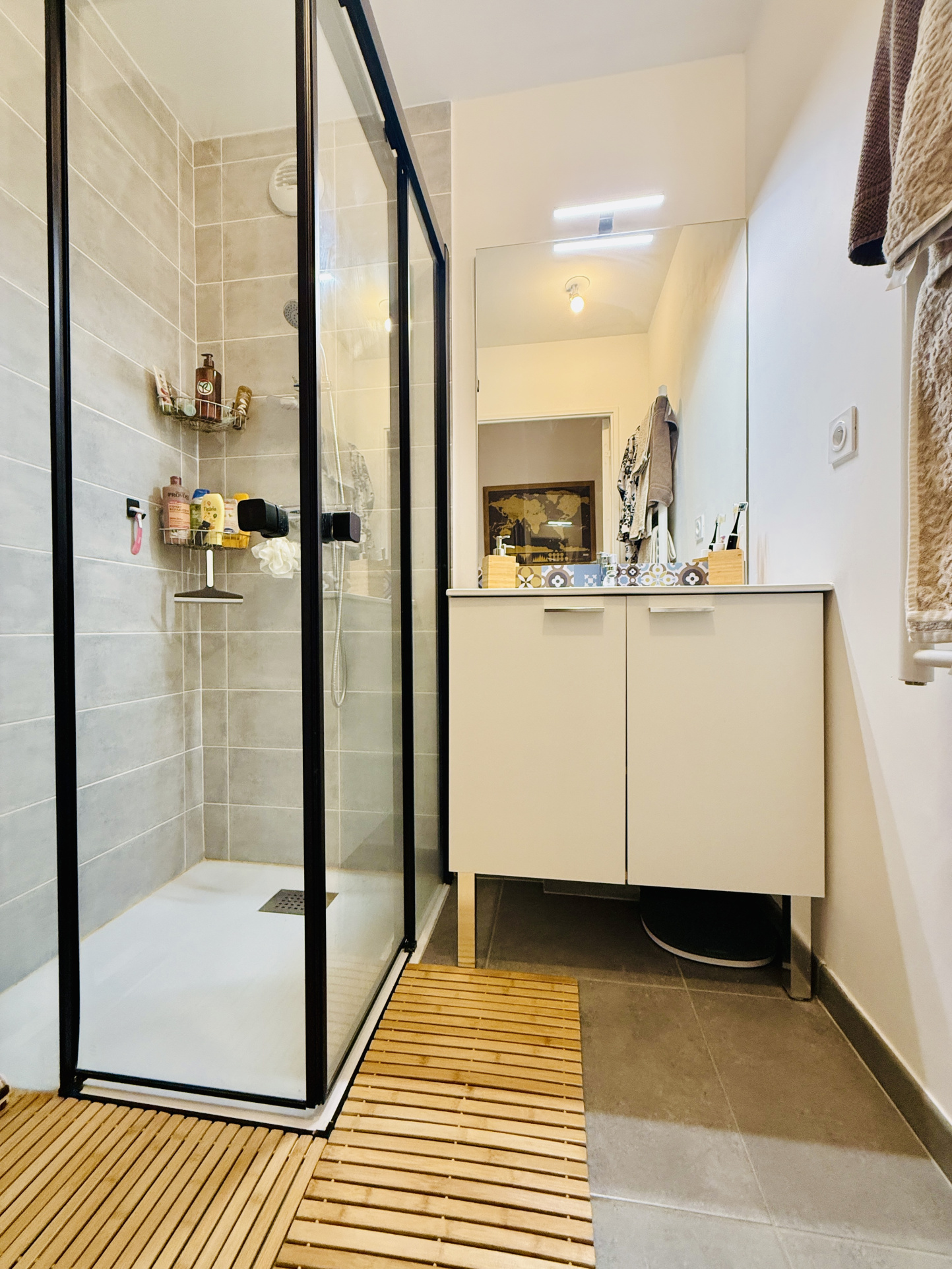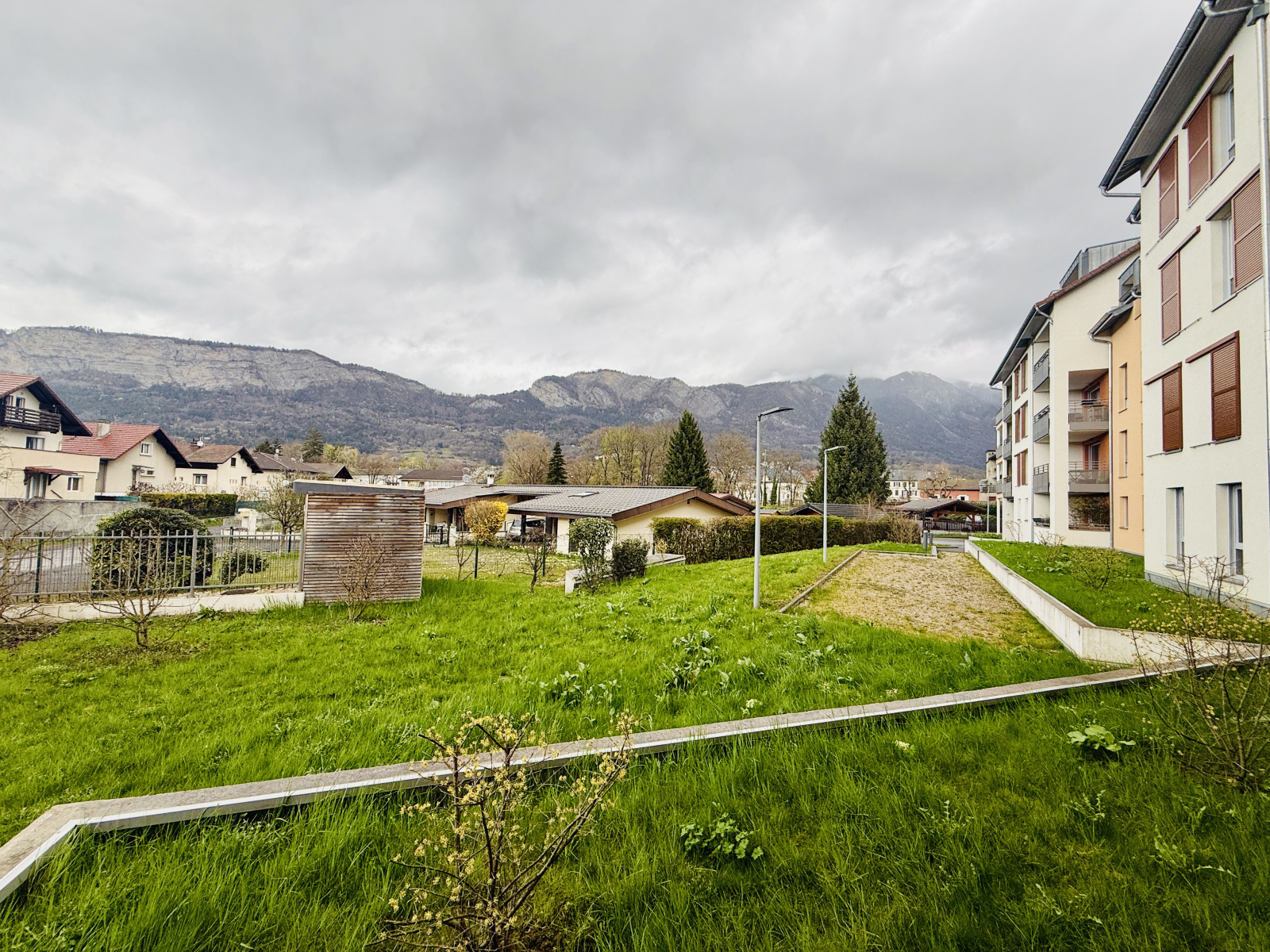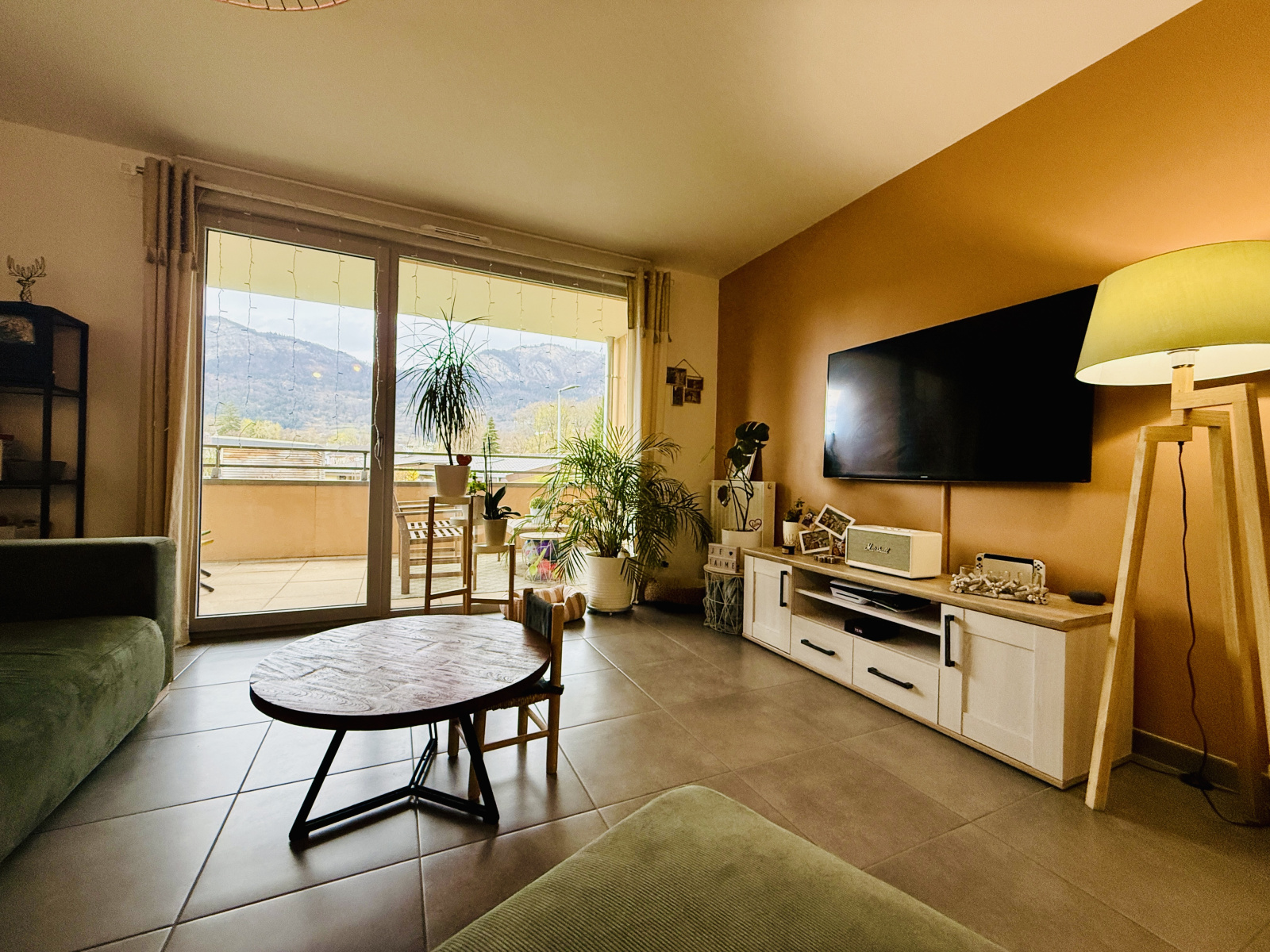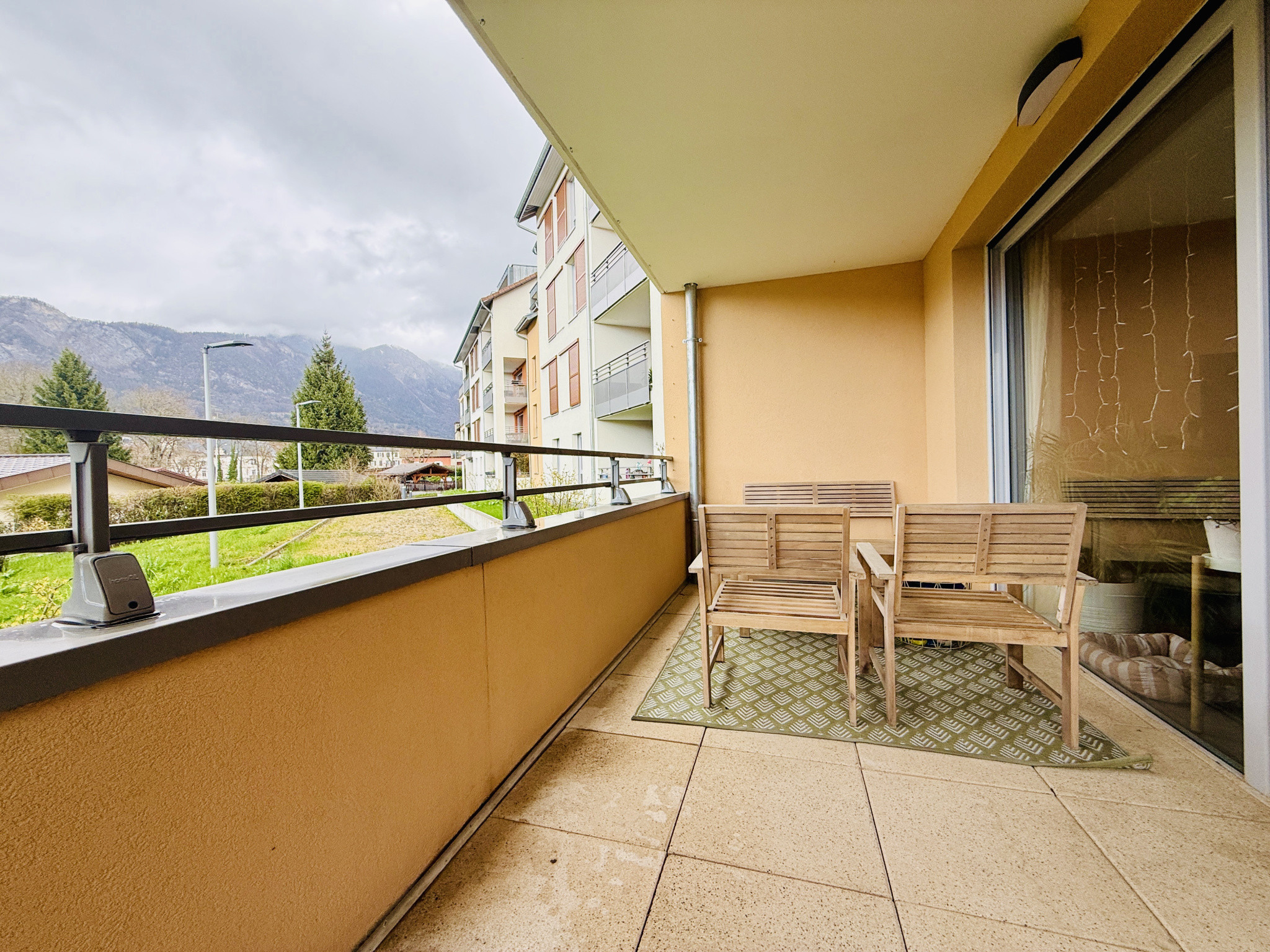 La pièce de vie, de 32m2 intégrant une belle cuisine équipée, est prolongée par une spacieuse terrasse abritée de plus de 10m2, donnant sur l'arrière-cour et bénéficiant d'une vue dégagée sur les montagnes et le centre-ville.