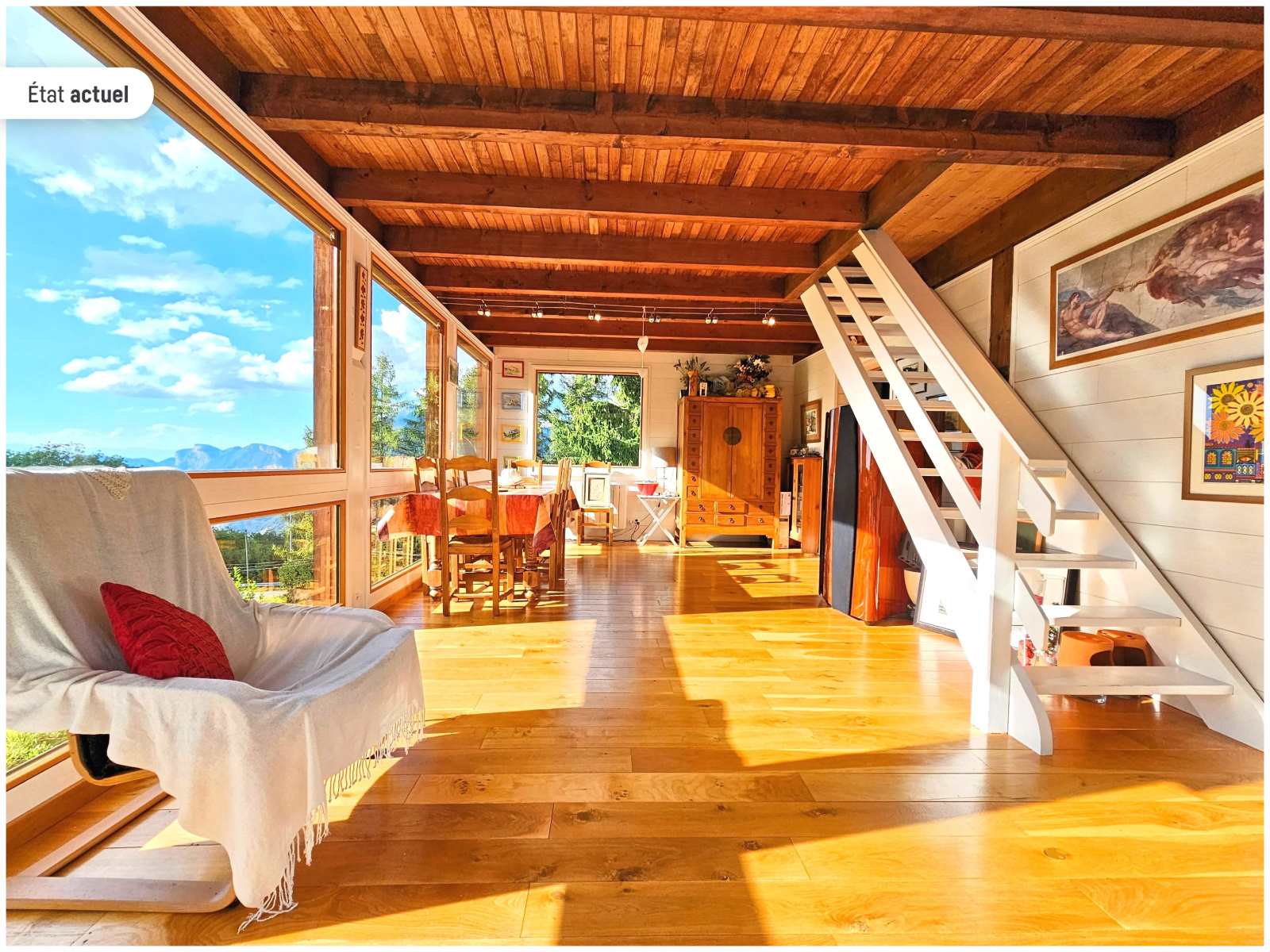 - Au 1er étage : 1 entrée avec placards intégrés, 1 WC indépendant, 1 salle de bains, 1 escalier d’accès au rez-de-chaussée et à l’étage, 1 grande cuisine américaine entièrement équipée datant de fin 2021 (cuisine Italienne Art'Ve Granit), 1 séjour de 33m² avec cheminée et accès direct à 1 magnifique Salon/Véranda ensoleillé, exposé Ouest avec vue panoramique sur les montagnes environnantes.
