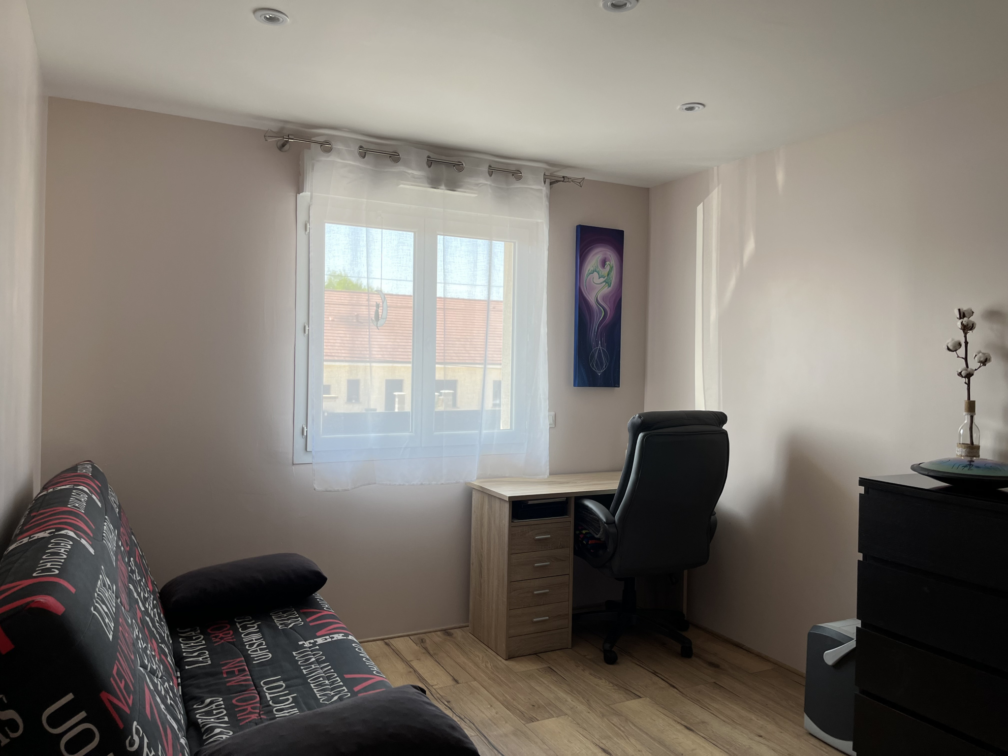 Une seconde chambre complètent l'espace nuit tandis que le garage attenant aménagé et déclaré en surface habitable avec chauffage, parquet et baies vitrées offre la possibilité d’une troisième chambre ou d’un bureau selon les besoins.