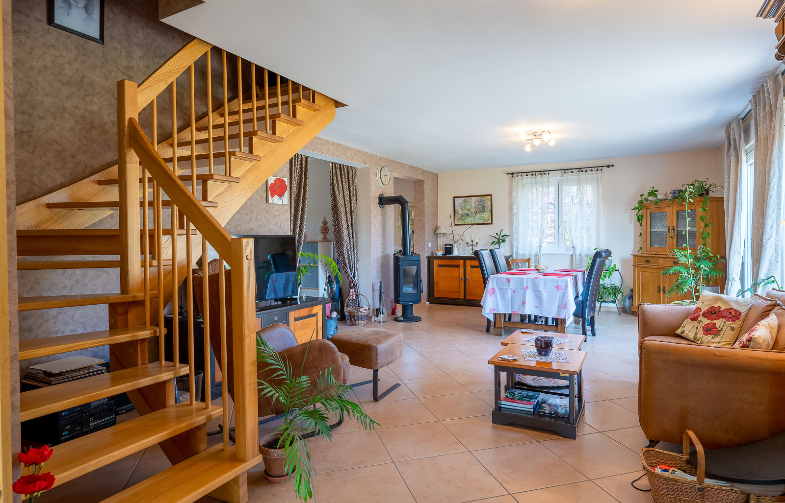 Maison construite en 2007 sans travaux : 6 pièces réparties sur environ 110m2. Elle se compose d'une entrée,d'un WC, d'une cuisine équipée ouverte sur la pièce de vie d'une surface d'environ 39m2 avec un accès terrasse et grand jardin,veranda et garage. Une première chambre vient compléter le rez-de-chaussée d'environ 10.5m2. A l'étage, le palier dessert 3 chambres ( 9m2, 10m2 et 12.5m2 environ),une salle de bain avec baignoire et WC ainsi que l'accès aux combles. Chauffage Gaz,au sol. L'ensemble bénéficie d'un garage d'environ 37m2, d'une grange sur deux niveaux d'environ 175m2 et une annexe d'environ 10m2.