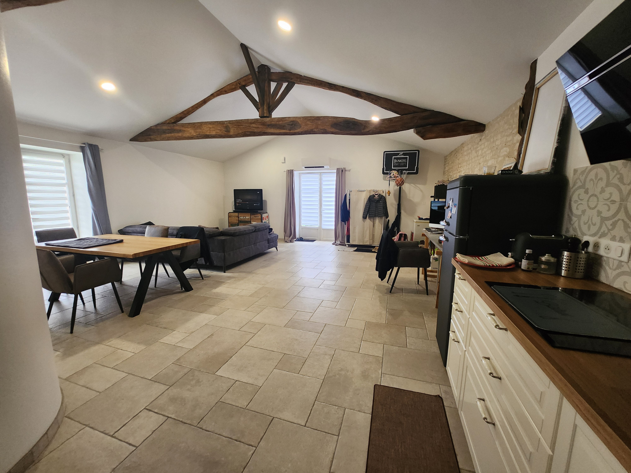 Vous découvrirez une entrée ouvrant sur un séjour lumineux avec cuisine aménagée et équipée, offrant un espace de vie convivial et fonctionnel d'environ 50m2.