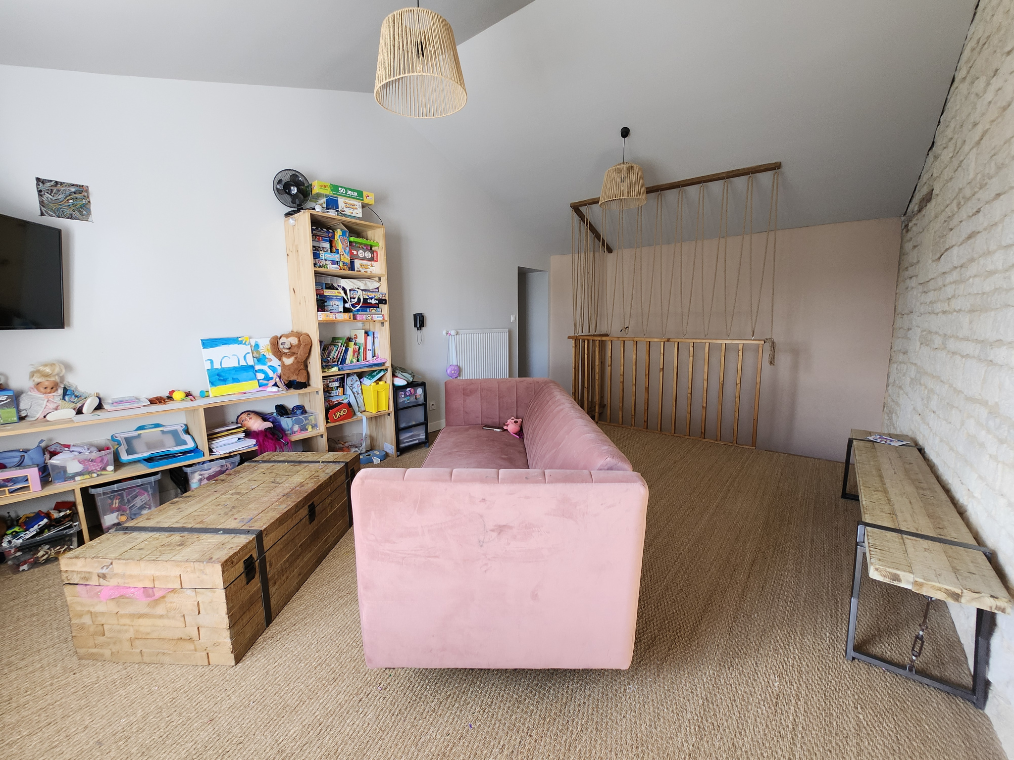 A l'étage un palier spacieux faisant aujourd'hui office de salle de jeux mais qui peut servir de grand bureau, ou de salle de lecture par exemple, une chambre parentale avec dressing, salle d'eau et WC, deux autres chambres spacieuses (14 et 12.50m2), une salle d'eau indépendante avec wc également.