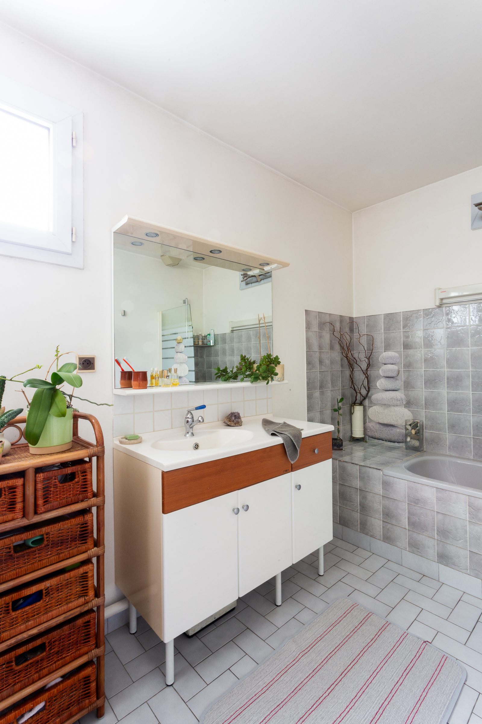 À l’étage, la maison ouvre une autre page. On ressent que les lieux sont habitués au retour de voyages. On y comprend l'esprit chaleureux déjà ressenti au RDC. Les espaces restent simples, mais l’énergie est celle de retour de vacances. Deux chambres, une grande salle de bain qui donne envie de plonger dans la mousse, et un espace ouvert qu'on a envie de s'approprier pour lire, pour écrire peut-être....