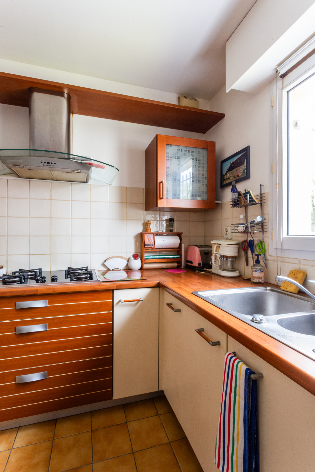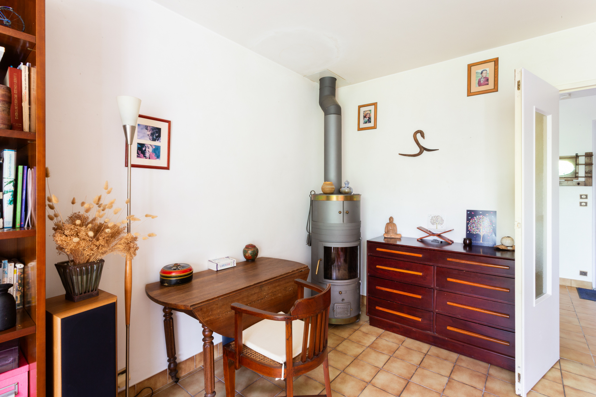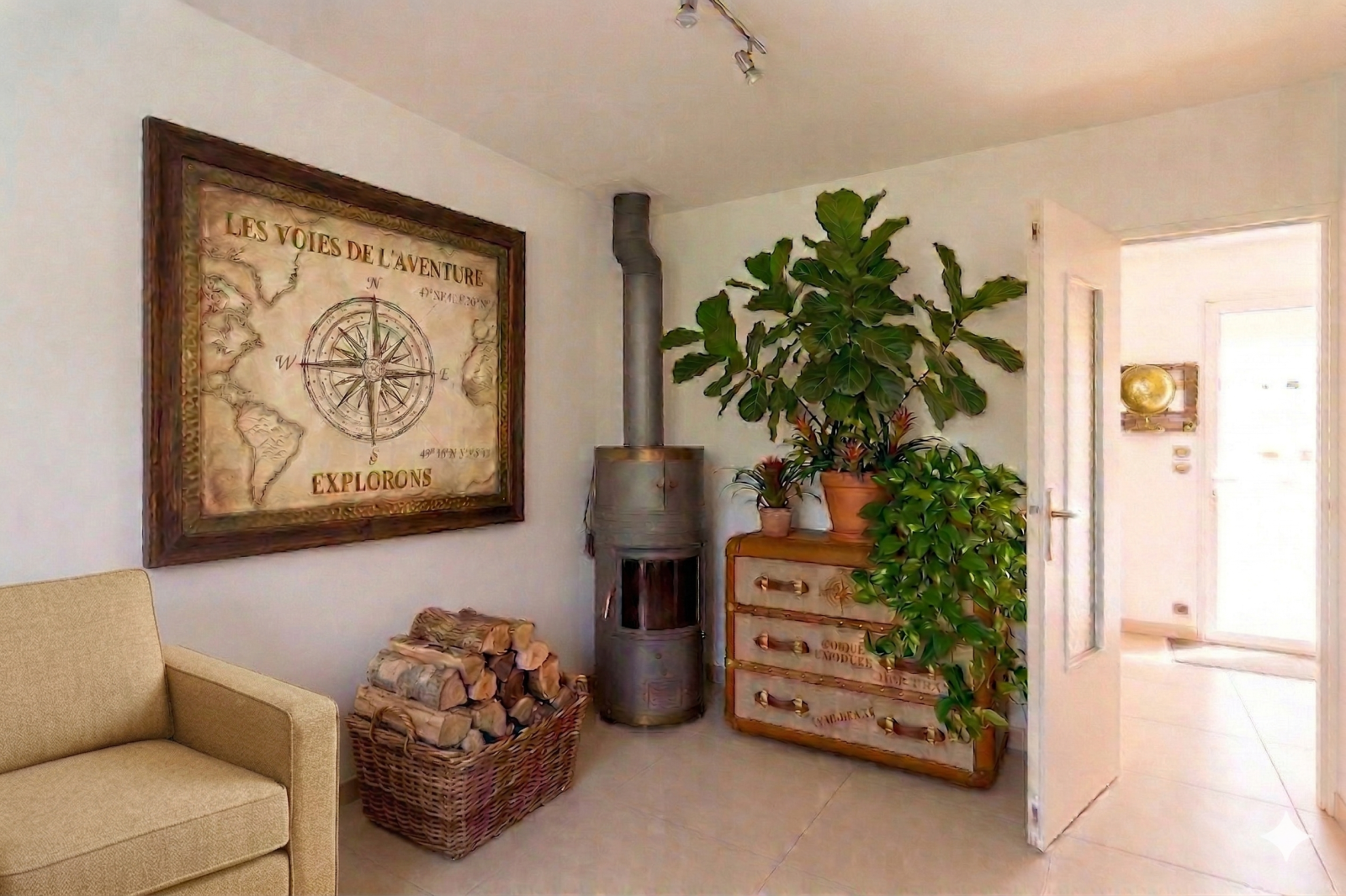 une cuisine aménagée et équipée, une chambre de plain-pied - précieuse - et un séjour baigné de lumière, réchauffé par un poêle à bois.