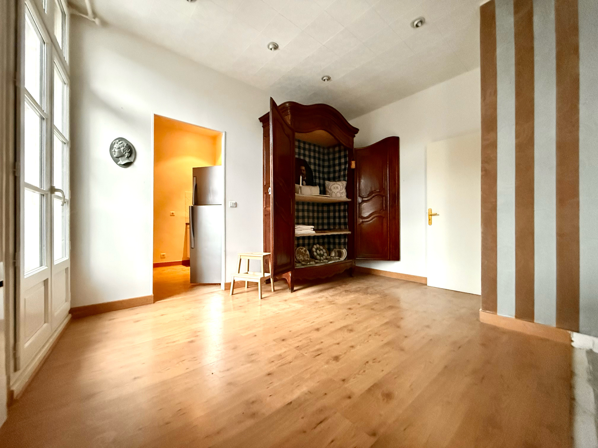 Situé dans les étages nobles de cet immeuble de caractère, il bénéficie de volumes très généreux, de belles hauteurs sous plafond et d’une luminosité remarquable grâce à de superbes ouvertures.