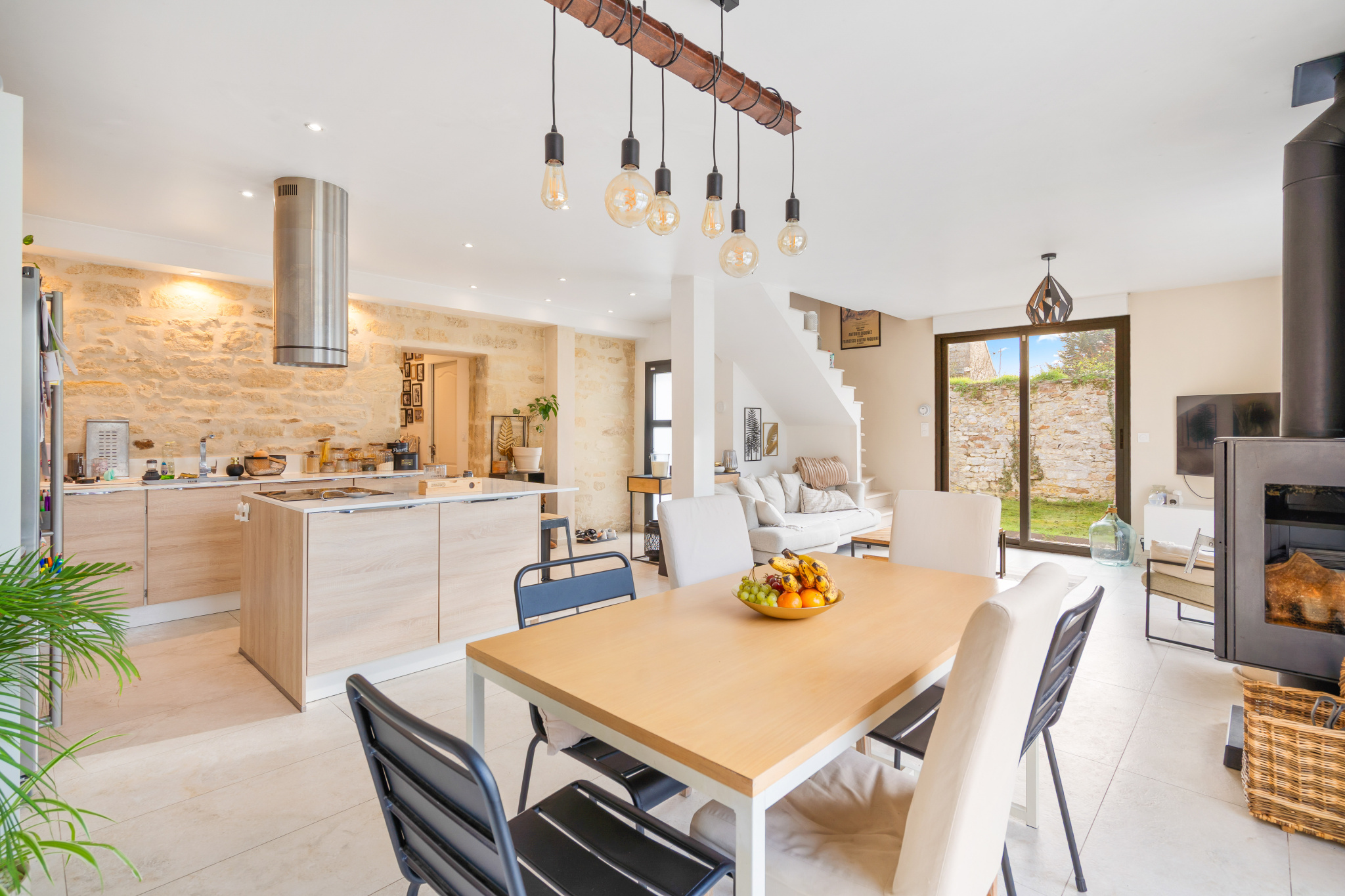 Au rez-de-chaussée, vous trouverez une belle pièce de vie d’environ 46 m² avec séjour ouvert sur une cuisine américaine aménagée et équipée (four, plaque 4 feux, hotte et lave-vaisselle), suite parentale avec baignoire, WC indépendants ainsi qu’une buanderie.