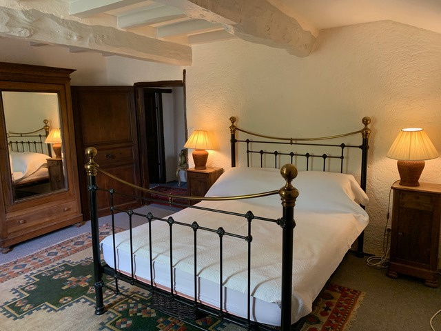 En poursuivant à l’étage, on découvre la seconde chambre d’amis ainsi que la suite parentale. La chambre d’amis, chaleureuse, est très accueillante, tandis que la suite parentale dispose de sa propre salle d’eau et de jolies vues sur le jardin pour se réveiller.