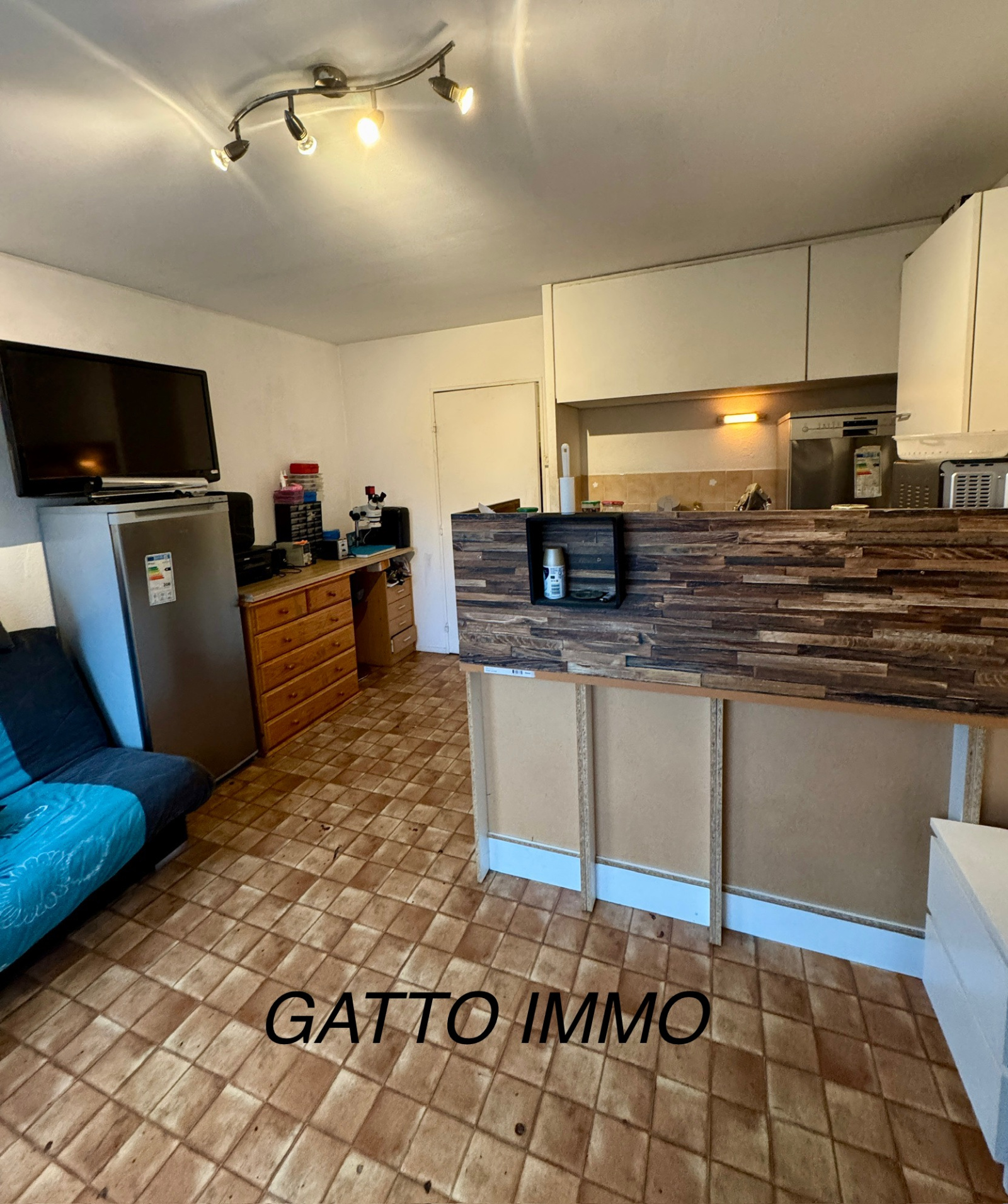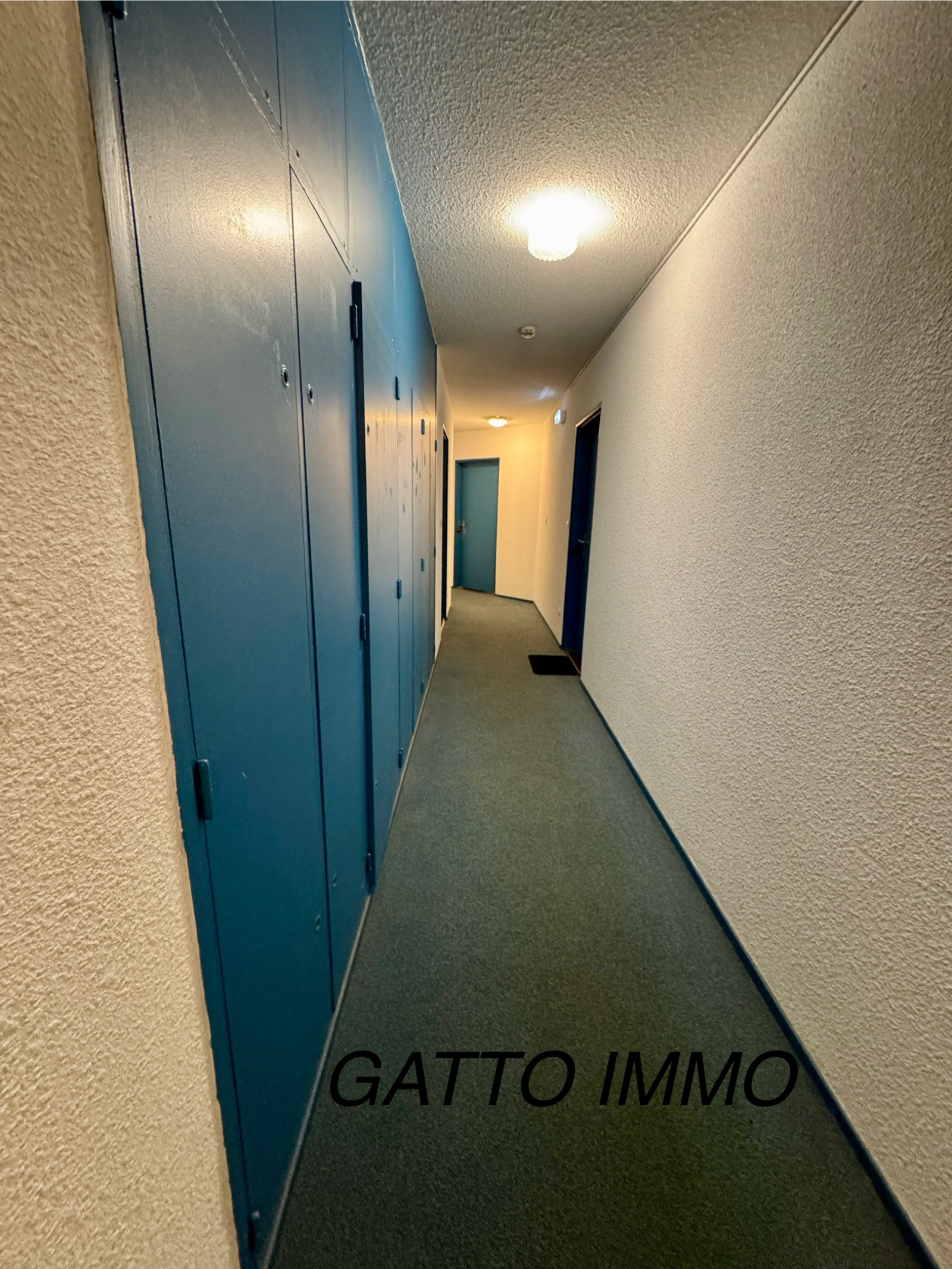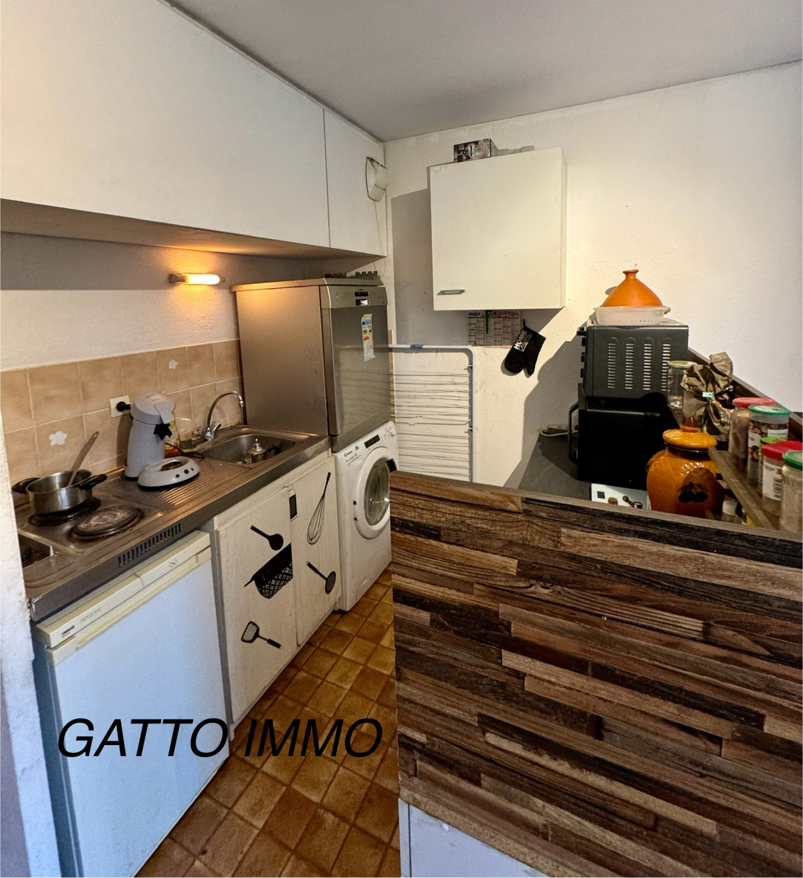 Ce logement au 1er étage offre une entrée avec placard, une pièce de vie ouverte sur une kitchenette et une salle de bain avec WC.