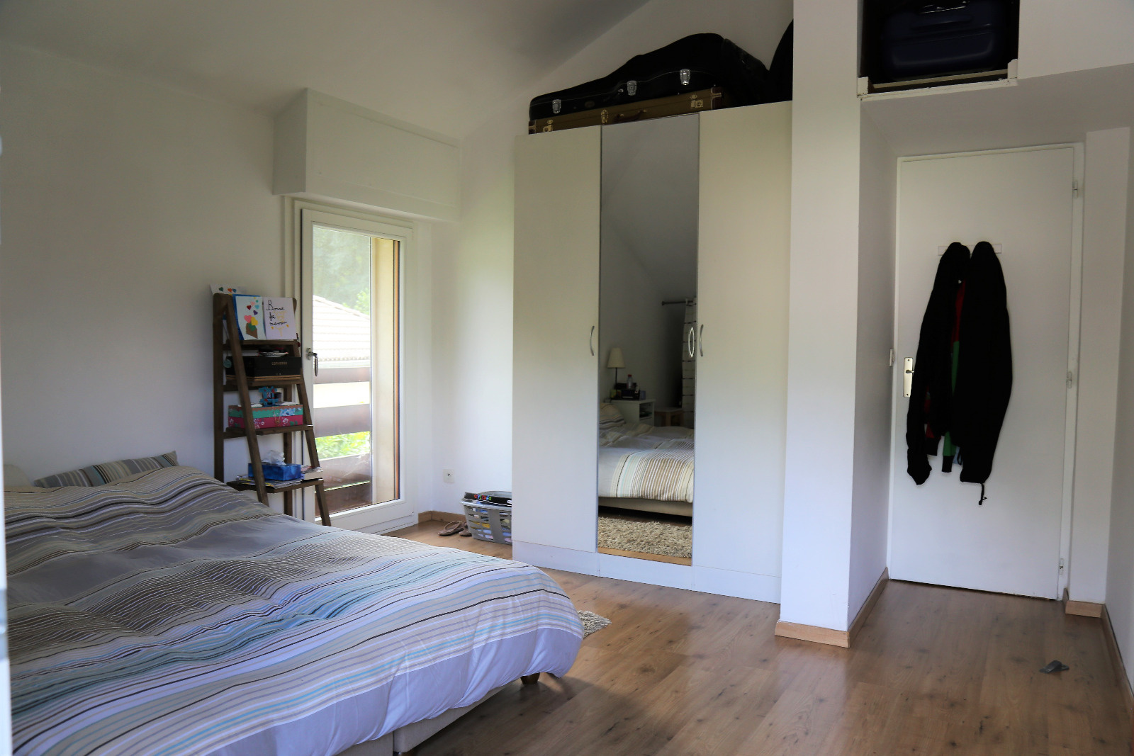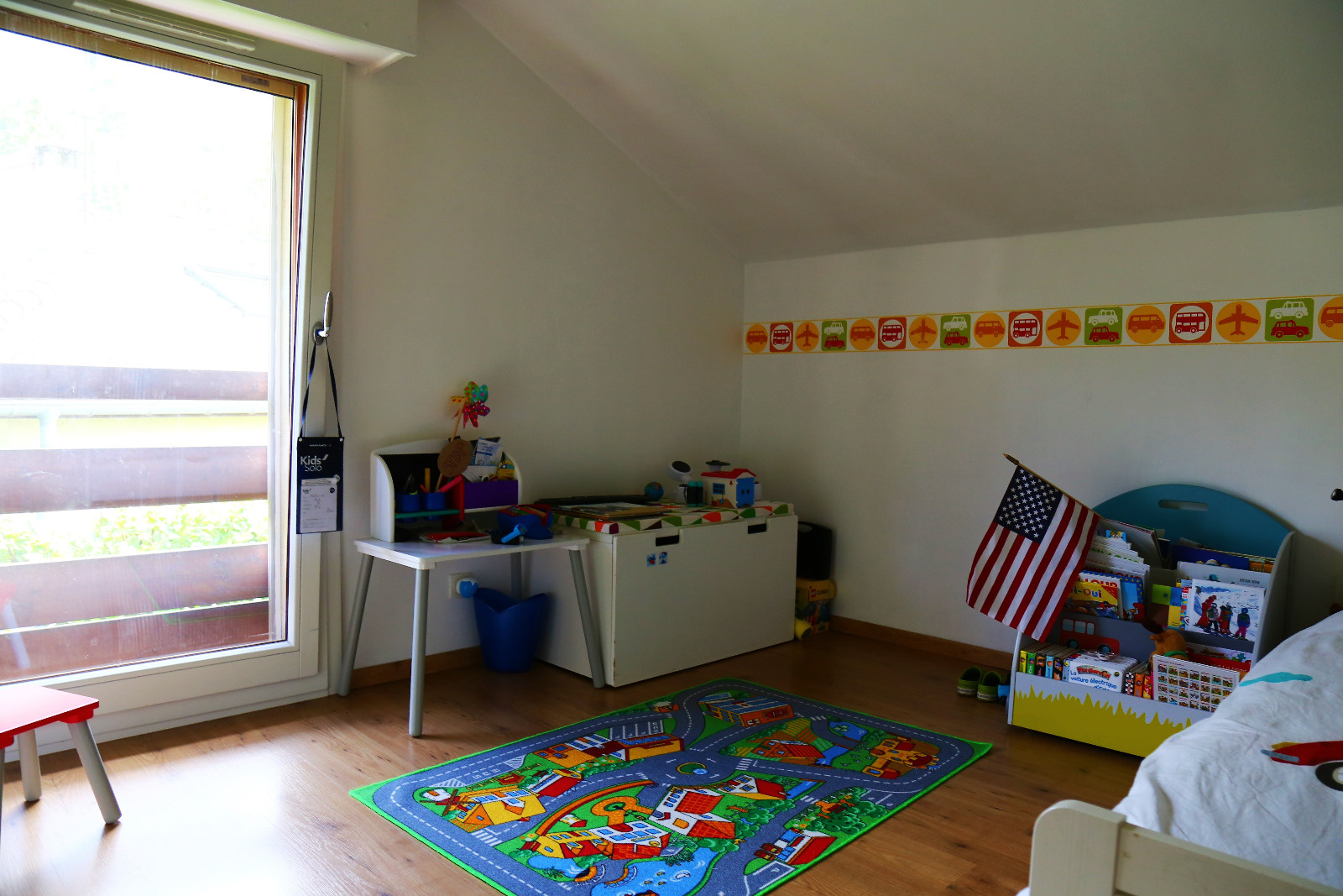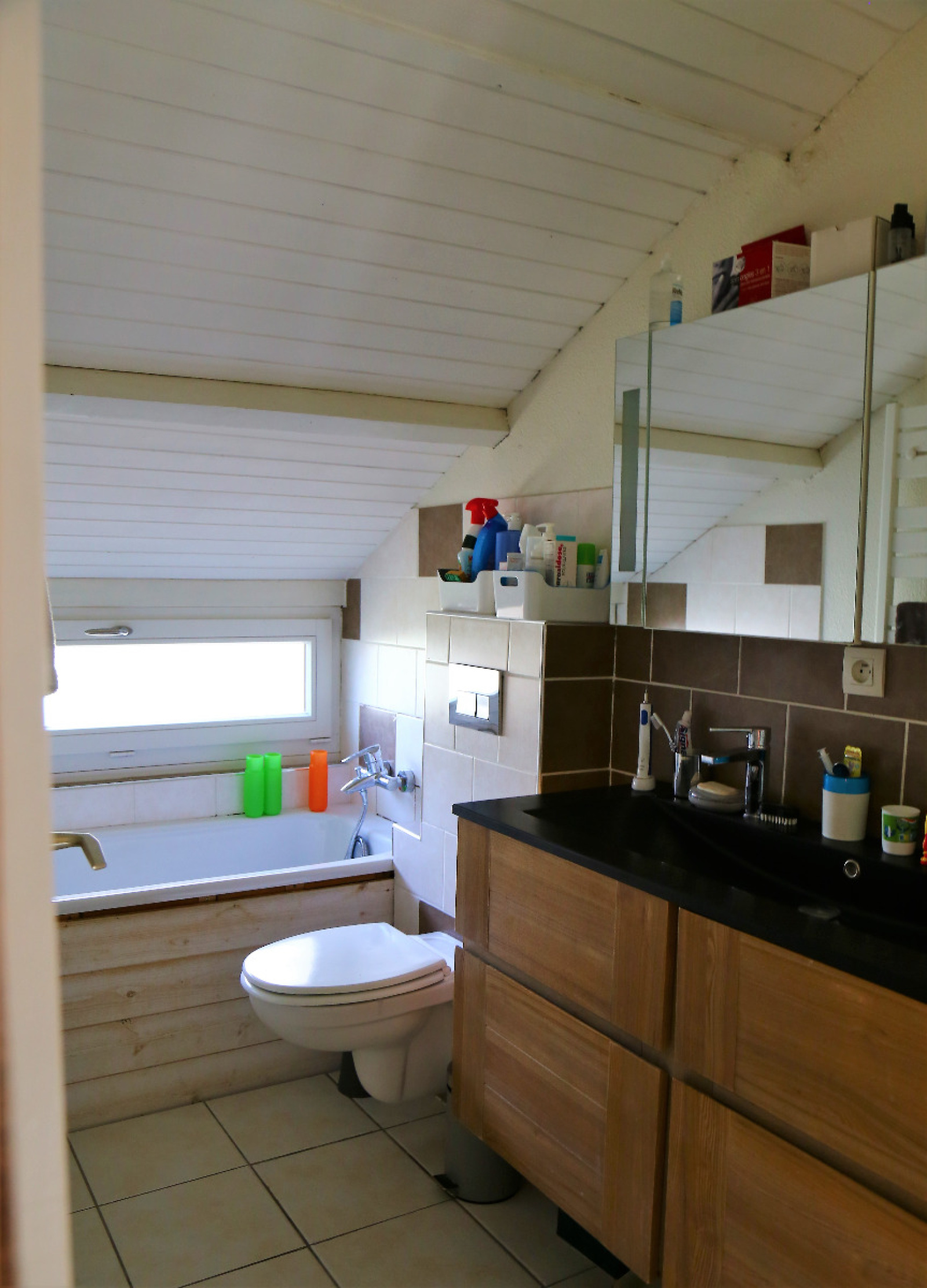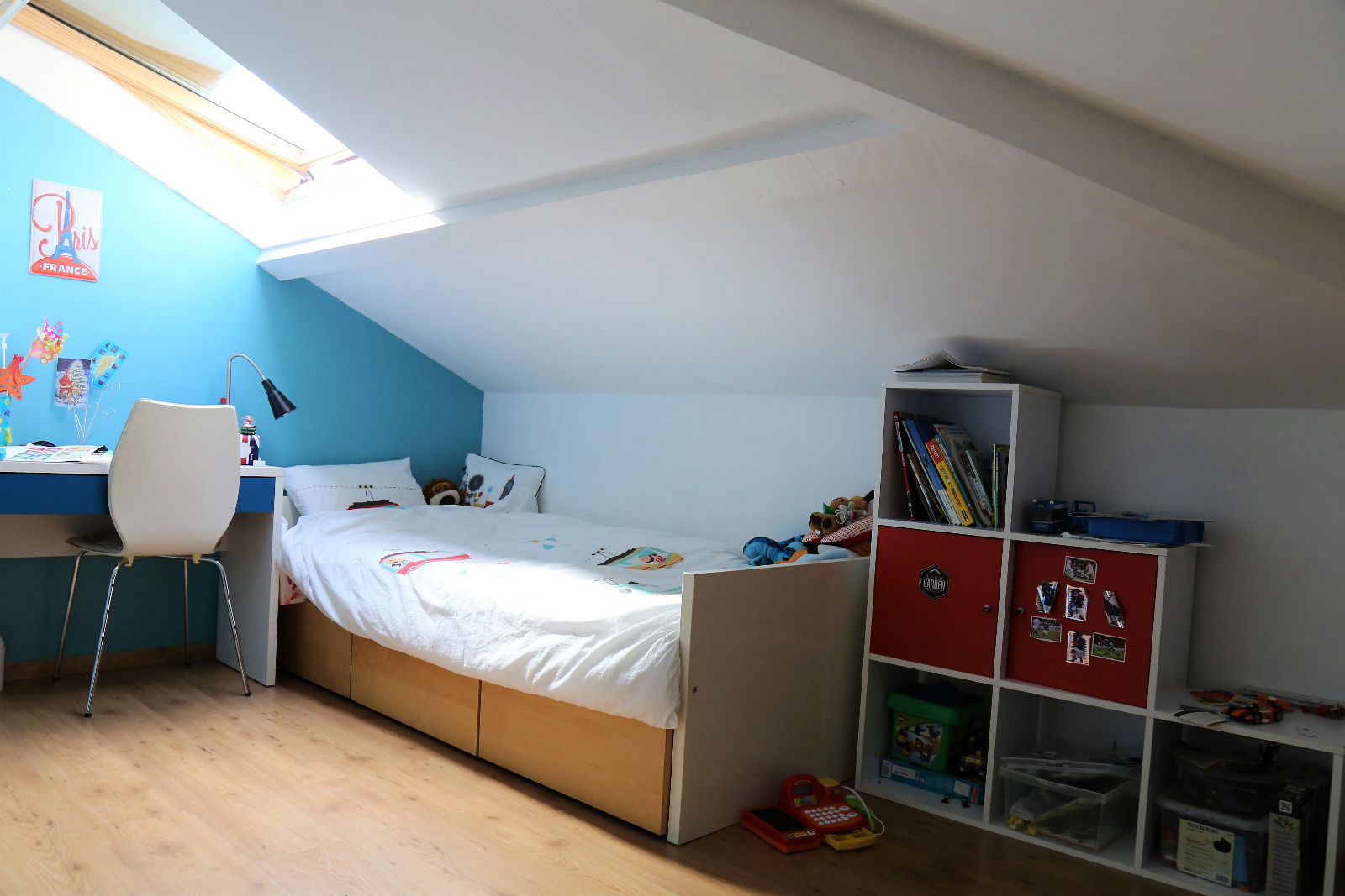 L'étage s'articule autour de 4 chambres dont une de moindre dimension, une salle de bain avec toilettes, une surface sous pente actuellement dédiée aux jeux des enfants.