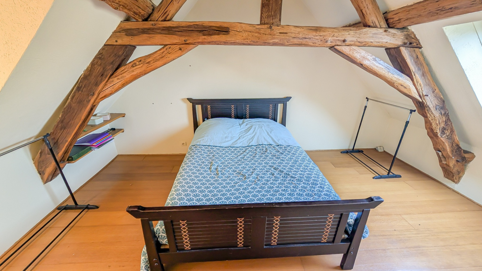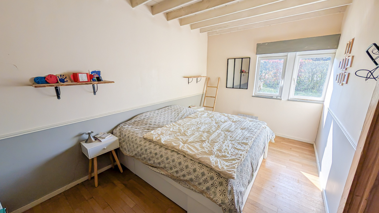 A l'étage, c'est deux espaces indépendants avec d'un côté, 2 chambres et une salle d'eau, et de l'autre, 2 chambres et un wc.