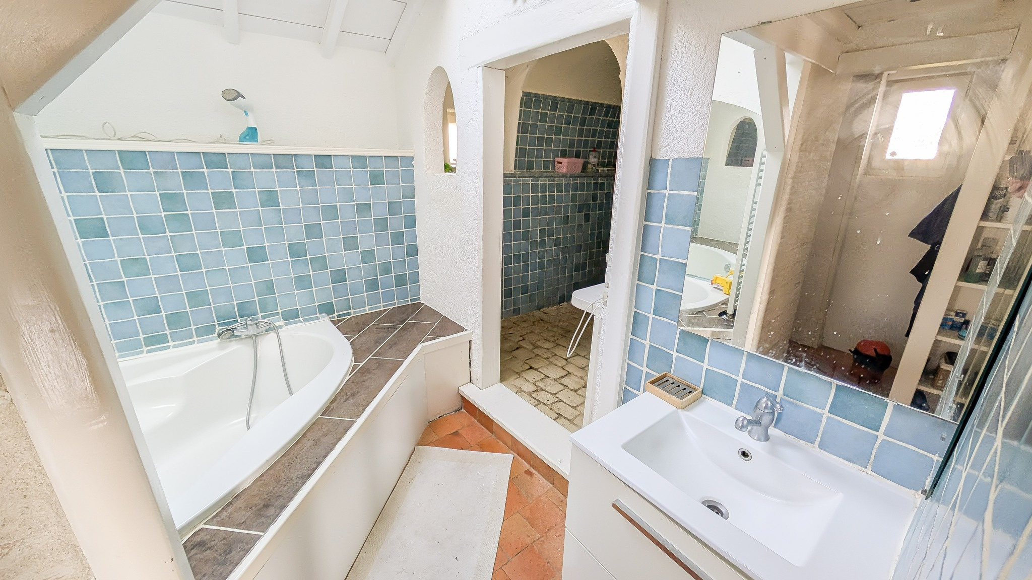 Elle est composée au rez-de-chaussée d'une cuisine aménagée et équipée qui dessert une pièce de vie de 35 m² avec une belle cheminée et un coin véranda, et une salle à manger de 27 m². Une chambre avec dressing, une salle de bain avec douche et baignoire ainsi qu'un wc et une buanderie complètent cet espace.