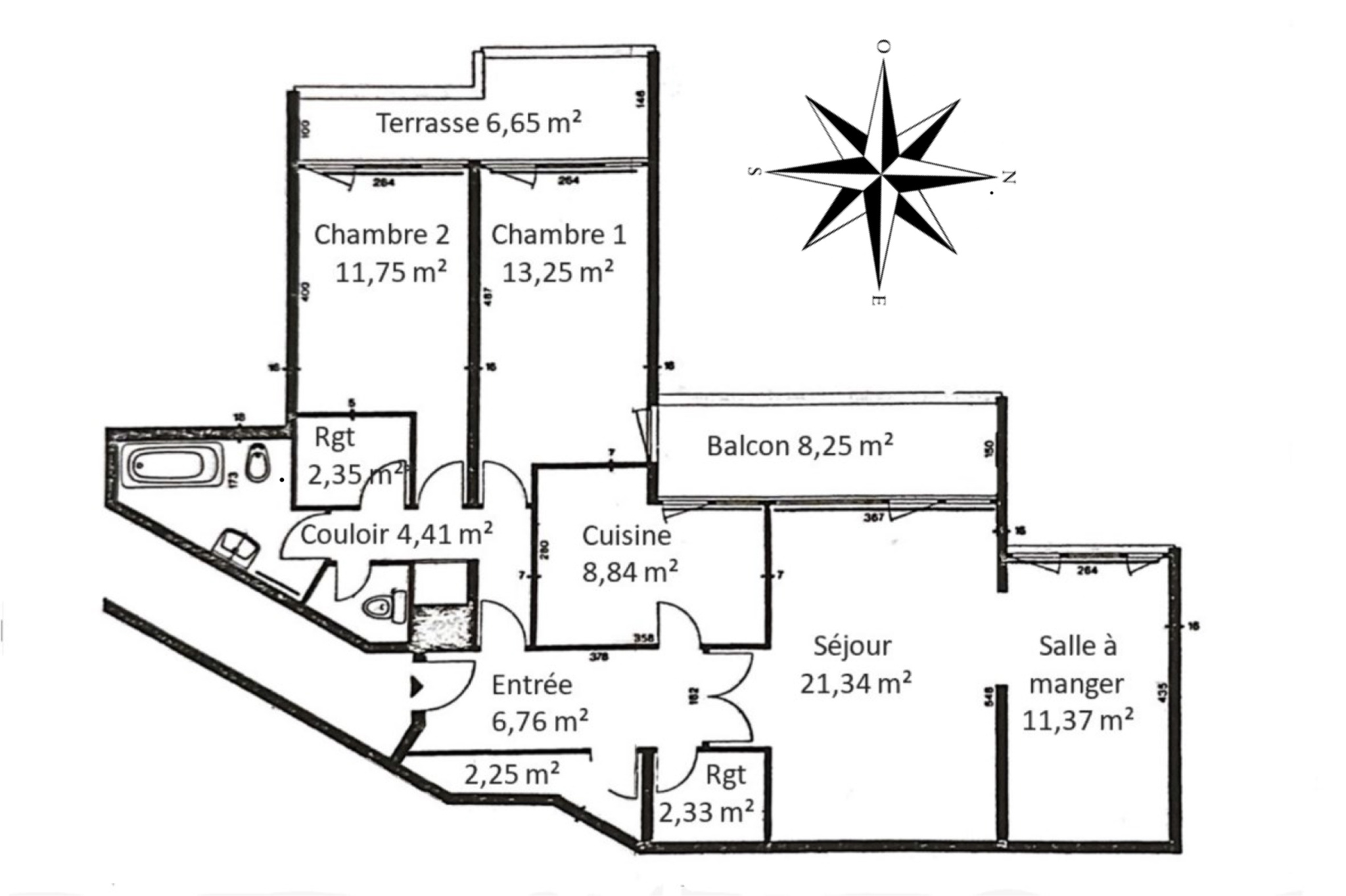 Cet appartement de 91,83 m² Carrez se compose d'une entrée avec deux rangements, d'un séjour, d'une salle à manger, d'une cuisine indépendante, d'un dégagement avec rangements, de deux chambres, d'une salle de bain, de WC indépendants, d’un balcon de 8,25 m² accessible du séjour et de la cuisine, d’une terrasse de 6,65 m² accessible des deux chambres et d’un box fermé double de 11,33 m sur 2,62 m