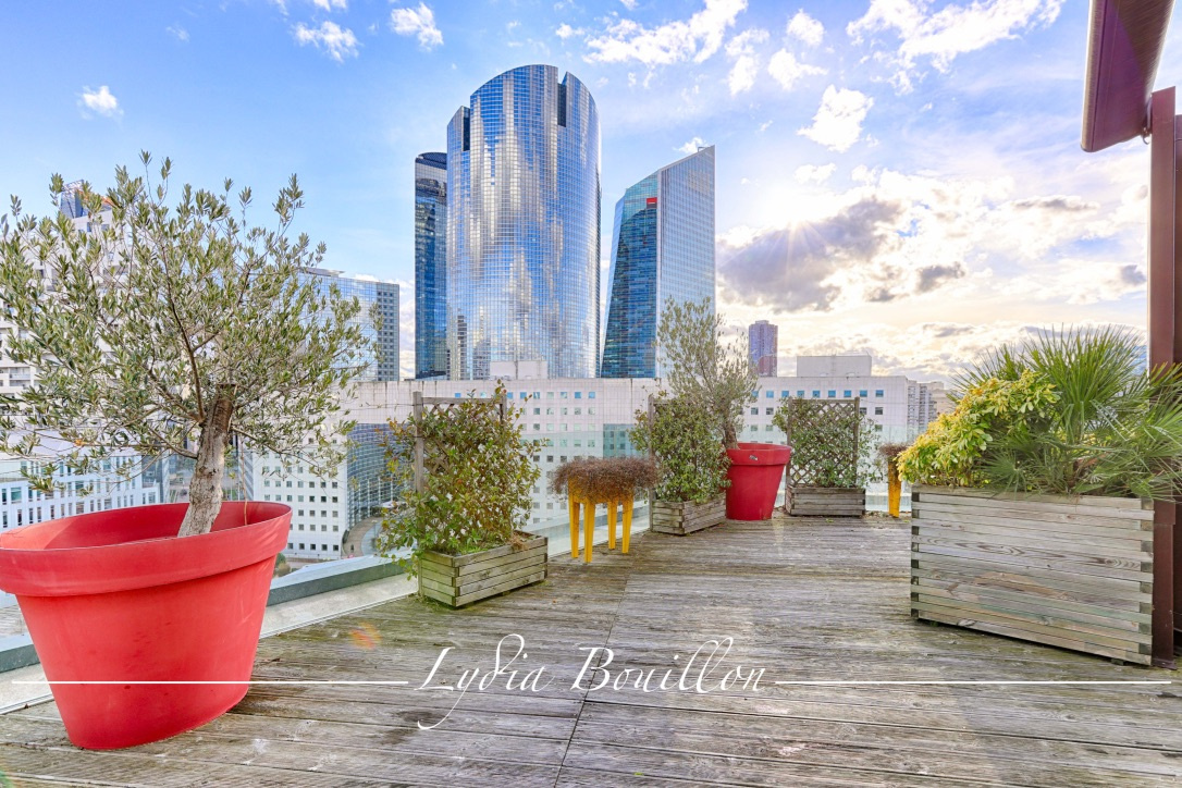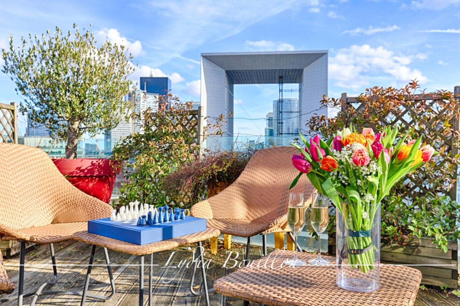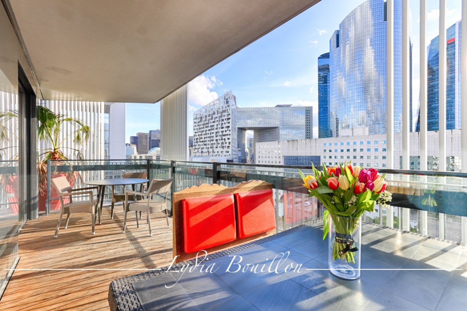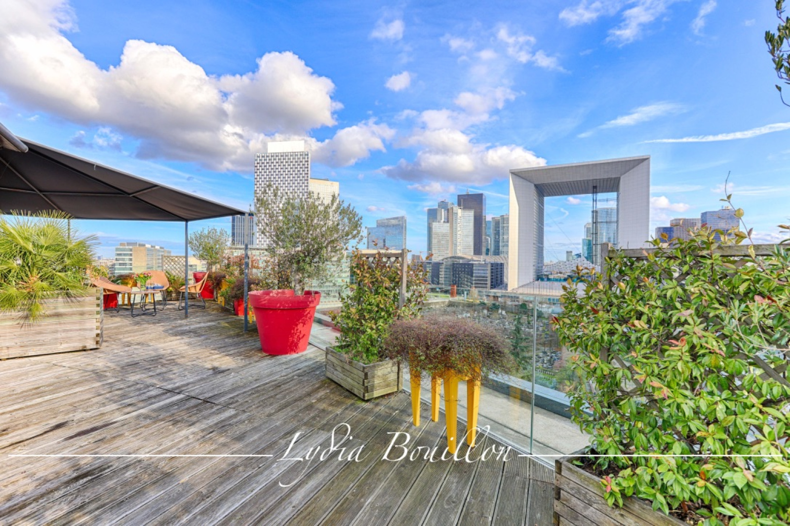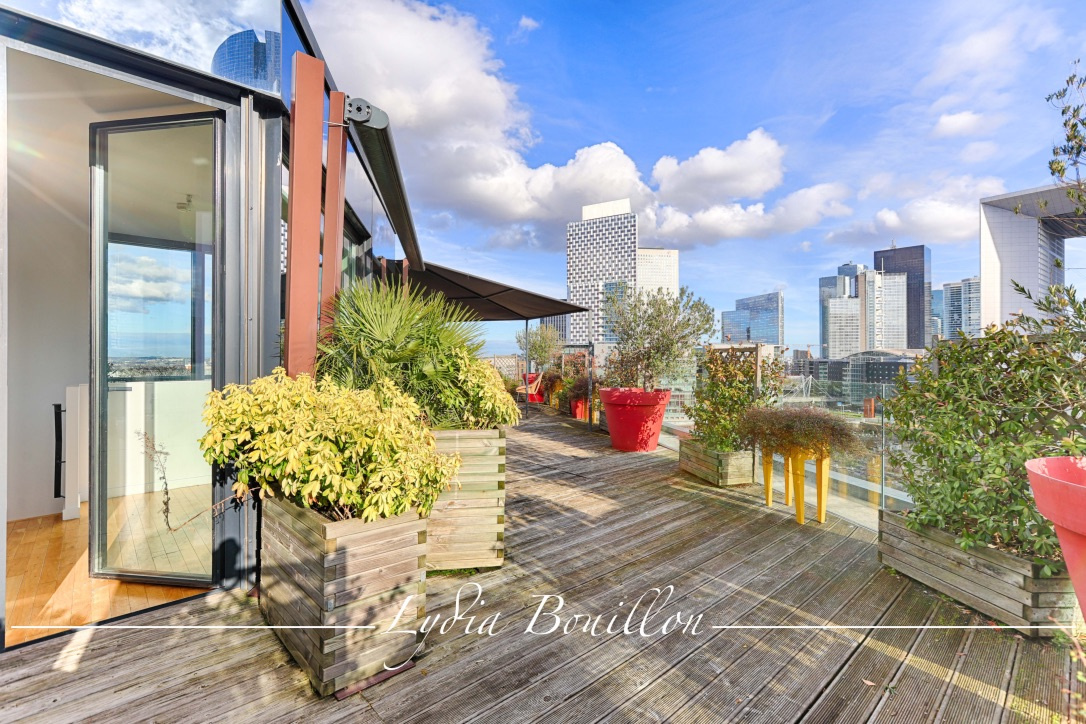 LA DEFENSE, Au pied de l'Arche de la Défense, dans un bel immeuble contemporain, de grand standing, vous serez assurément séduits par cet appartement en duplex et dernier étage, unique avec sa vue exceptionnelle et sa triple exposition. Au dernier étage une terrasse de 75 m2 vous permettra de recevoir vos convives, vous pourrez également faire une cuisine d'été ou un agréable bureau dans l'actuel salon d'hiver.