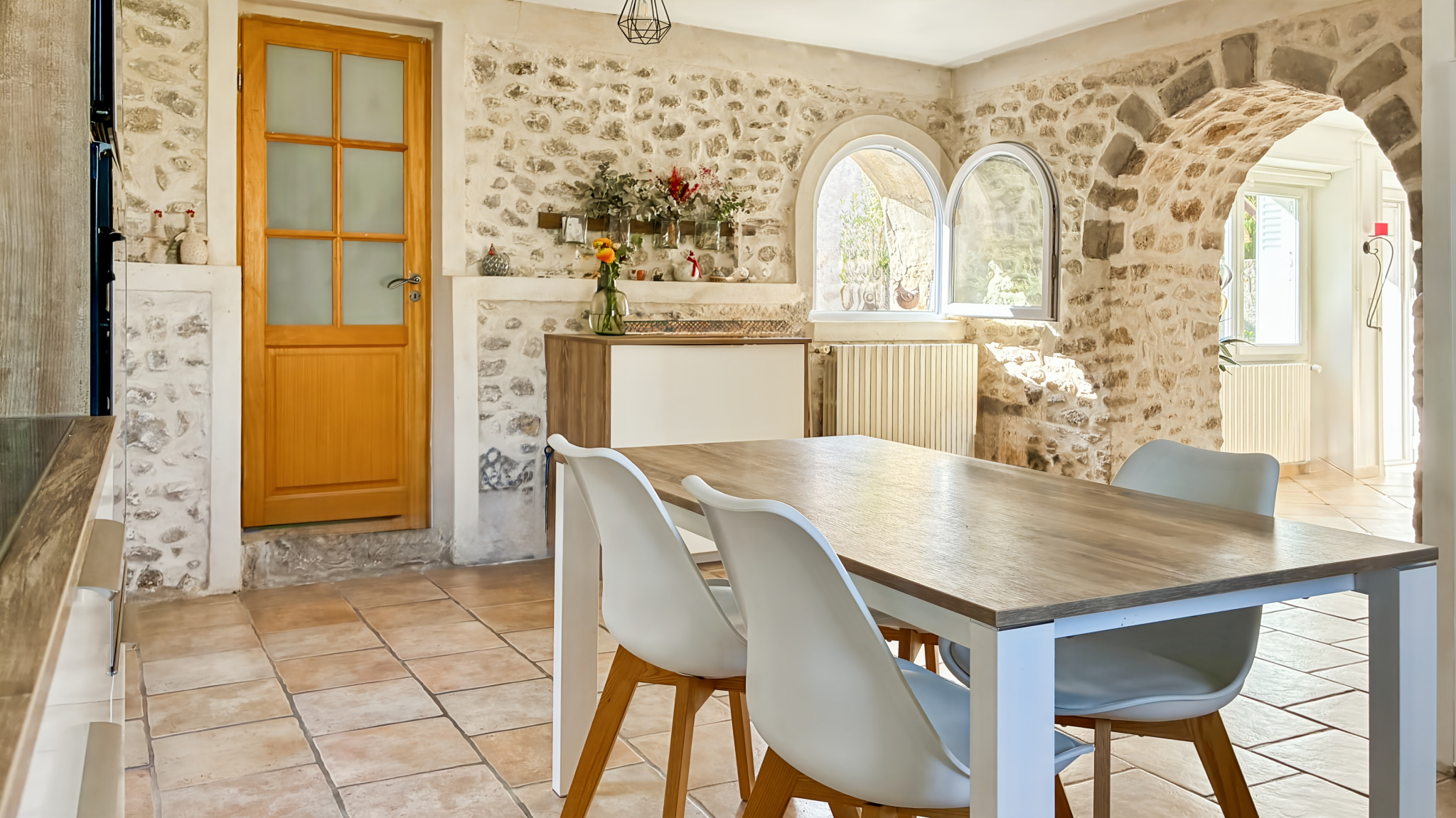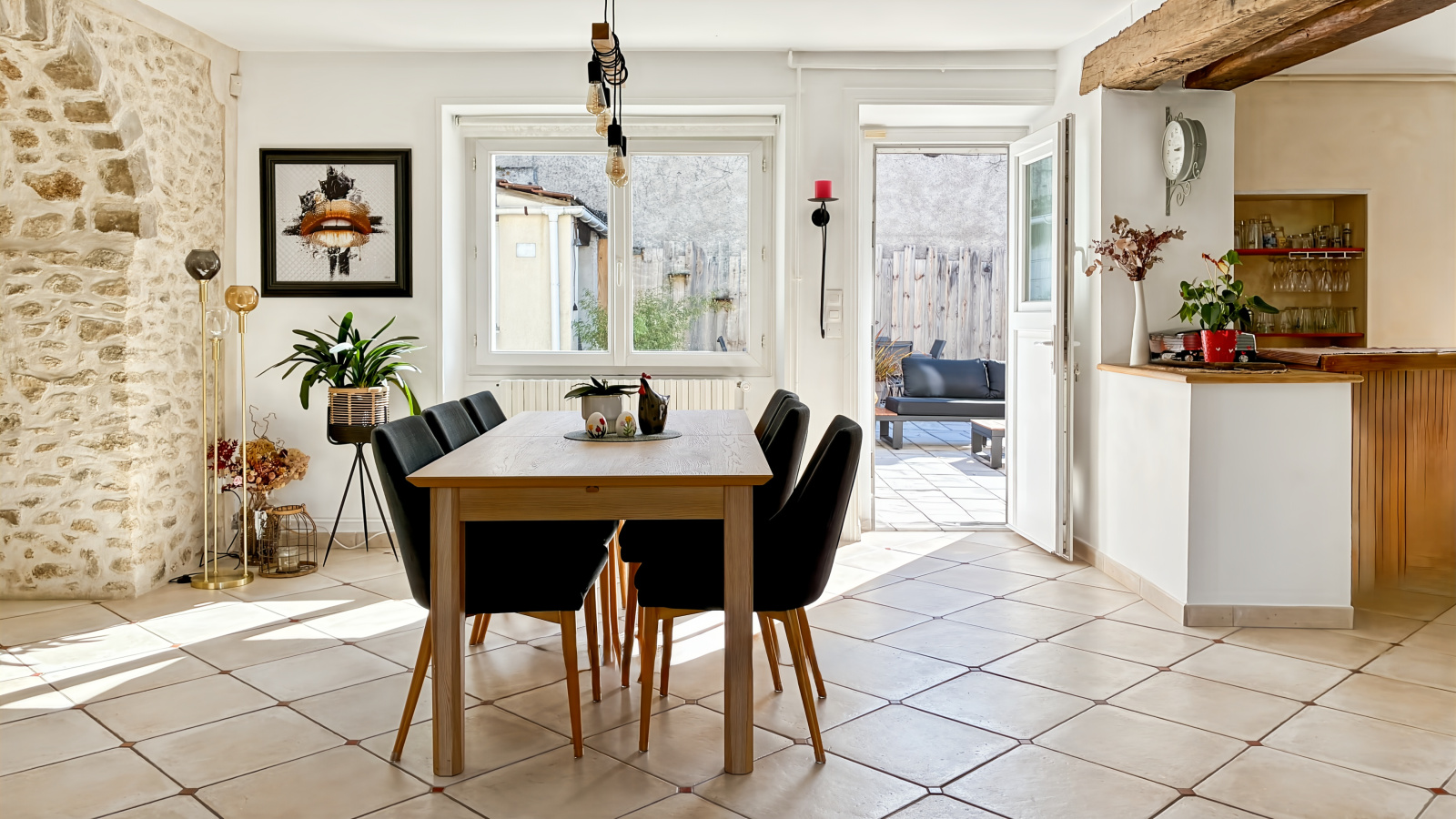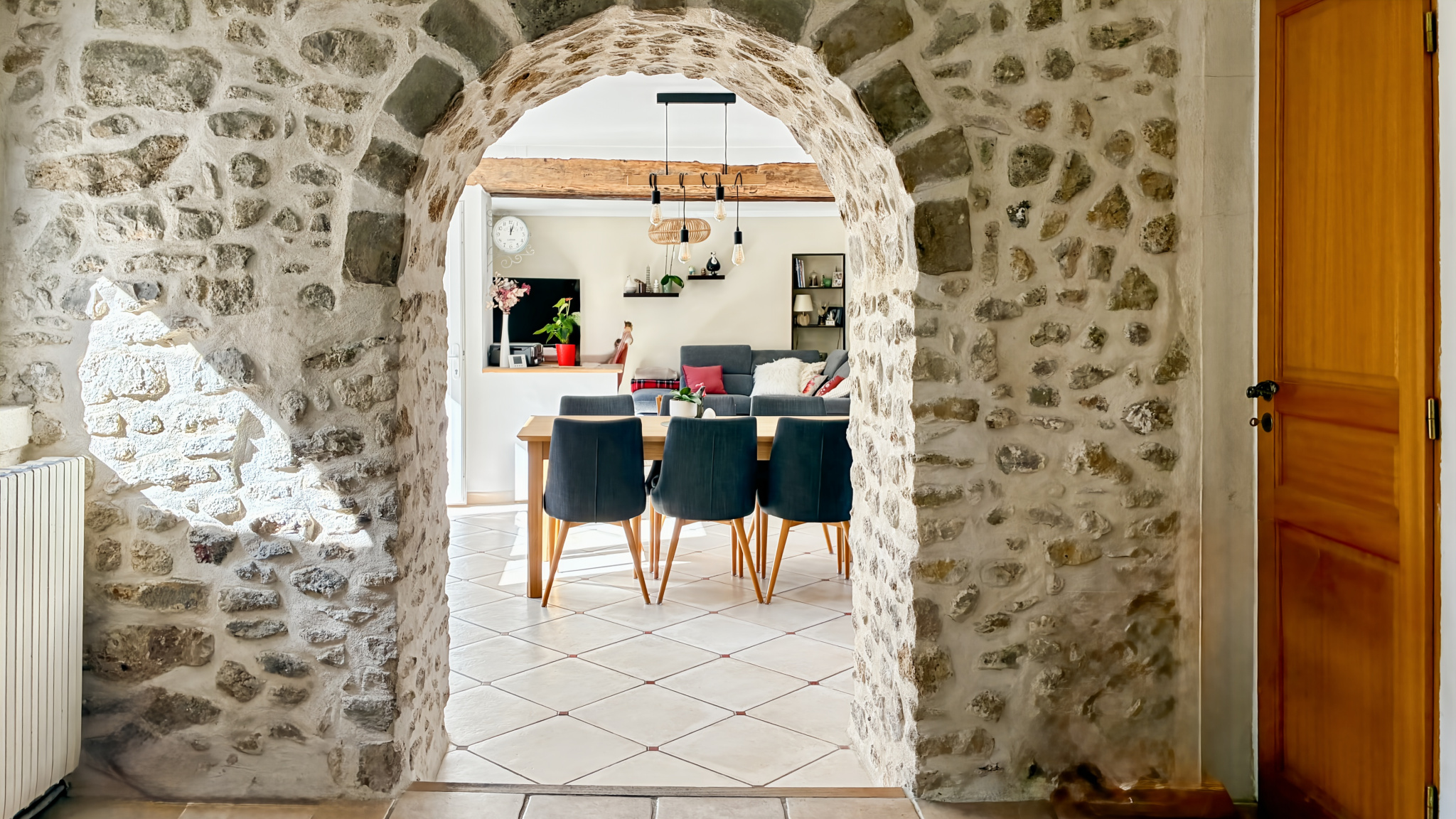 Le rez-de-chaussée s’organise avec simplicité autour des espaces de vie. L’entrée mène directement à la salle à manger et au salon, formant ainsi 42m² de pièces traversées par la lumière et ponctuées de poutres apparentes, des murs en pierres, qui structurent l’espace sans l’alourdir. Depuis la salle à manger, la terrasse orientée plein sud prolonge naturellement la maison vers l’extérieur et ouvre la perspective.