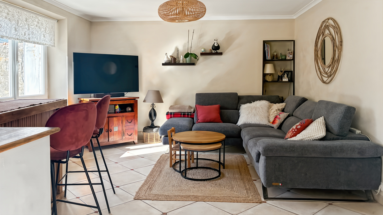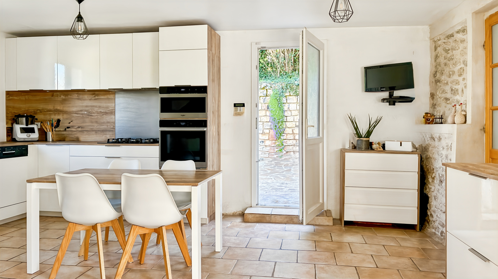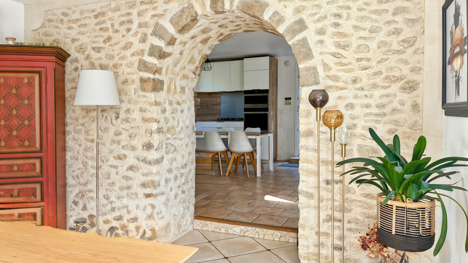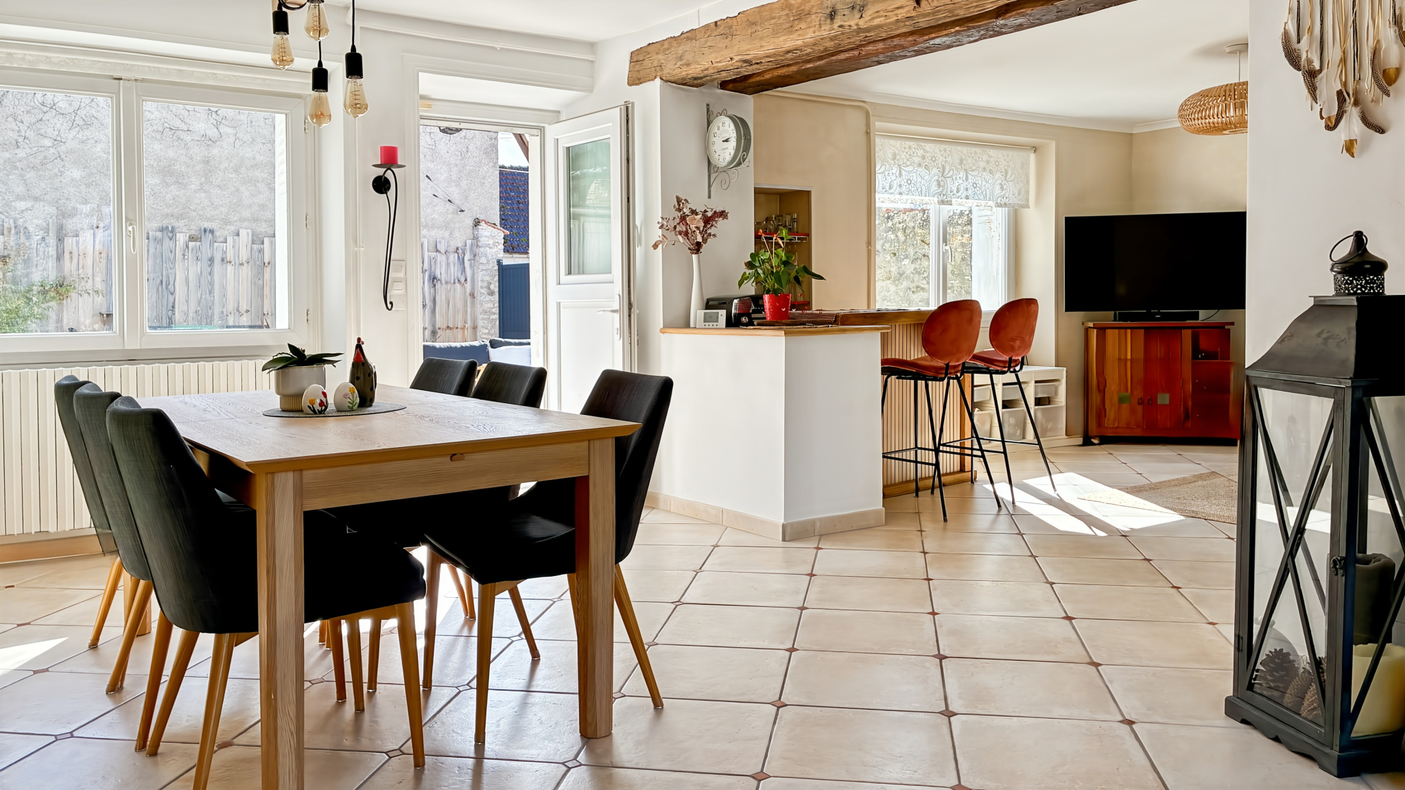 Le rez-de-chaussée s’organise avec simplicité autour des espaces de vie. L’entrée mène directement à la salle à manger et au salon, formant ainsi 42m² de pièces traversées par la lumière et ponctuées de poutres apparentes, des murs en pierres, qui structurent l’espace sans l’alourdir. Depuis la salle à manger, la terrasse orientée plein sud prolonge naturellement la maison vers l’extérieur et ouvre la perspective.