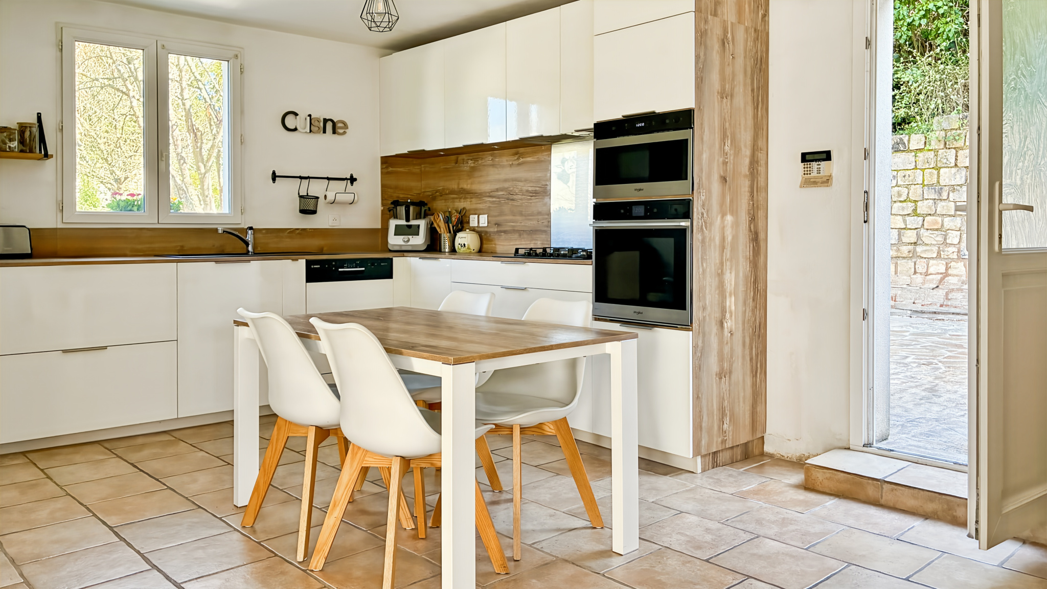 La cuisine constitue l’un des atouts de la maison. Réalisée dans le cadre d’une extension récente, elle développe 27 m² et prend la place d’une véritable pièce de vie. Semi-ouverte sur la salle à manger, elle offre un espace généreux pour cuisiner, recevoir ou simplement partager les repas du quotidien. Son volume et sa clarté apportent un suplément à l’ensemble du rez-de-chaussée.