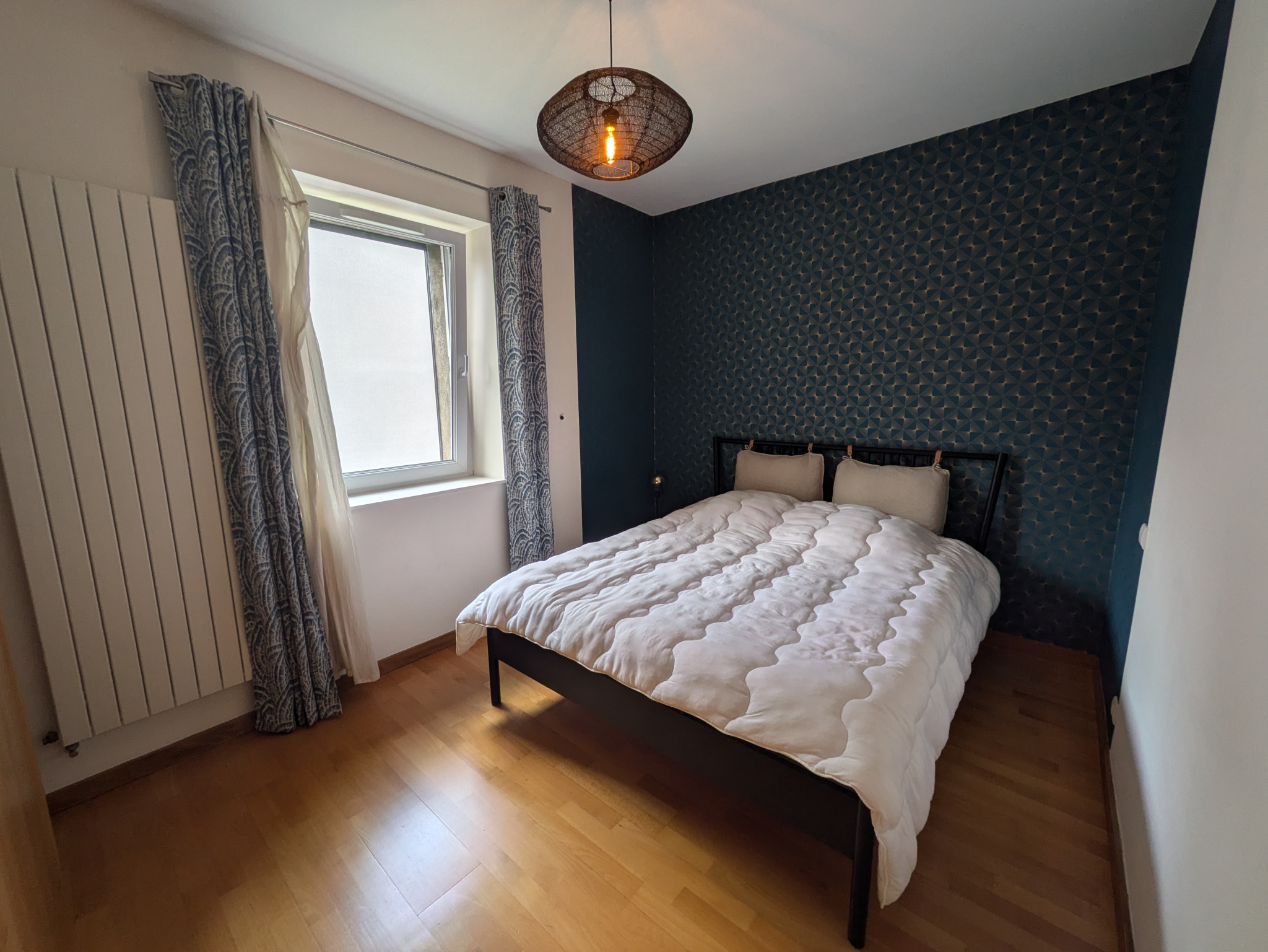 À l'étage : Pièce de vie lumineuse, équipée d'un poêle mixte bois/granulés Max Blank.