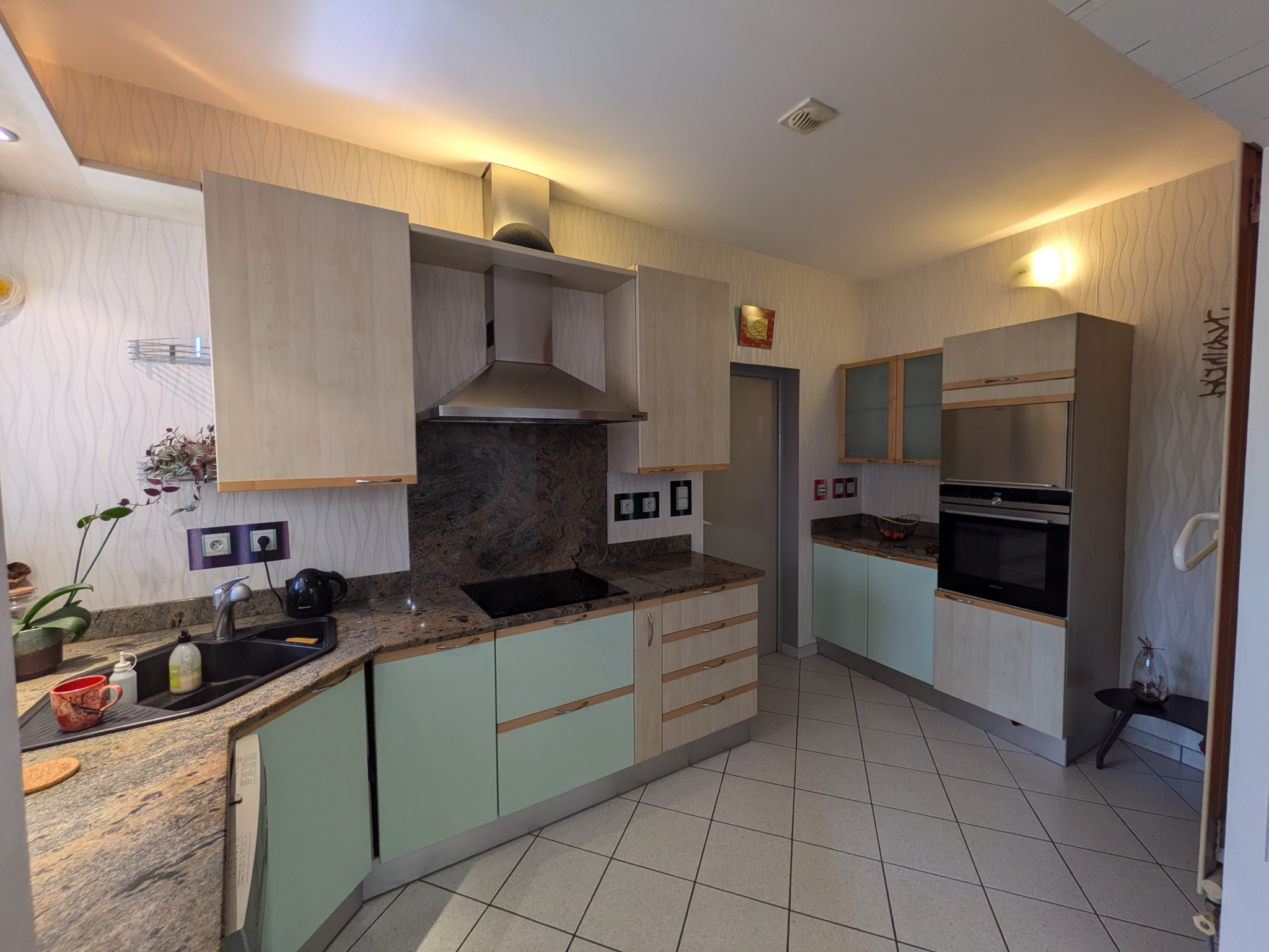 Cuisine ouverte et équipée avec un cellier attenant .
