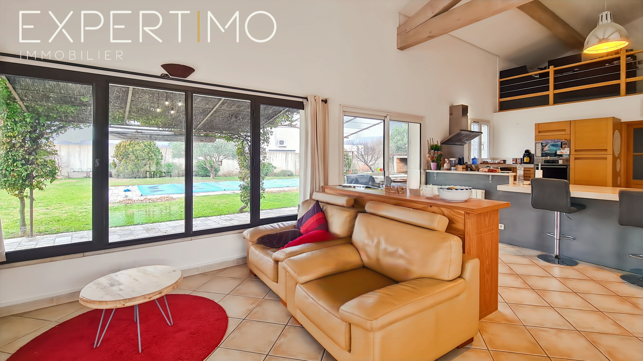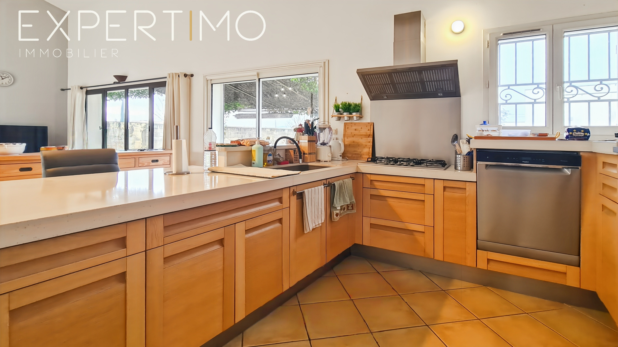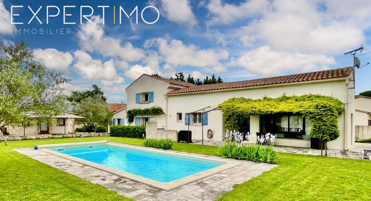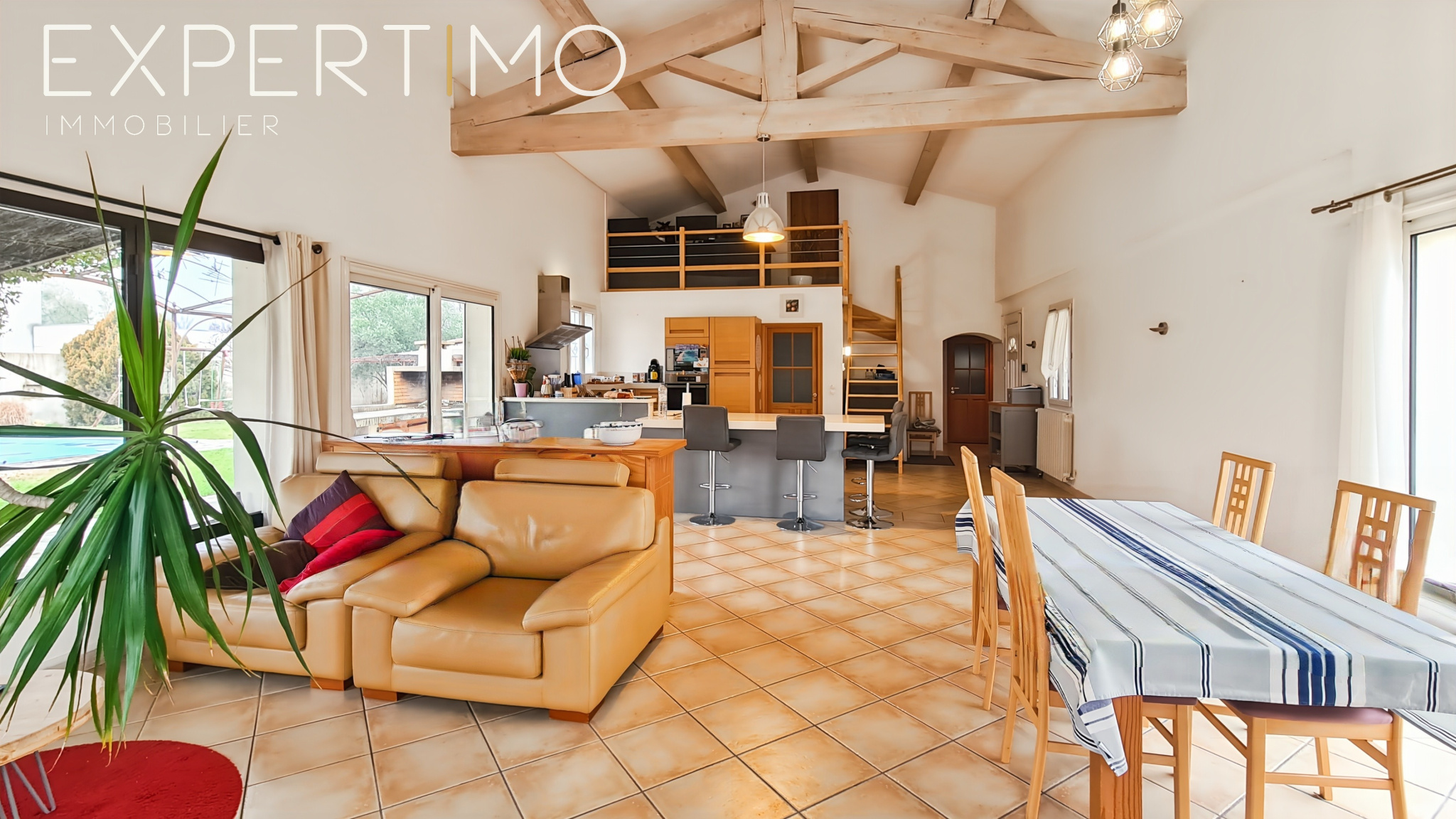 EXCLUSIVITE : Maison avec piscine sur un terrain de 1300 m² comprenant au rez-de-chaussée : un grand espace de vie de 60 m² avec cuisine américaine, trois chambres, un bureau, une salle d'eau, un cellier / buanderie et un wc.