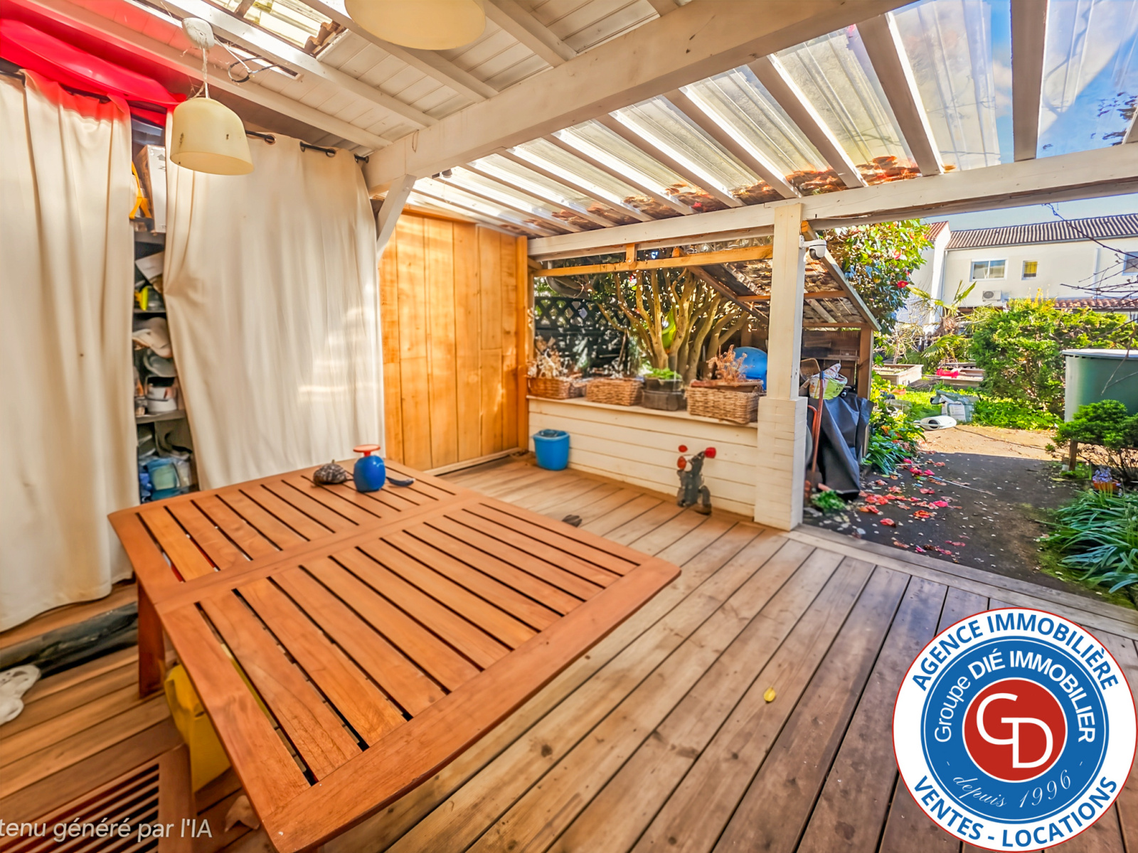 Jardin devant et derrière et grande terrasse couverte.