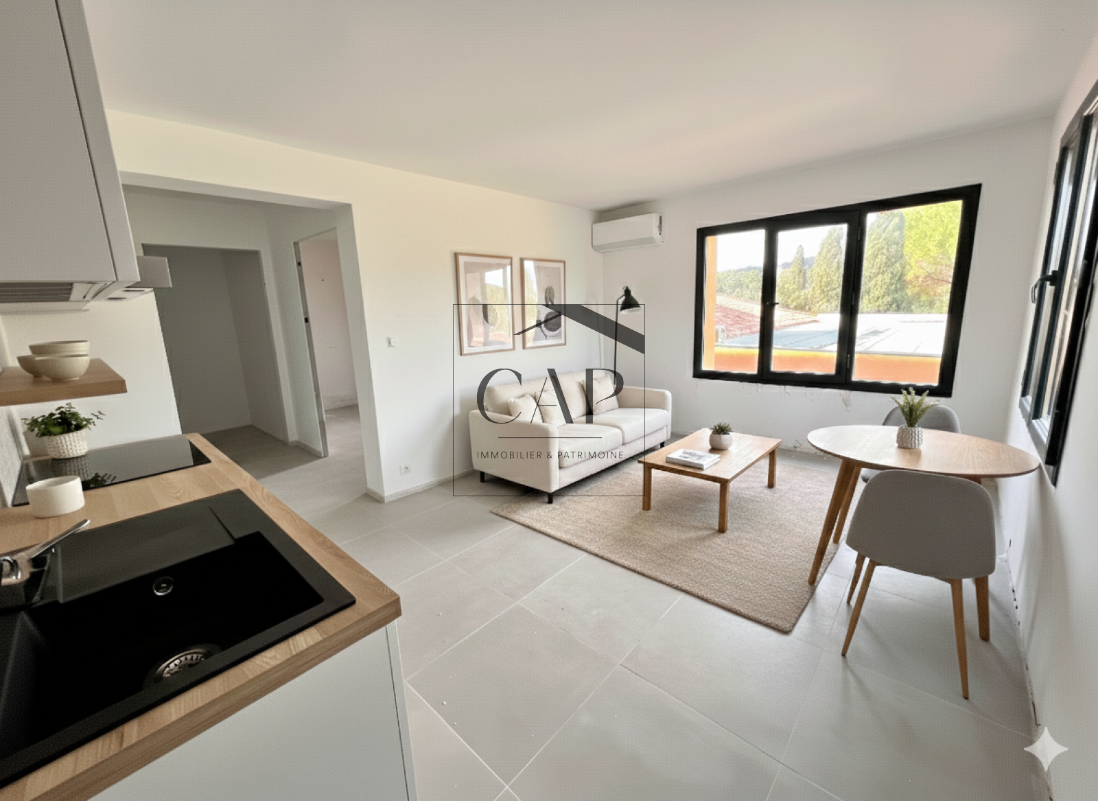 Une belle pièce de vie avec cuisine ouverte équipée de 20m² Une grande chambre de 12m² avec dressing séparé Une spacieuse salle d’eau Une vue dégagée sur la nature environnante et le maquis, au calme