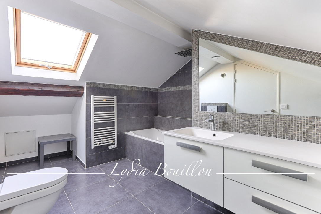 À l’étage, l’espace nuit se distingue par une chambre avec dressing sur mesure, et une salle de bains élégante avec toilettes, intégrant un emplacement pour machine à laver.