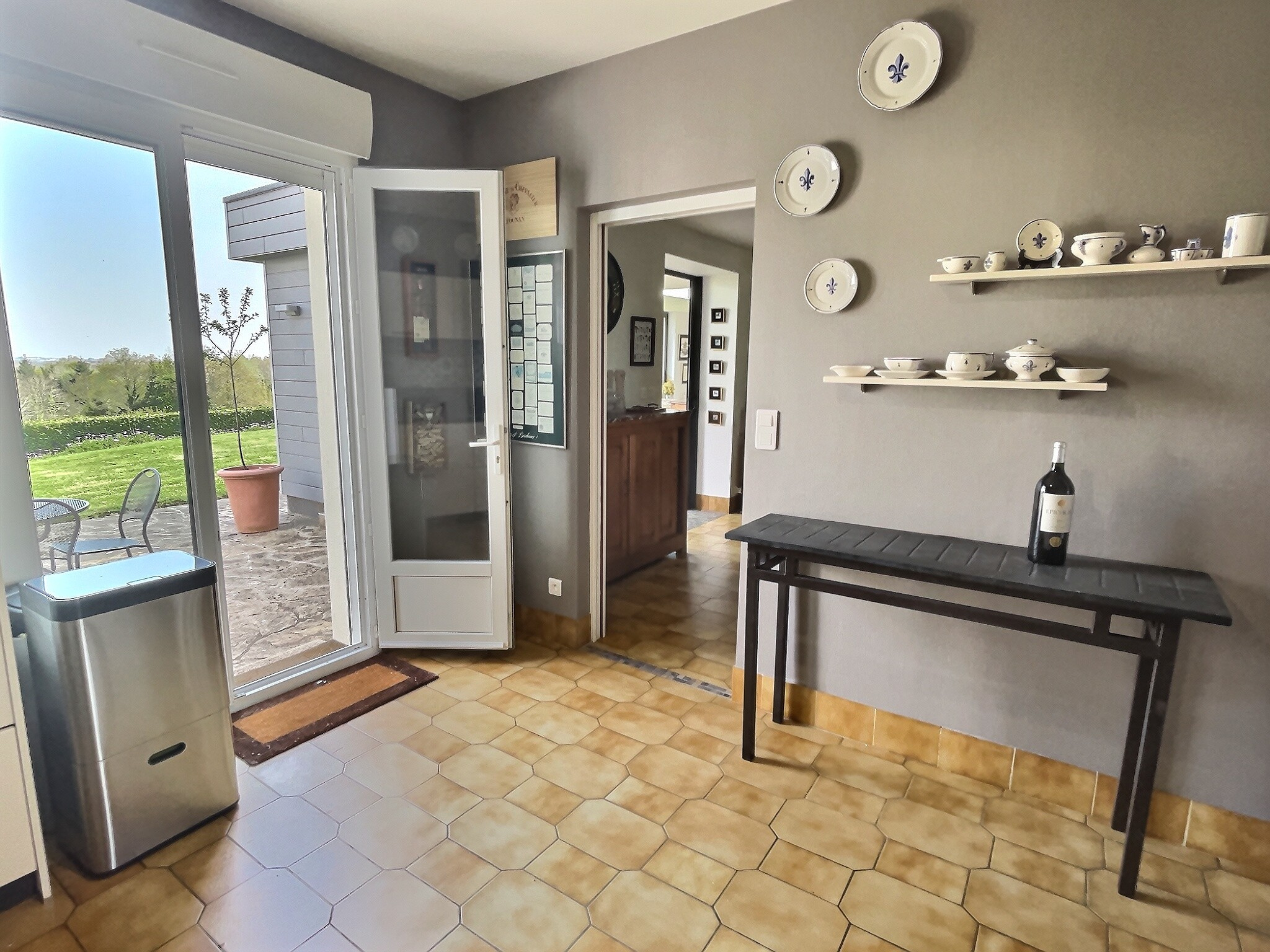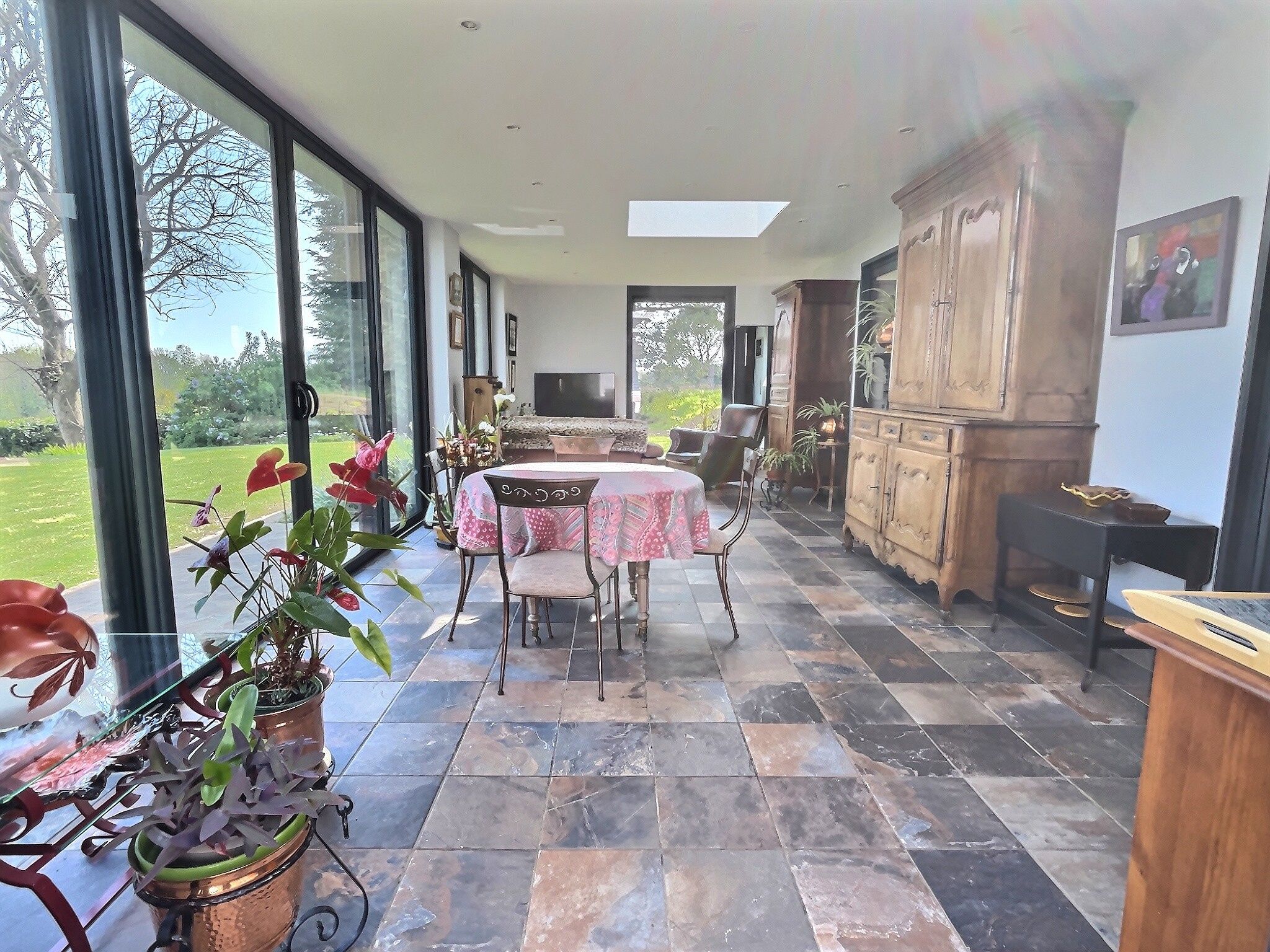 Une belle extension a apporté un réel confort autant par sa luminosité que par sa superficie. Aujourd’hui la pièce principale ouverte sur la magnifique campagne quimpéroise est idéale pour recevoir de grandes tablées. De grandes baies vitrées donne accès à la terrasse exposée Sud, bien protégée.