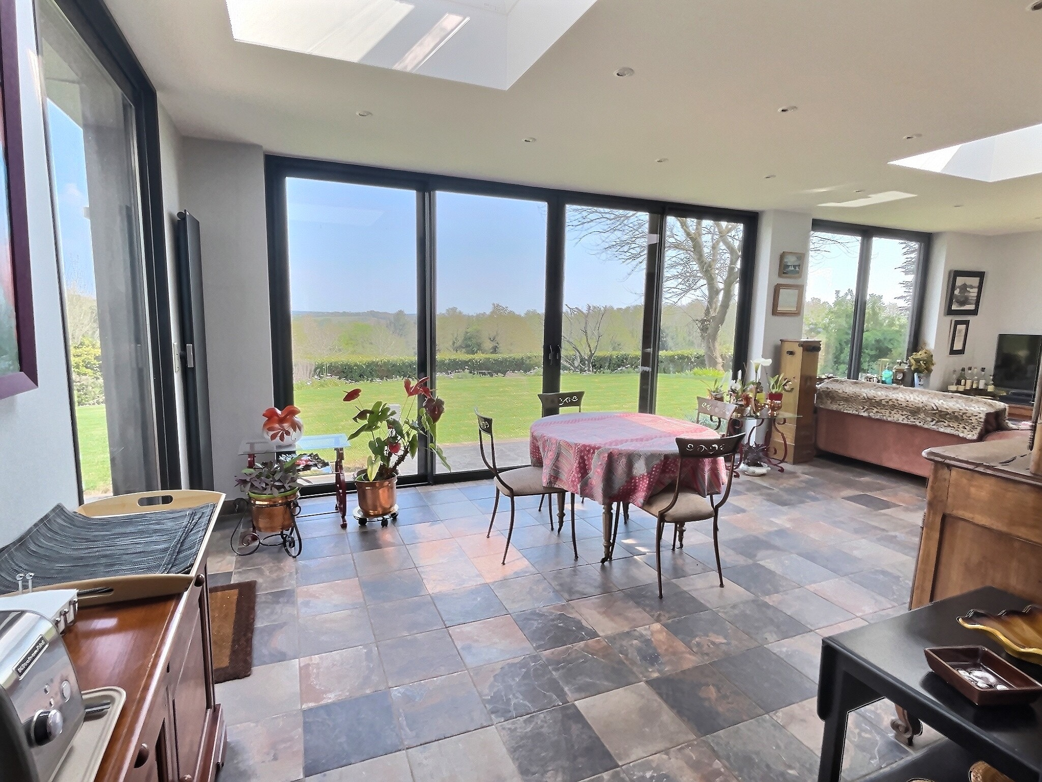 Que ça soit dans le salon traditionnel avec une magnifique cheminée, la salle à manger ou dans le second salon et salle à manger de réception avec ouvertures Sud et Ouest, vous profitez toujours d’une vue magnifique sur un extérieur verdoyant. La vue est vraiment imprenable alors que nous sommes à moins de 10 minutes de Quimper.