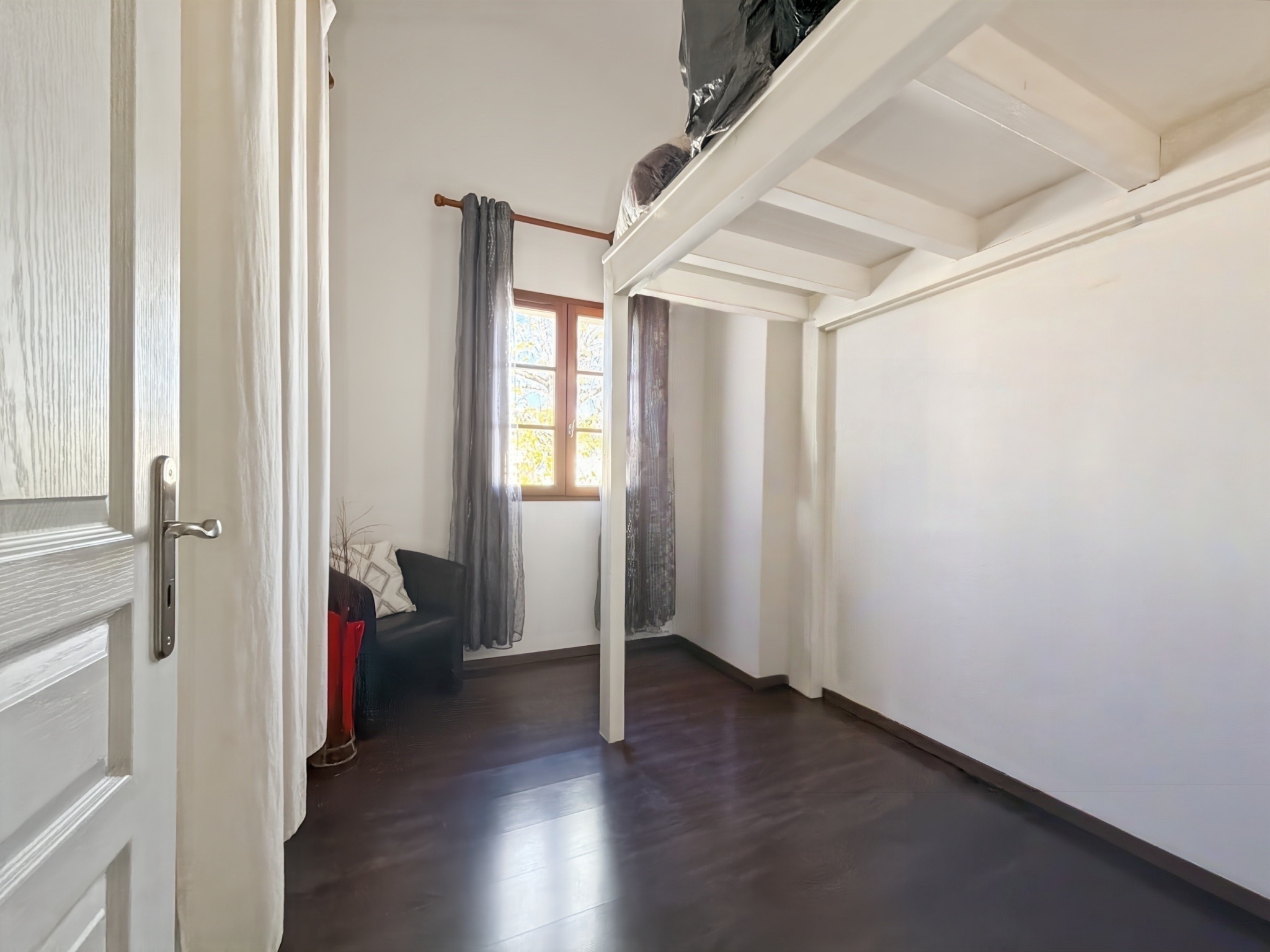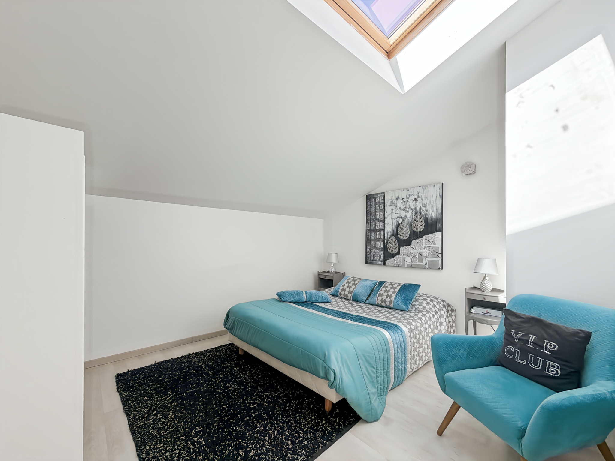 À l’étage, l’espace nuit se compose de deux chambres confortables, ainsi que d’une 3e chambre légèrement plus petite mais équipé d'une mezzanine qui vient compléter cet espace. Une salle d’eau fonctionnelle complète ce niveau.