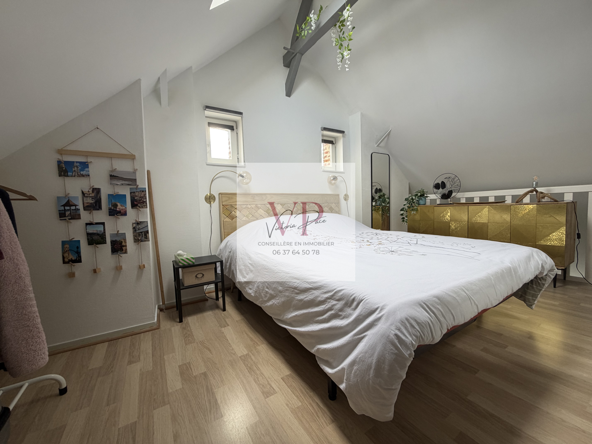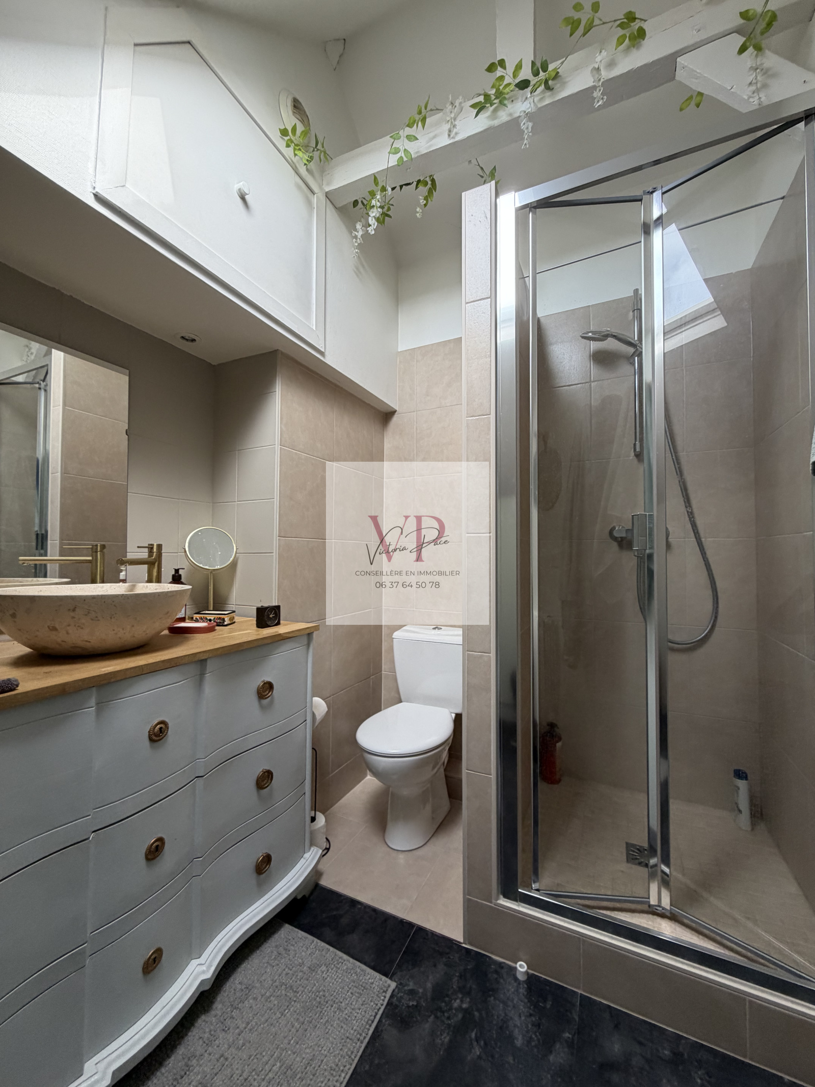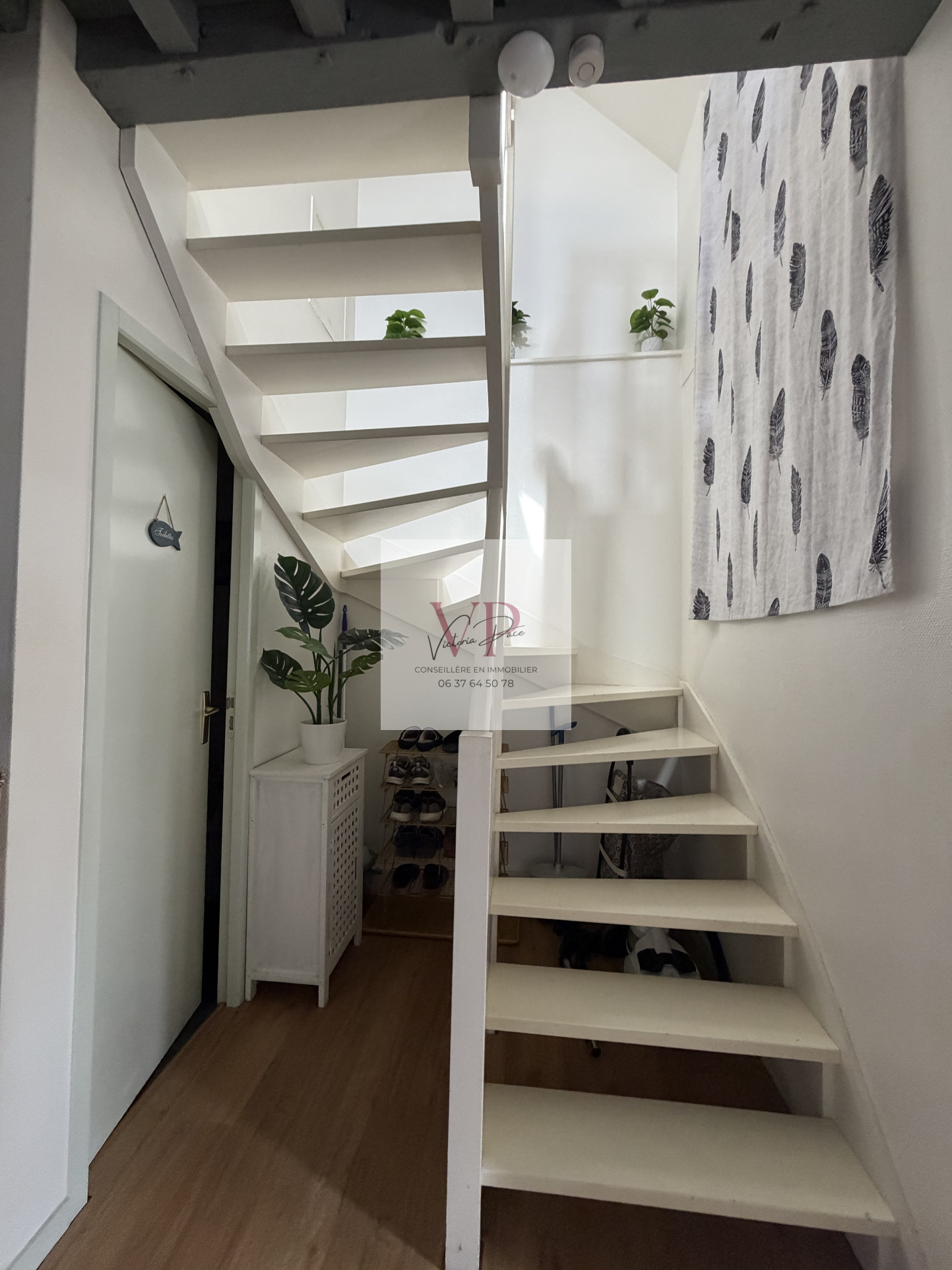 L’appartement se compose d’une pièce de vie lumineuse et traversante avec cuisine ouverte et cheminée décorative, ainsi qu’un WC. À l’étage, vous trouverez une chambre avec rangements et une salle d’eau avec douche et un second WC.