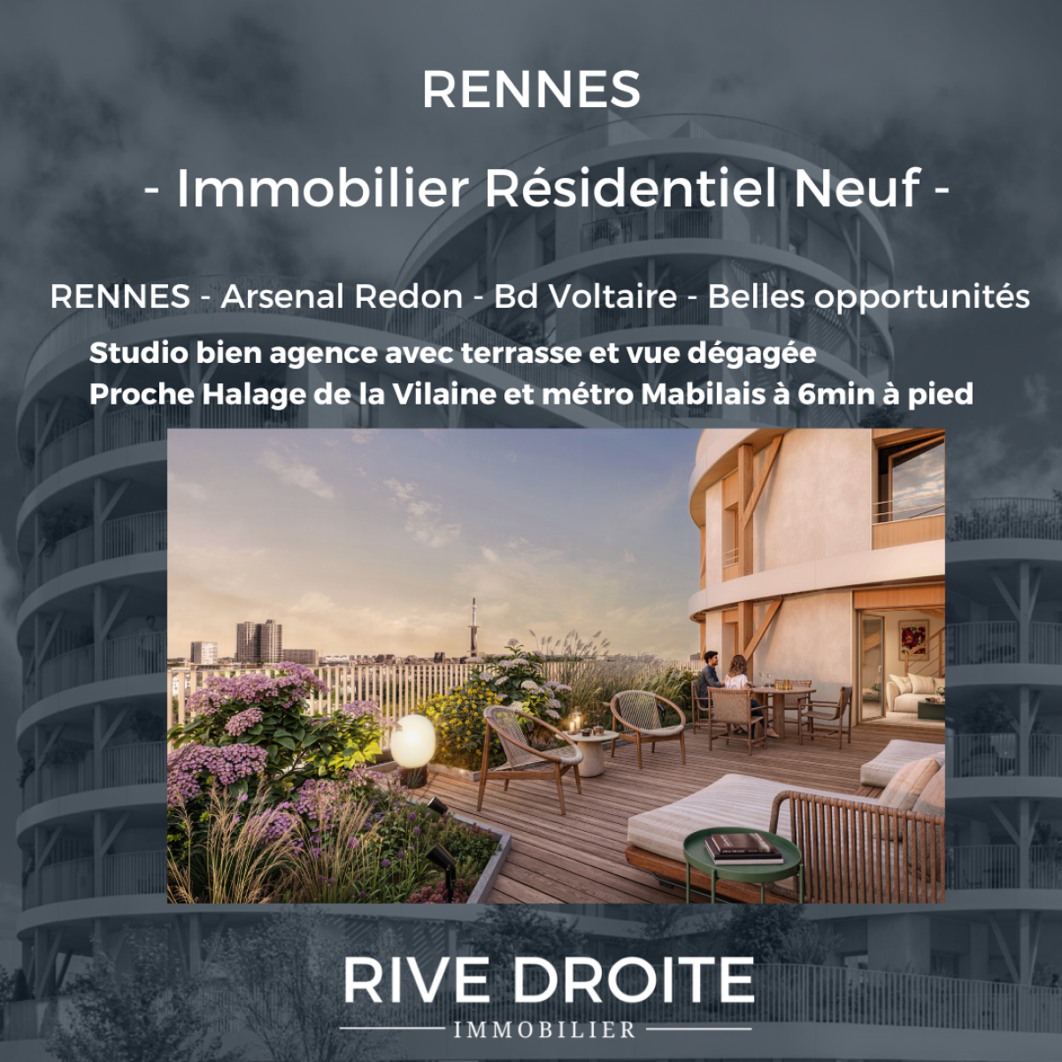 RIVE DROITE vous propose : OPPORTUNITE A NE PAS MANQUER - RENNES Bd Voltaire - Emplacement idéal à 750m du halage et des bords de Vilaine pour de belles ballades, du métro Anatole France à 6min à pied, découvrez cette belle résidence à l'architecture très moderne. Découvrez sans tarder ce SUPERBE STUDIO avec TERRASSE et BELLES VUES DEGAGEES - INVESTISSEMENT DE QUALITE - IDEAL pour LOCATIF PATRIMONIAL - FRAIS DE NOTAIRE REDUITS - DISPO 2028 - RARE SUR LE MARCHE - RESERVEZ LE DES MAINTENANT !Â
